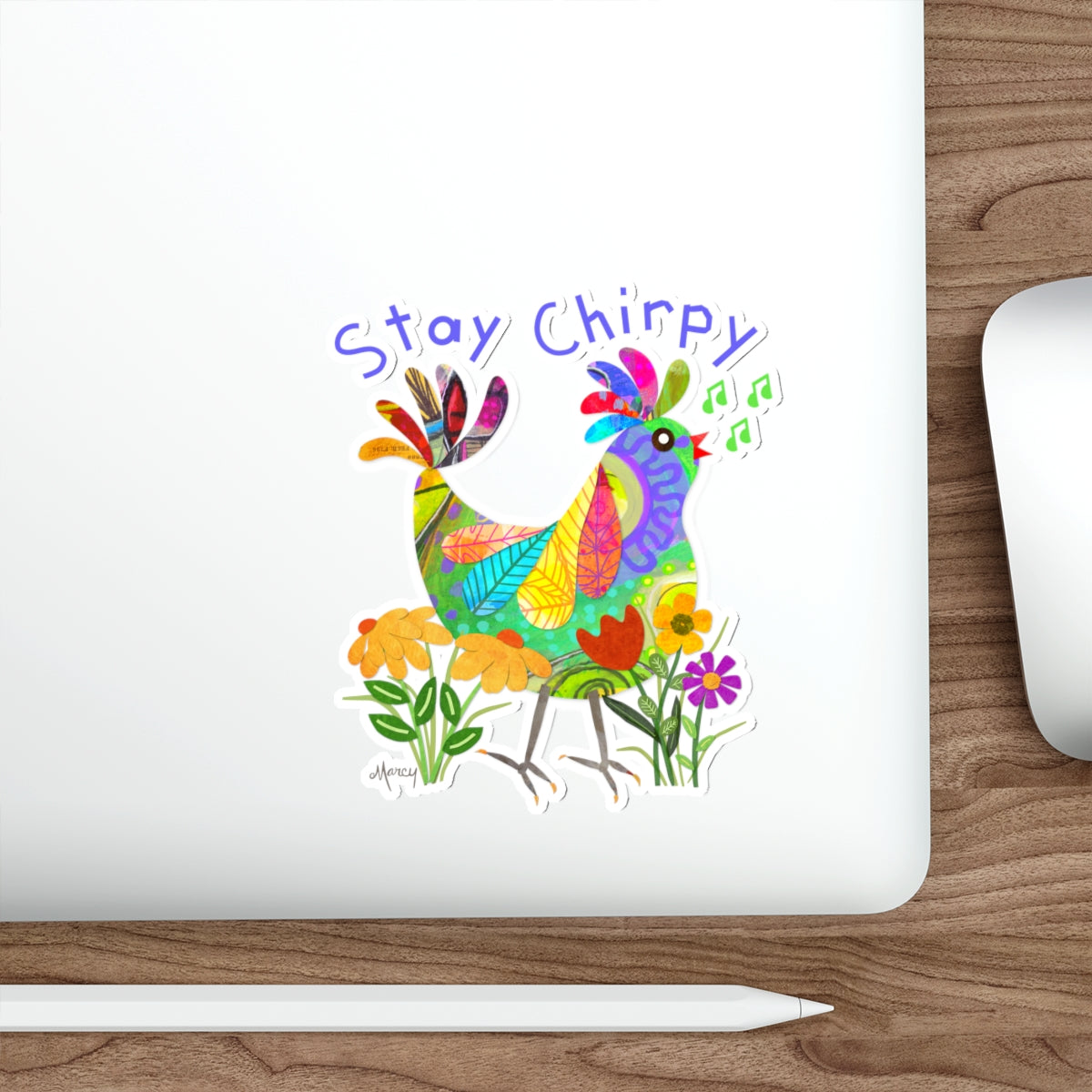 Add a pop of personality to your favorite surfaces with the Kooky Bird Collage die-cut sticker! 🐦💛 This vibrant, high-quality sticker features a plump bird with colorful wings, tail, and head feathers, standing among delicate flowers. Above, the hand-lettered quote “Stay Chirpy” and floating music notes add an uplifting, whimsical touch. Perfect for decorating laptops, water bottles, journals, scrapbooks, or anywhere you want a little extra cheer.