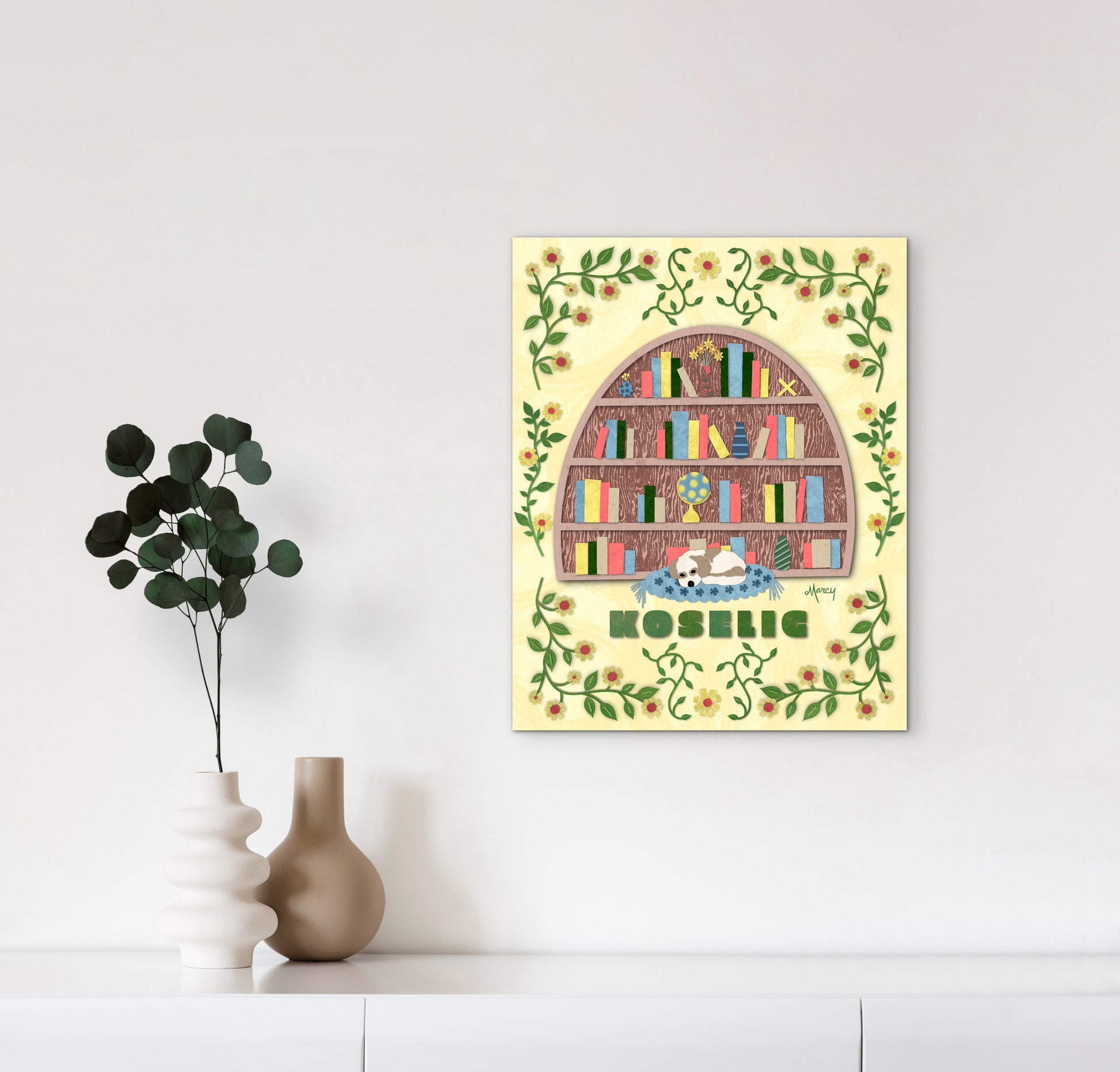This inviting illustration captures the true feeling of koselig—that sense of coziness, intimacy, and contentment that makes a space feel like home. An arched bookcase brimming with books, delicate vases of tiny flowers, a vintage globe, and a cheerful yellow metal “X” creates a softly styled backdrop full of character and warmth. Curled peacefully in front is an adorable white and caramel spotted Maltipoo, resting on a blue floral cushion—adding a tender, heart-melting touch.