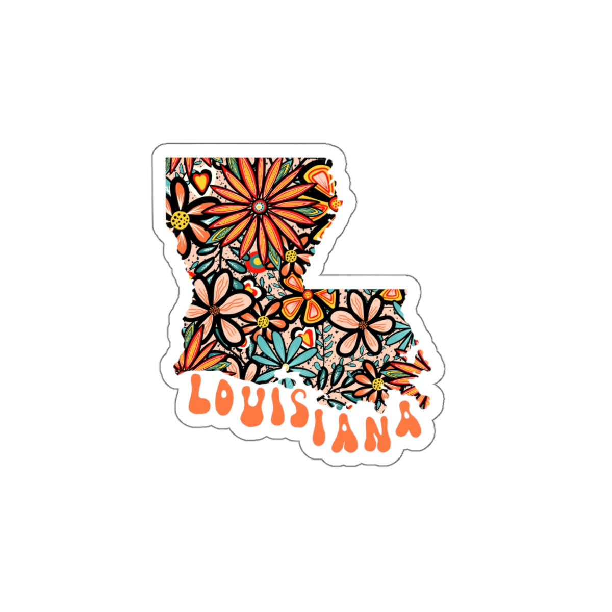 Louisiana State Sticker | Vinyl Artist Designed Illustration Featuring Louisiana State Outline Filled With Retro Flowers with Retro Hand-Lettering Die-Cut Stickers