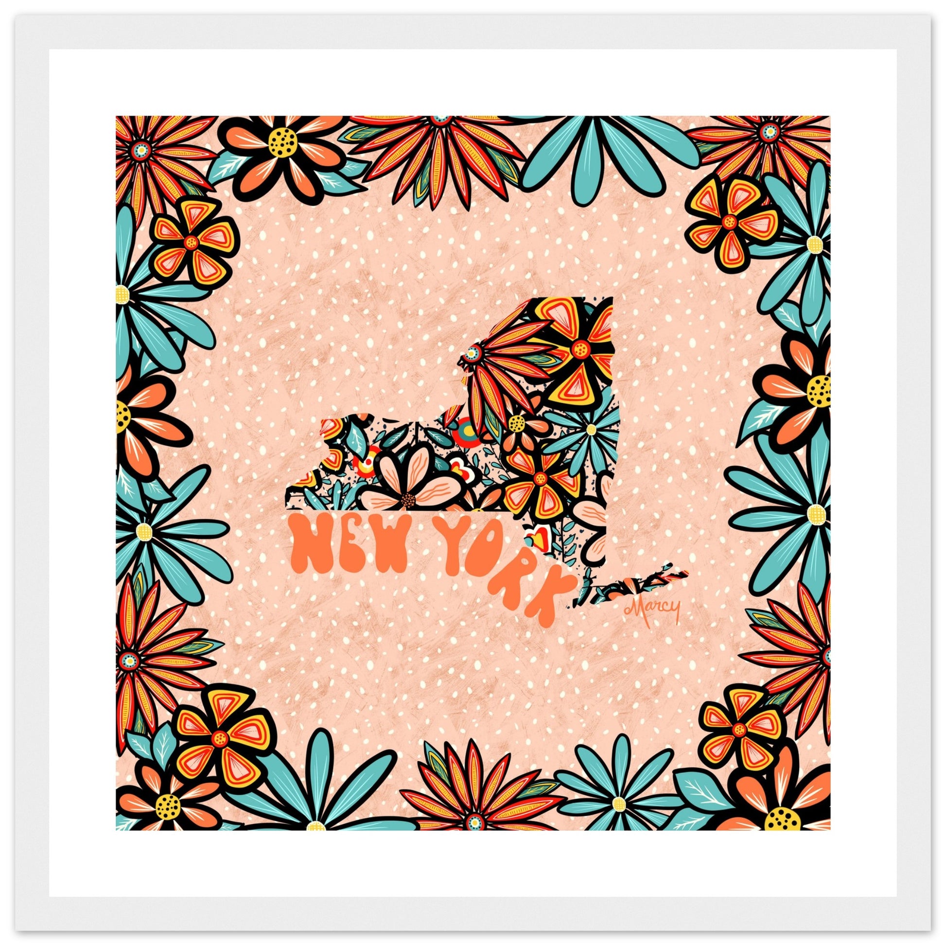 This New York state design features an original illustration created by designer Marcy Brennan Art. The illustration employs a 70’s retro ‘flower power’ pattern and color palette with playful 70’s inspired hand-lettering spelling out ‘New York’ in orange. The design is set on a peach background. The perfect gift for a New Yorkers.