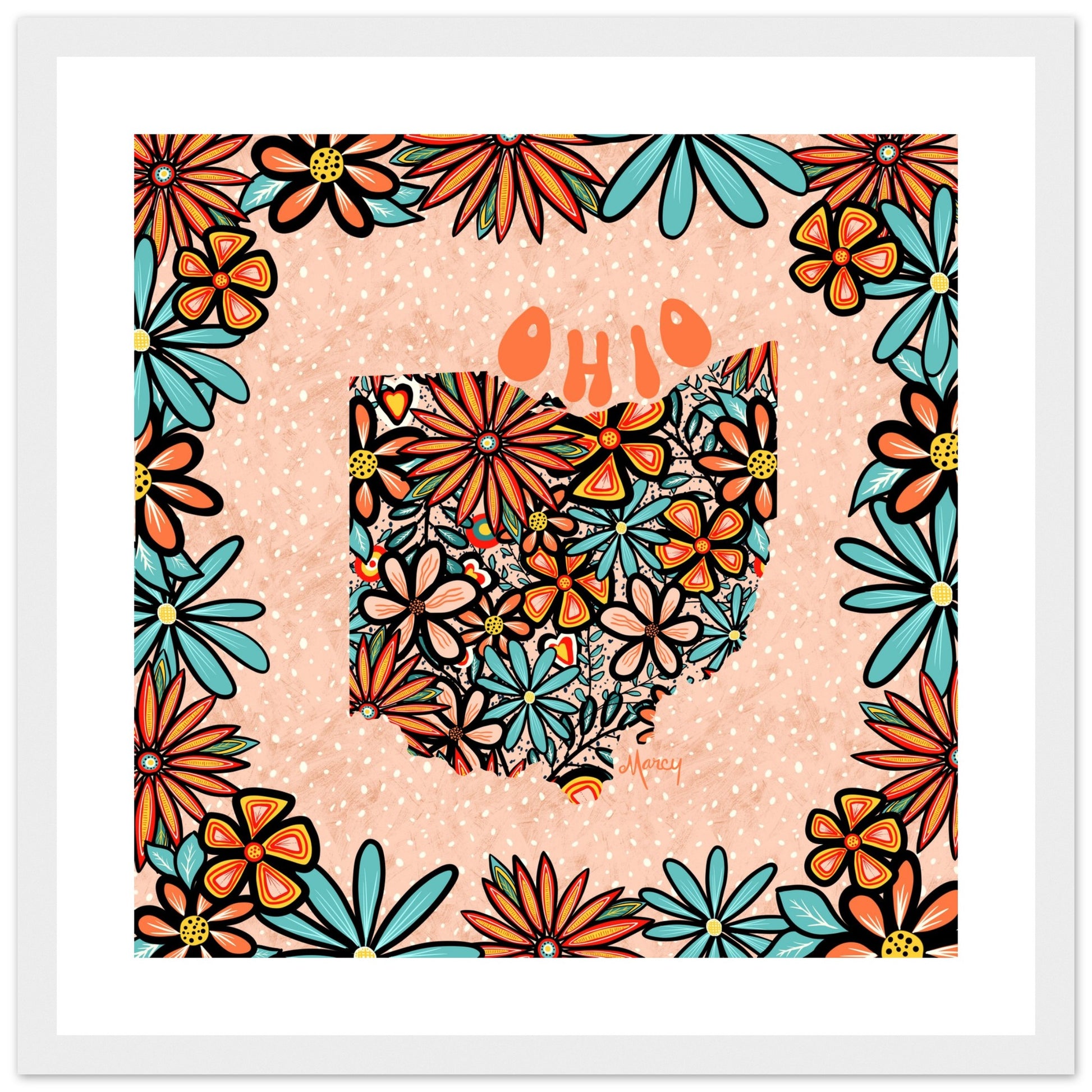 This Ohio state design features an original illustration created by designer Marcy Brennan Art. The illustration employs a 70’s retro ‘flower power’ pattern and color palette with playful 70’s inspired hand-lettering spelling out ‘Ohio’ in orange. The design is set on a peach background. The perfect gift for a Ohioans.