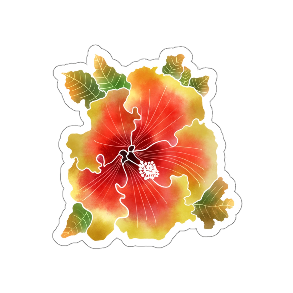 Introducing a stunning die-cut sticker featuring a batik-style painting of a Palm Springs orange and yellow ruffled hibiscus flower and lush green leaves. This unique sticker captures the beauty of nature with intricate details and a touch of exotic charm. Perfect for adding a pop of color and elegance to any surface, from laptops to water bottles and beyond.