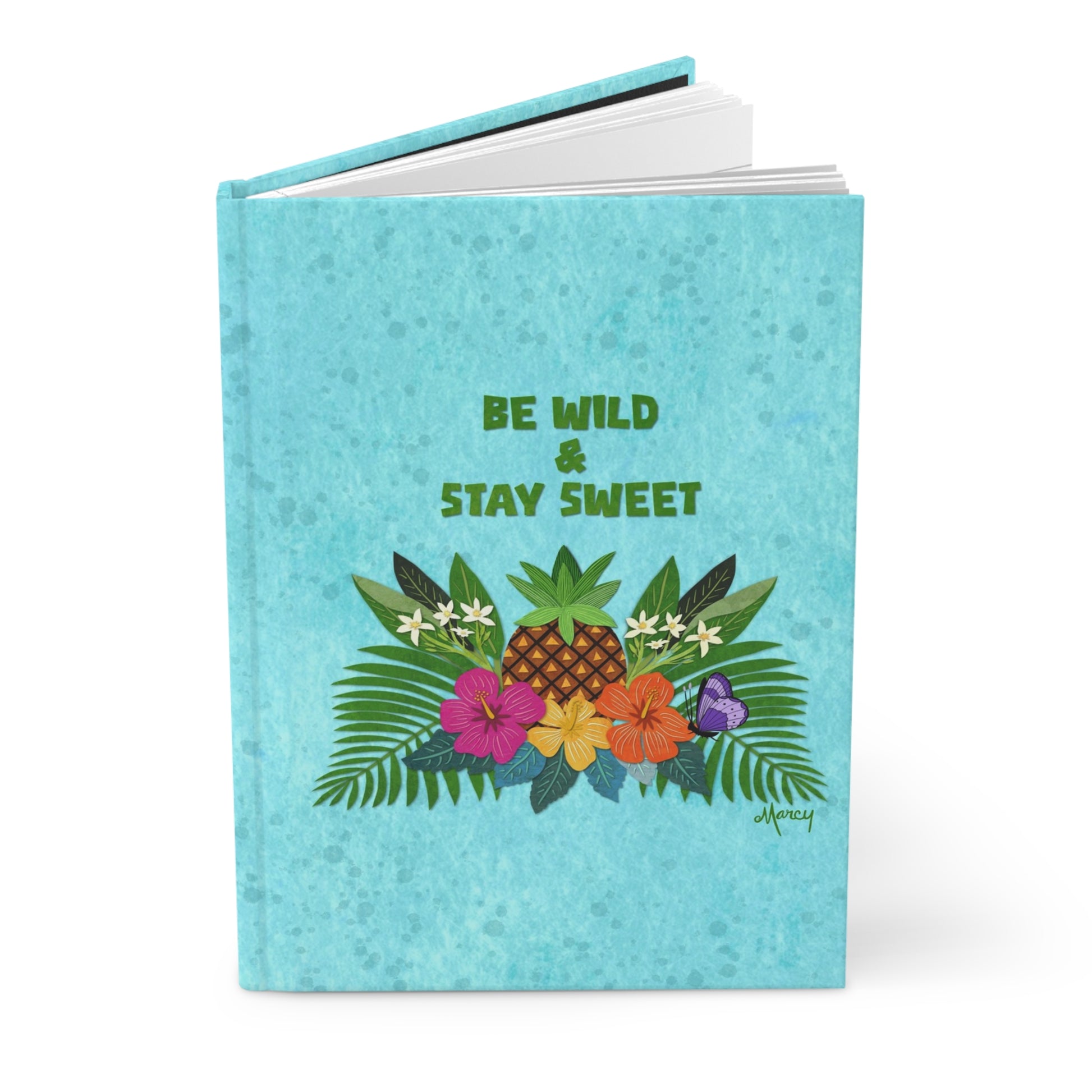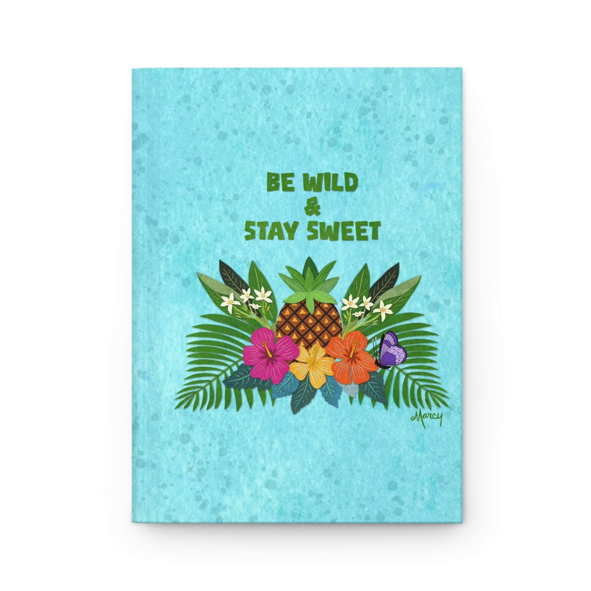 Capture your thoughts, dreams, and to-do lists in this vibrant hardcover journal featuring my tropical collage design, “Be Wild & Be Sweet.” At the center of the design is a textured paper-style pineapple surrounded by white plumerias, cheerful hibiscus blooms in pink, yellow, and orange, and lush palm fronds—all layered against a softly splattered aqua textured background.
