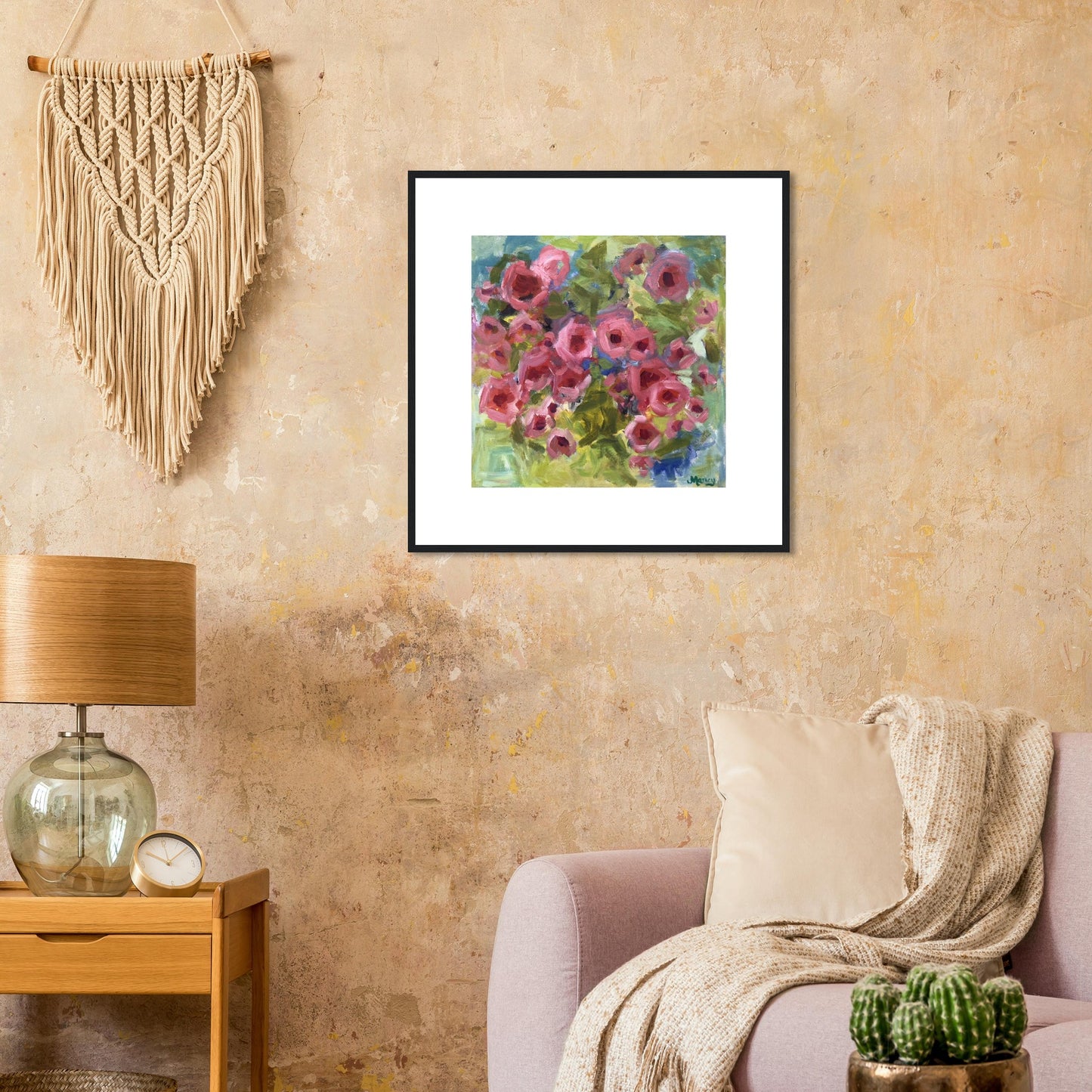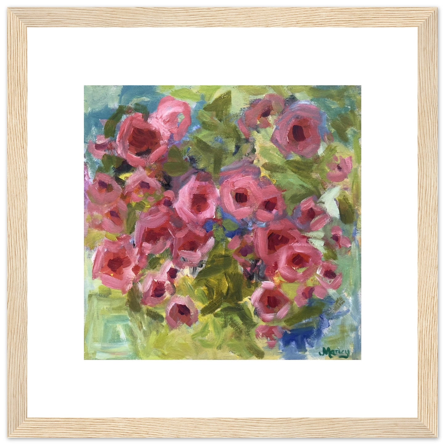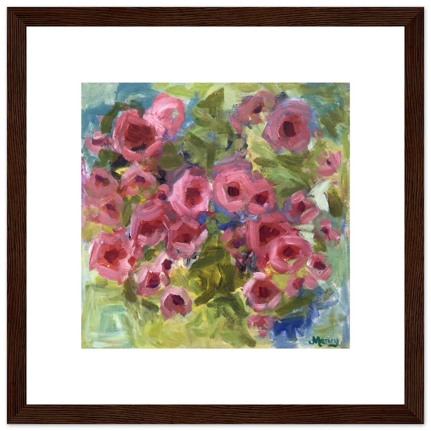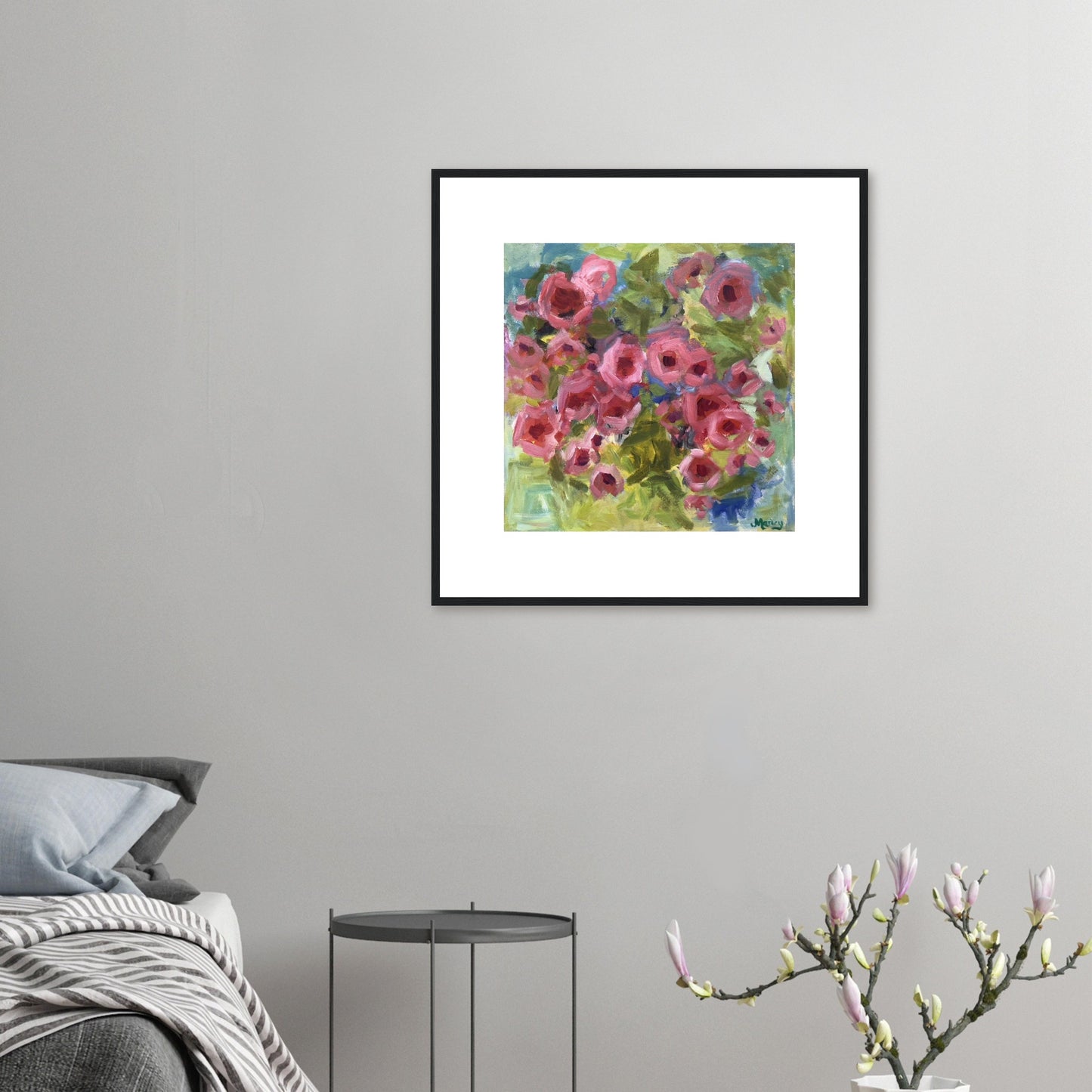 Introducing a captivating wood-framed premium matte print showcasing pink impressionist roses. This artwork captures the essence of delicate petals in soft, blurred strokes, conveying a sense of romance and nostalgia. The gentle interplay of light and color imbues the piece with a timeless elegance, making it a perfect addition to any sophisticated interior.