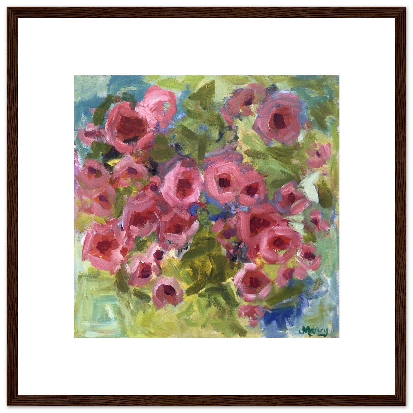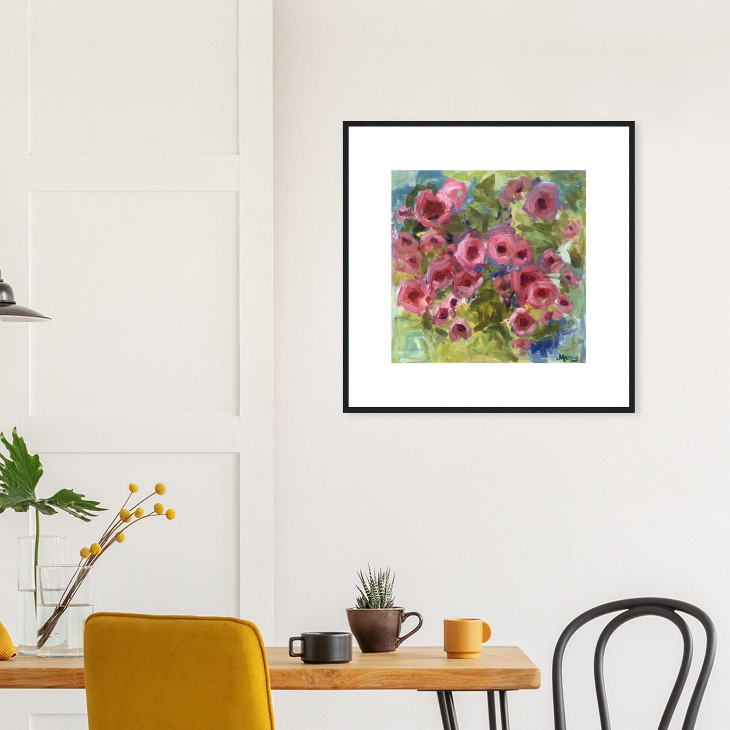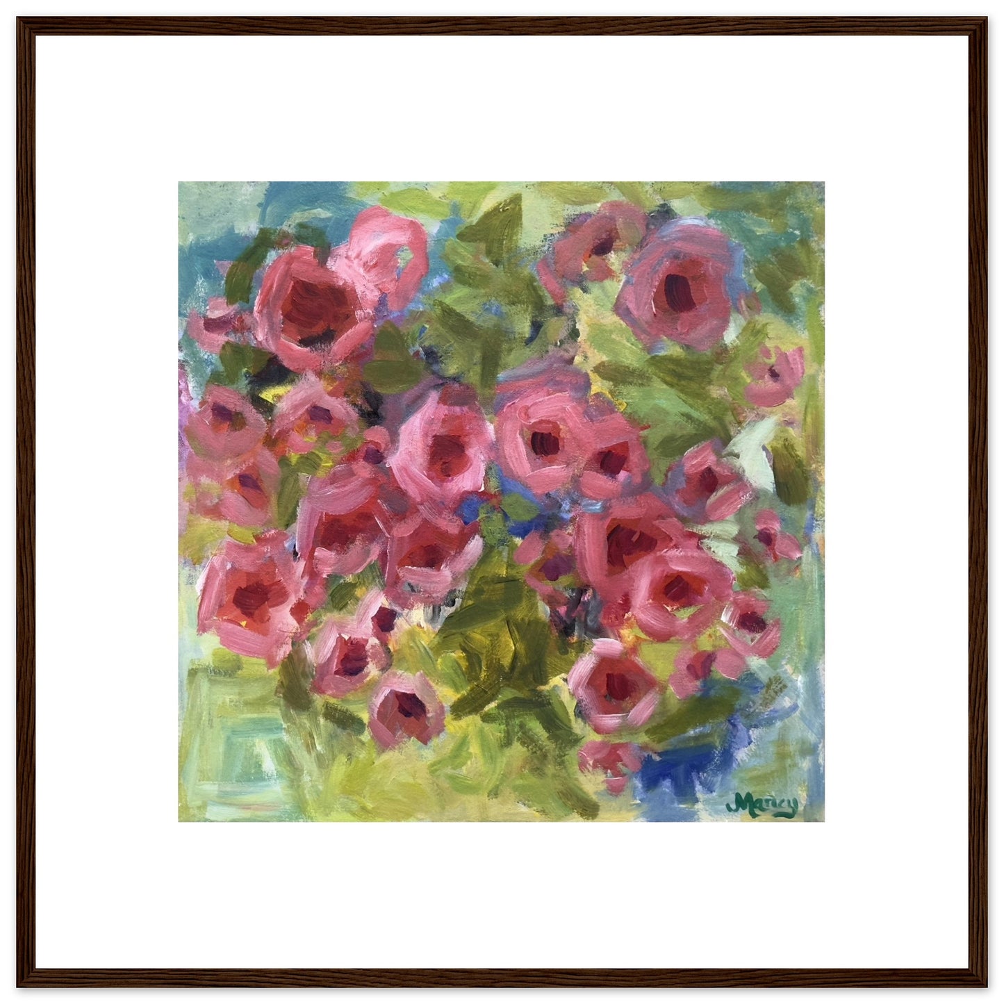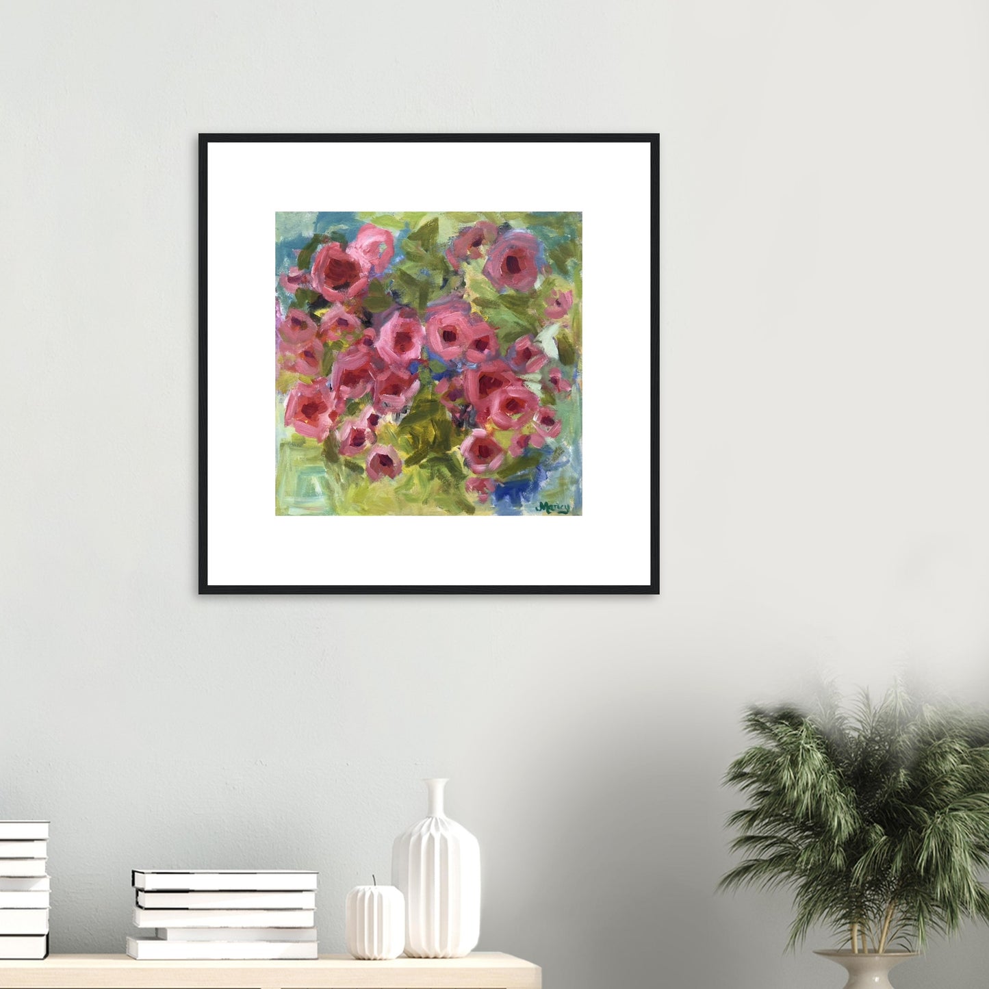 Introducing a captivating wood-framed premium matte print showcasing pink impressionist roses. This artwork captures the essence of delicate petals in soft, blurred strokes, conveying a sense of romance and nostalgia. The gentle interplay of light and color imbues the piece with a timeless elegance, making it a perfect addition to any sophisticated interior.