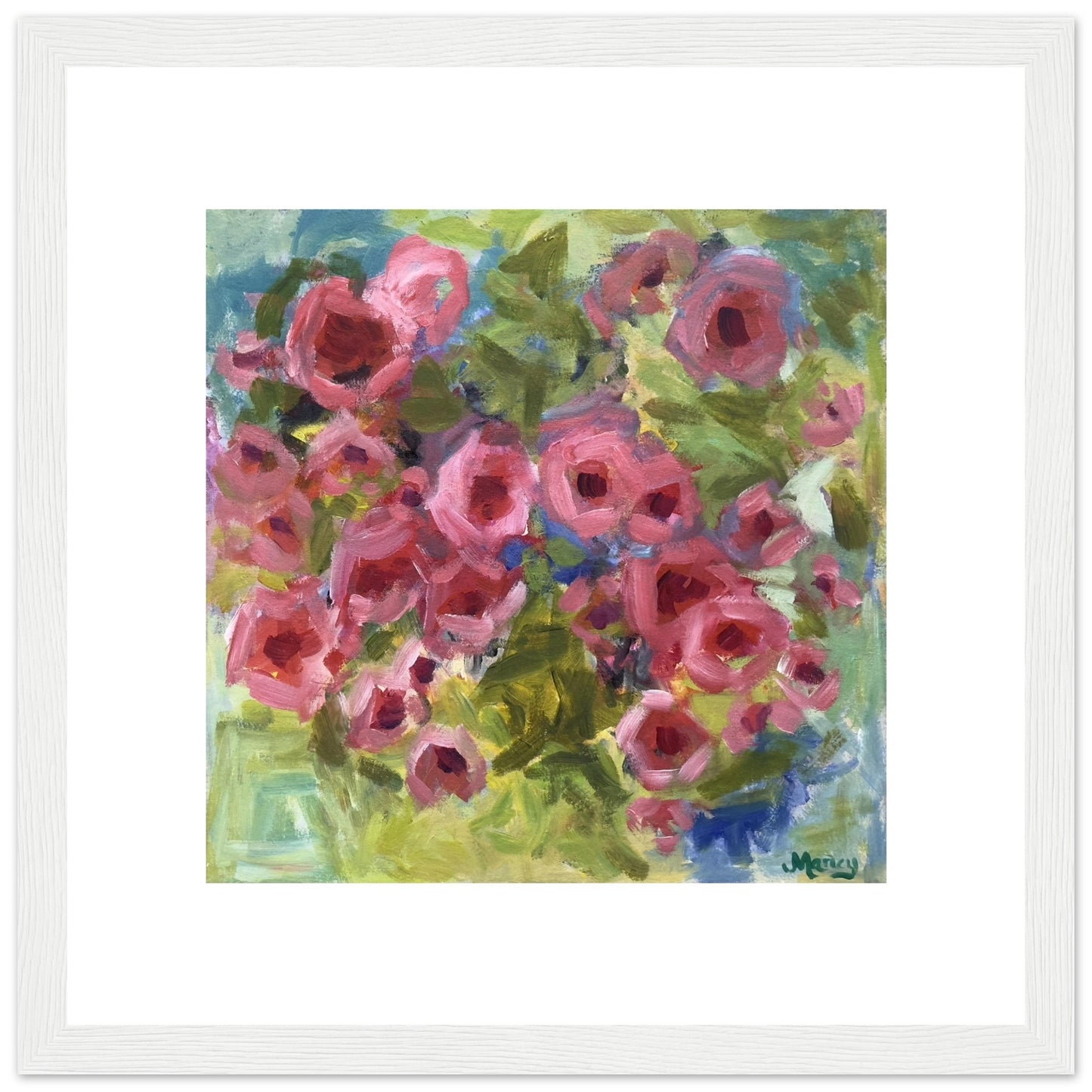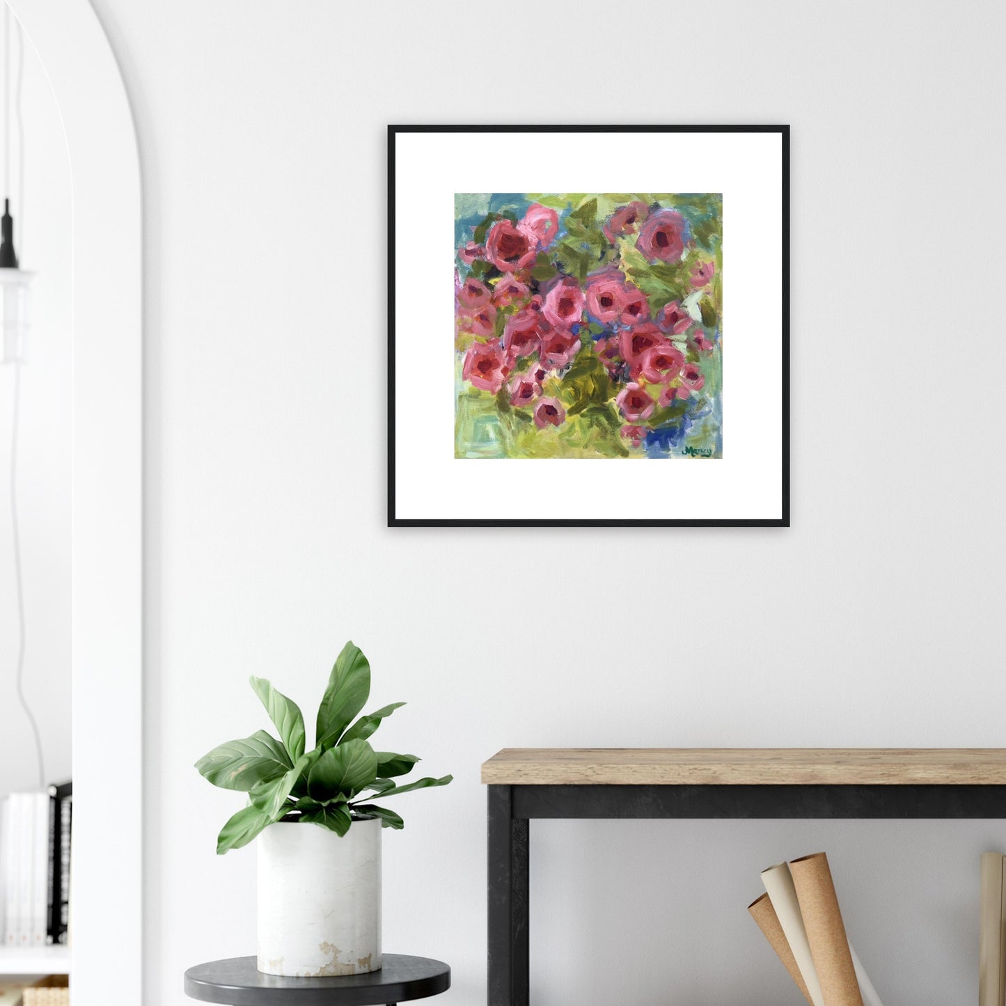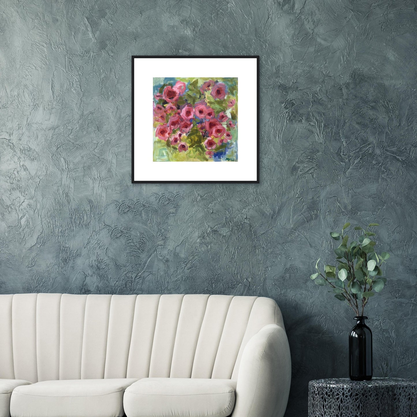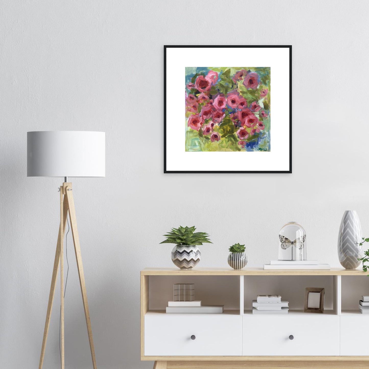 Introducing a captivating wood-framed premium matte print showcasing pink impressionist roses. This artwork captures the essence of delicate petals in soft, blurred strokes, conveying a sense of romance and nostalgia. The gentle interplay of light and color imbues the piece with a timeless elegance, making it a perfect addition to any sophisticated interior.