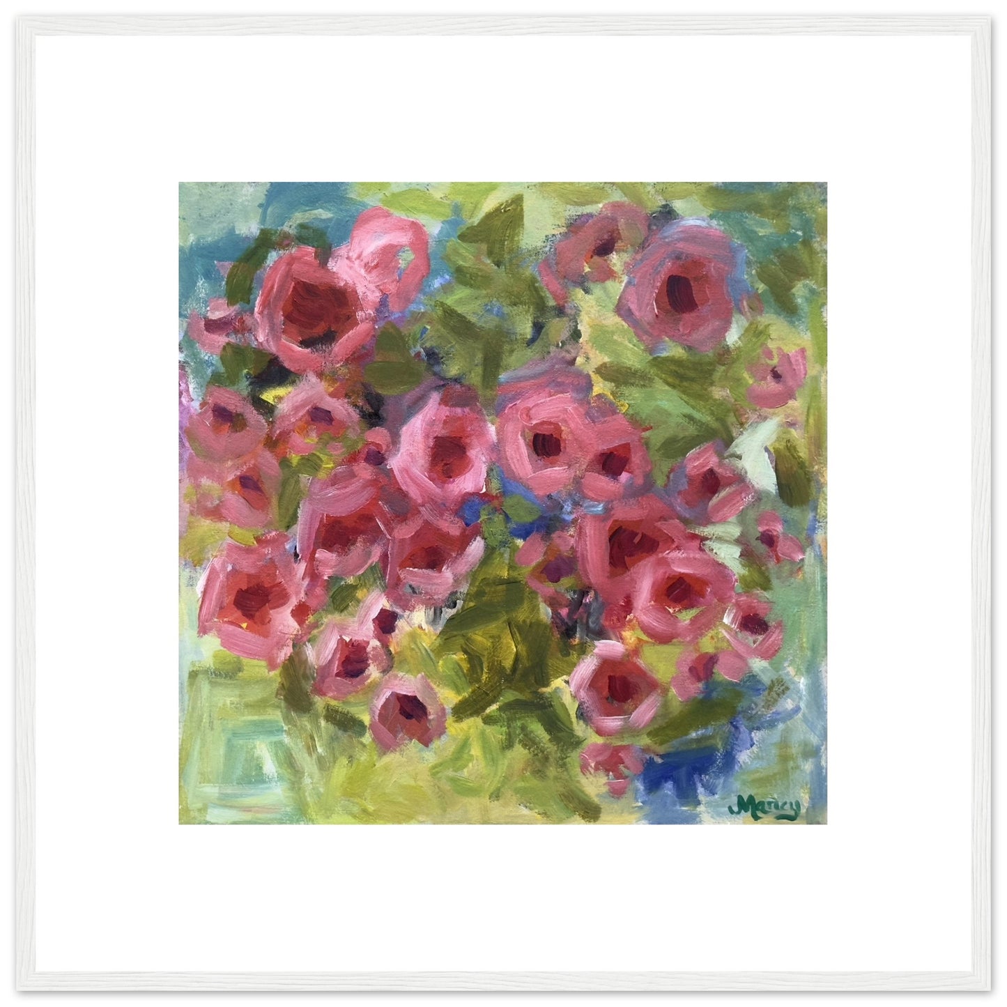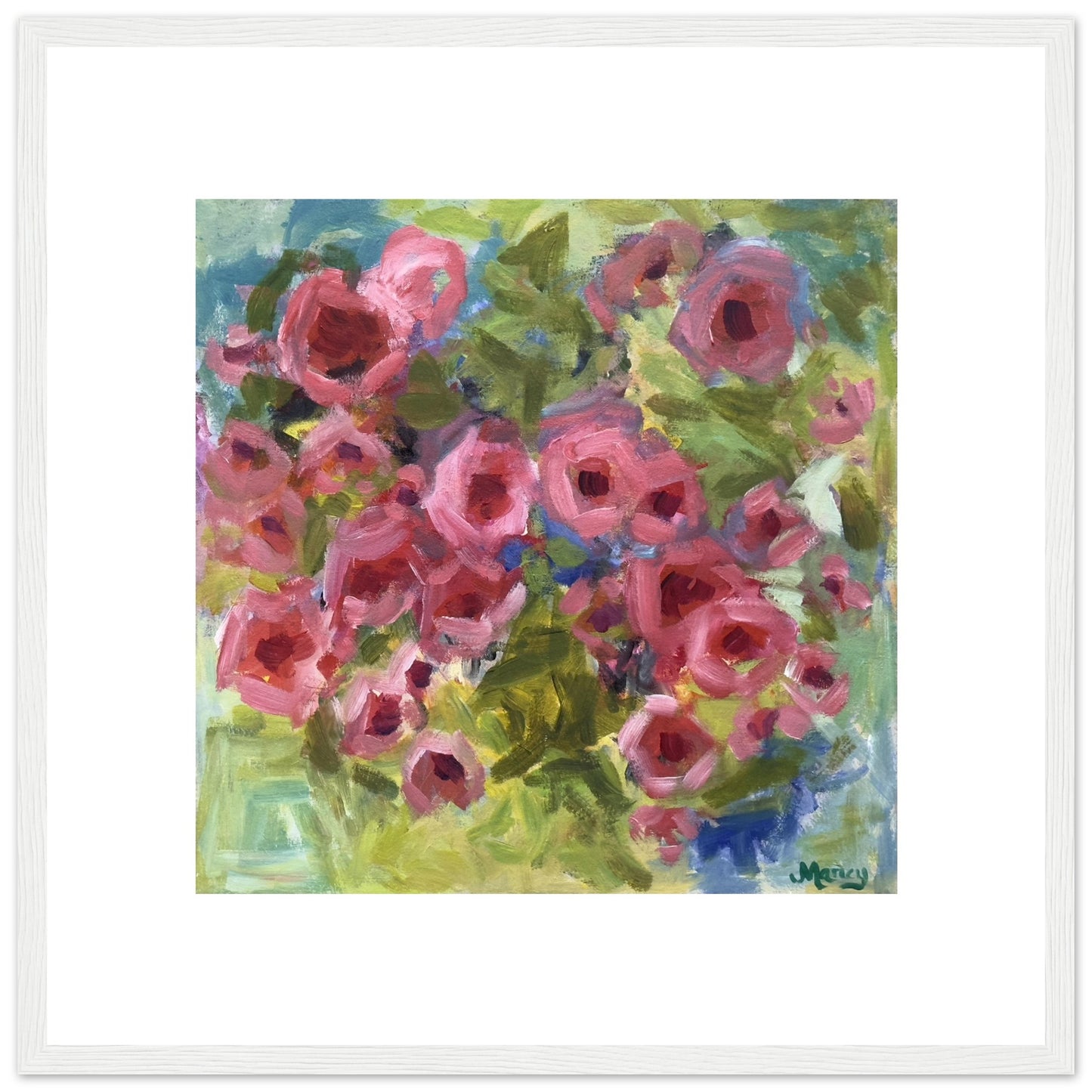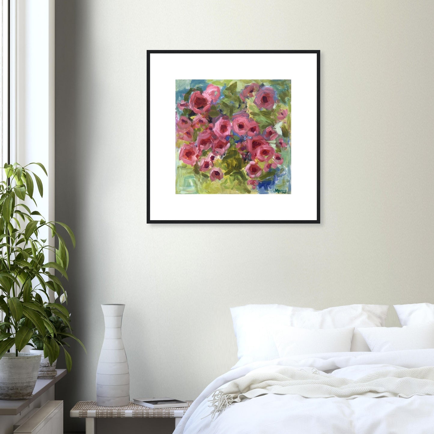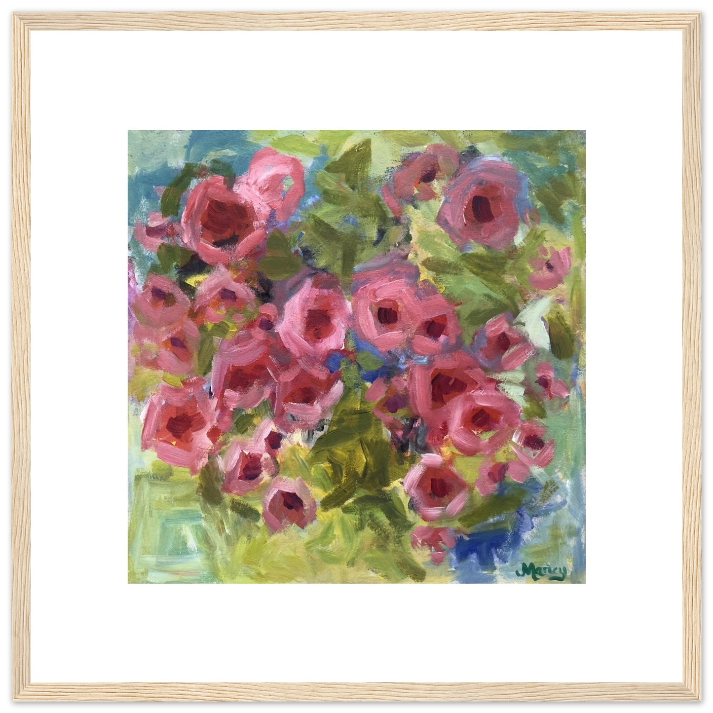 Introducing a captivating wood-framed premium matte print showcasing pink impressionist roses. This artwork captures the essence of delicate petals in soft, blurred strokes, conveying a sense of romance and nostalgia. The gentle interplay of light and color imbues the piece with a timeless elegance, making it a perfect addition to any sophisticated interior.