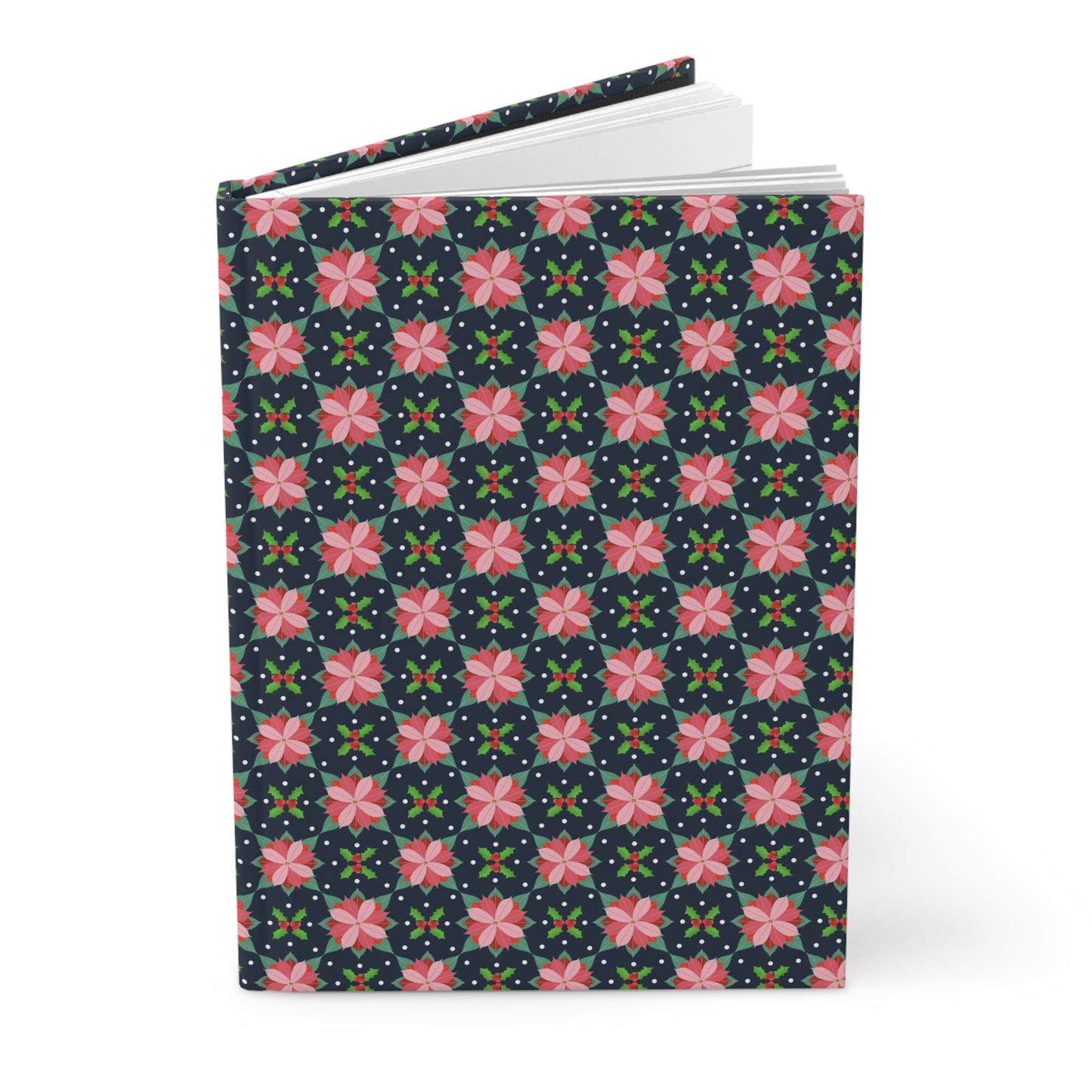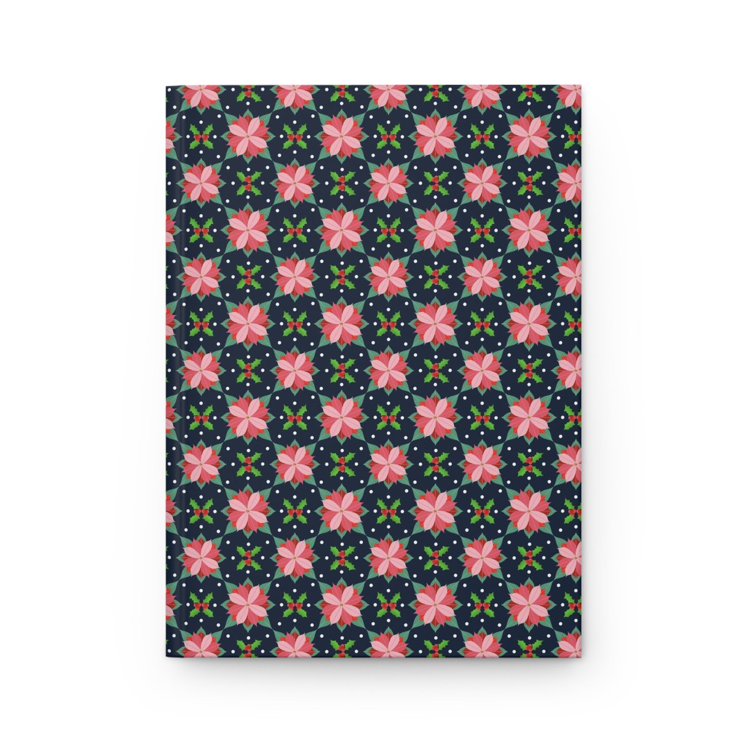 Introducing our newest hardcover matte journal, featuring a stunning geometric design of pink poinsettias and holly and berries, offset from each other to create a beautiful contrast. This exquisite design is set against a deep blue background with tiny white dots, making it a perfect addition to any collection. The journal is made with high-quality materials, ensuring durability and longevity. The journal is lightweight and compact, making it easy to carry around with you wherever you go. It is perfect for personal use or as a gift for a loved one.