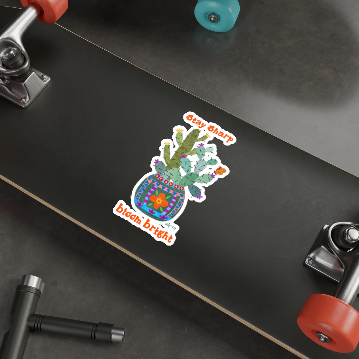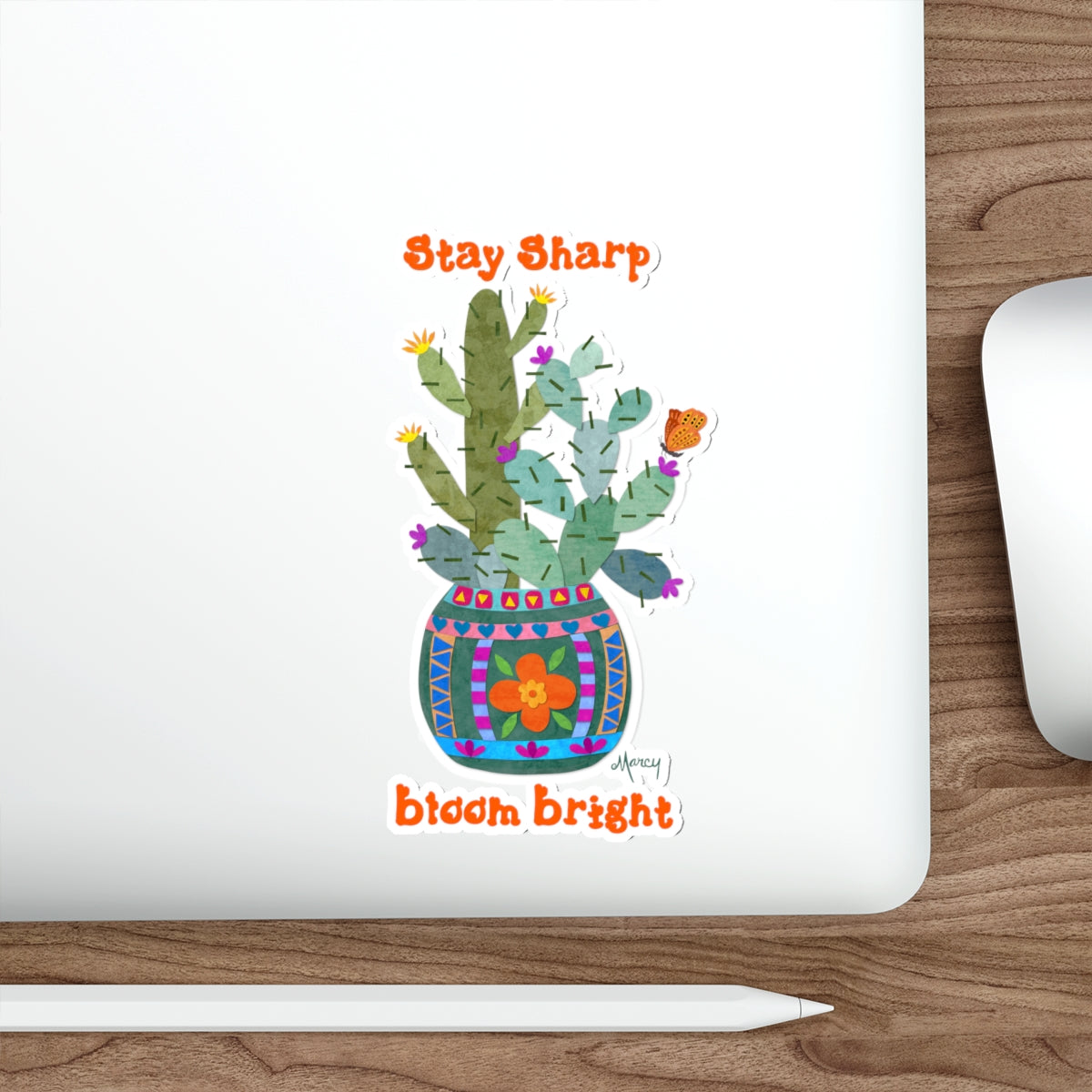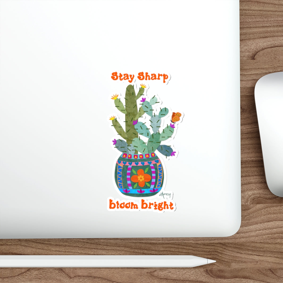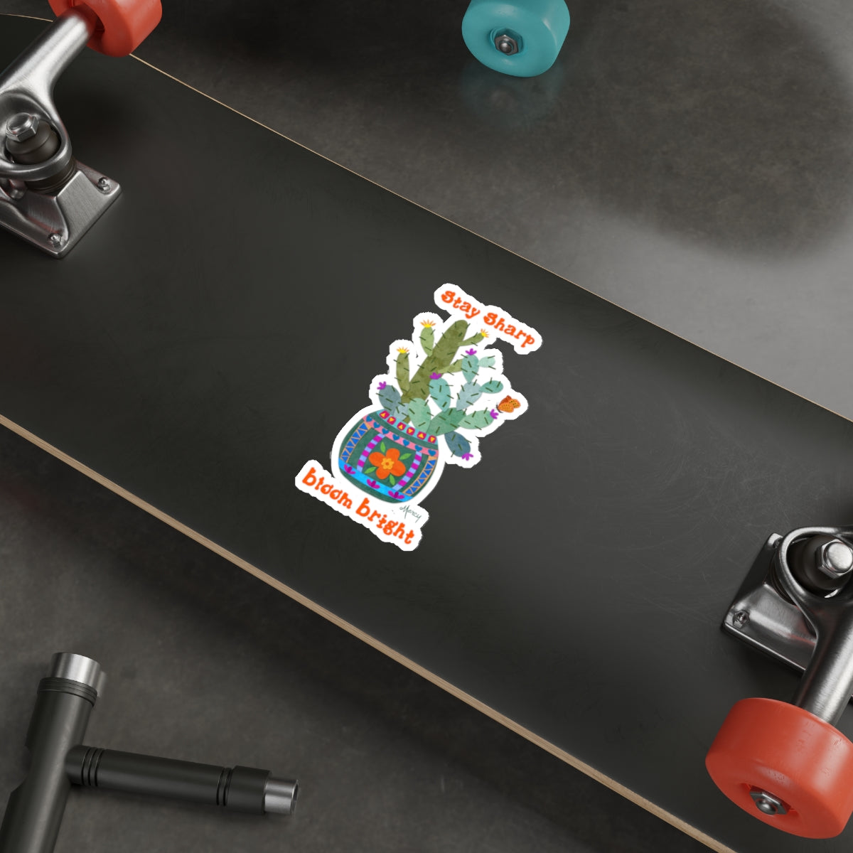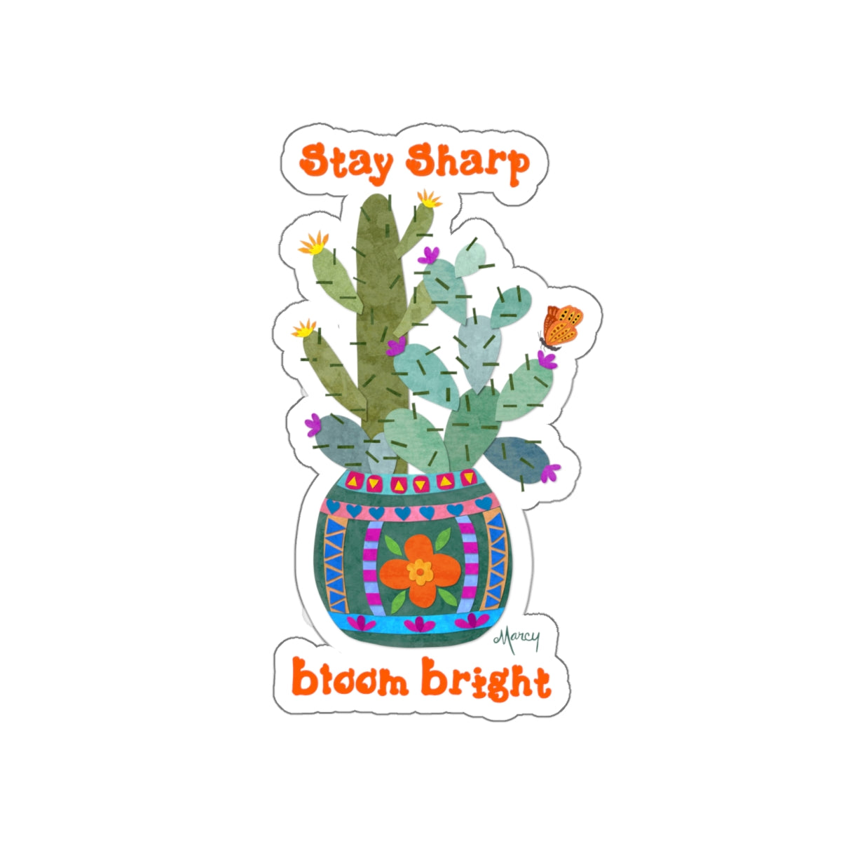 Bring a pop of desert charm wherever you go with this die-cut sticker featuring The Potted Cactus Collage. Designed in a vibrant digital paper cut style, this cheerful artwork includes a saguaro and prickly pear cactus in colorful decorative pots, both in full bloom. Bold cactus-style lettering spells out the uplifting message: “Stay Sharp, Bloom Bright”—a perfect reminder to grow strong and shine boldly. Set against a soft textured sage green background, this sticker is ideal for laptops, water bottles, journals, and anywhere you want to add a touch of encouragement and color.
