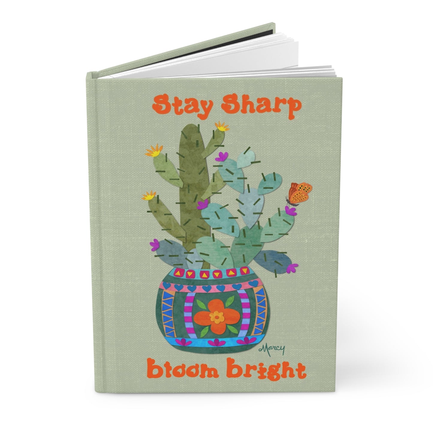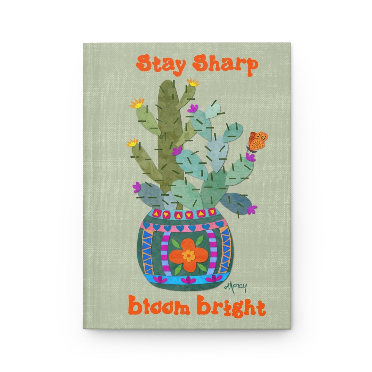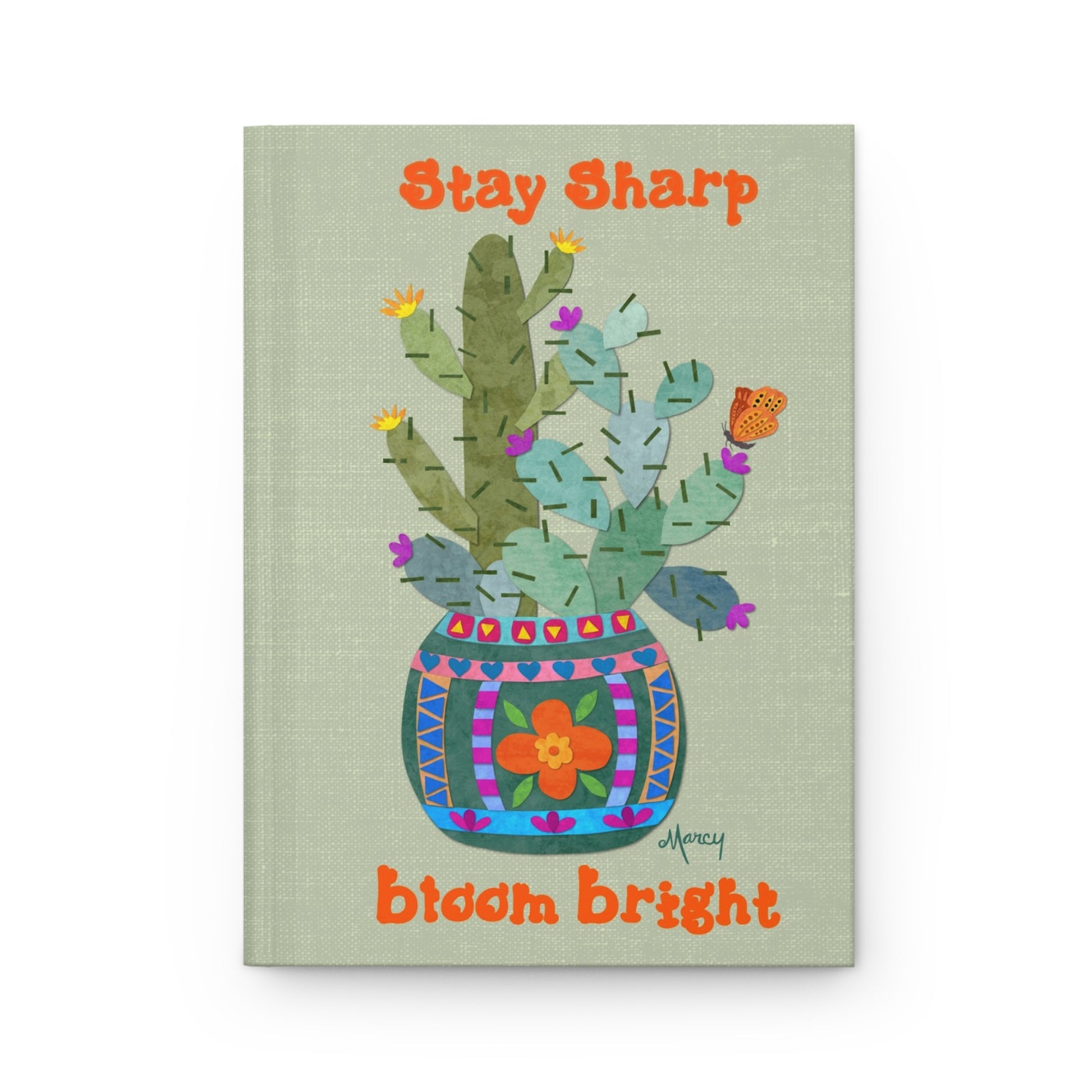 Let your thoughts grow wild with The Potted Cactus Collage hardcover matte journal. This charming digital paper cut design features a blooming saguaro and prickly pear cactus in vibrant ceramic pots, framed by playful cactus-style lettering that reads: “Stay Sharp, Bloom Bright.” Set against a soothing pale sage green textured background, this journal is a delightful reminder to keep blooming—one page at a time. With a durable hardcover and matte finish, it’s perfect for journaling, list-making, sketching, or prayer journaling.