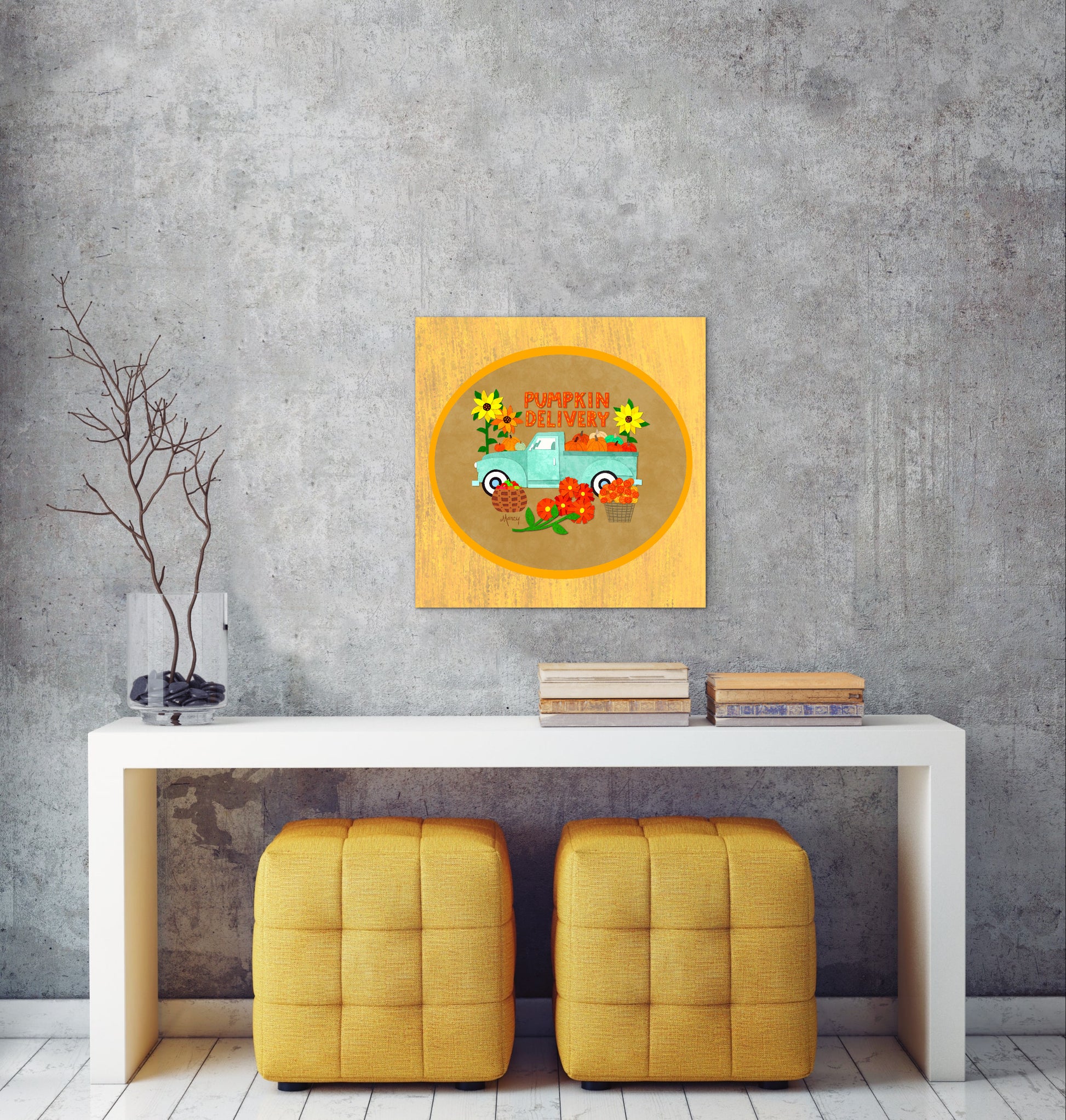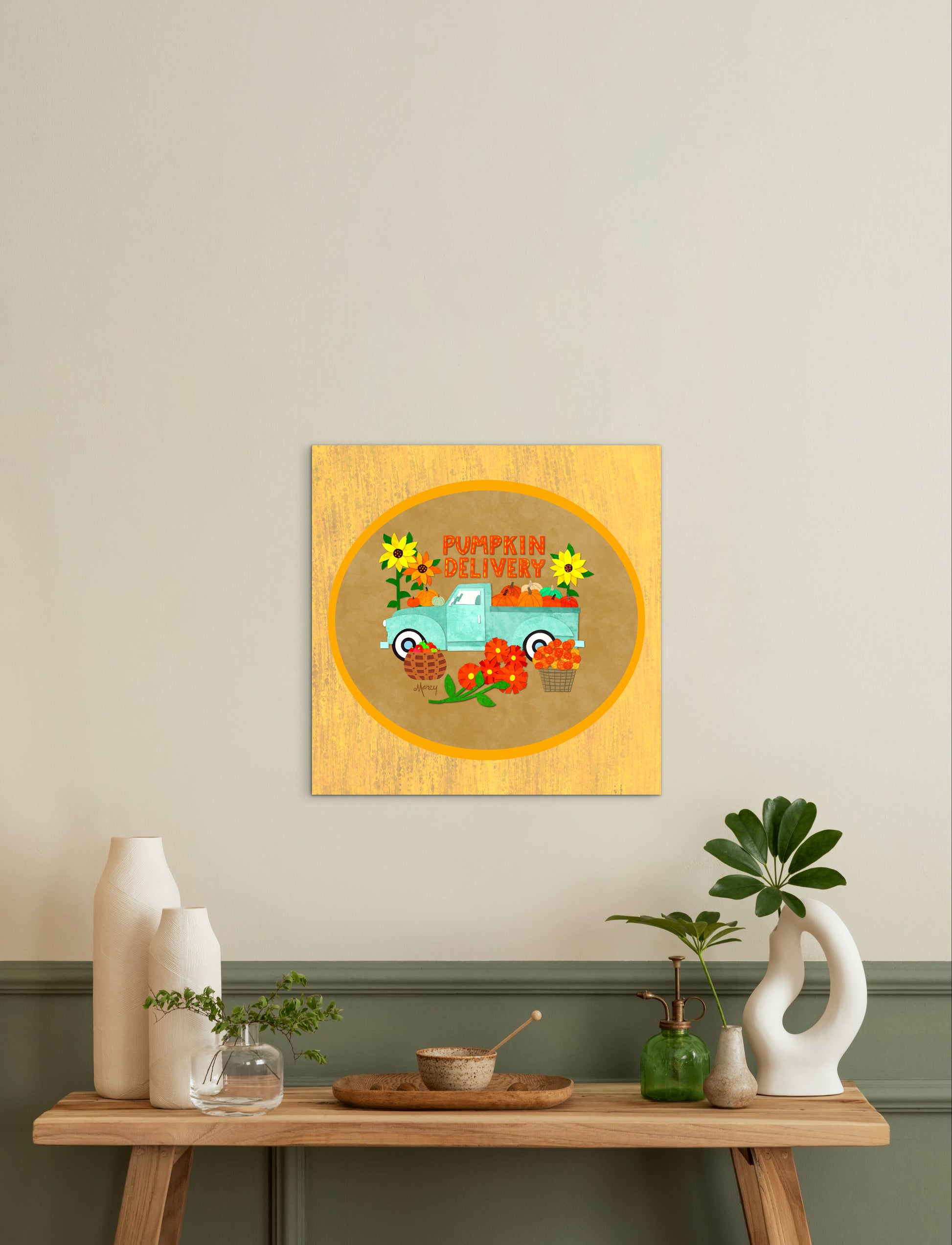 Bring the warmth of the harvest season into your home with this premium matte paper poster featuring my original illustration, “Pumpkin Delivery.” The artwork showcases an aqua vintage truck brimming with pumpkins, framed by tall golden sunflowers. In front, a basket of apples, a basket of orange and gold mums, and a bouquet of bold red zinnias complete the cozy harvest display. Above the truck, cheerful orange hand-lettered words spell out Pumpkin Delivery, all set against a glowing gold textured background. Printed on premium matte paper and framed in natural wood, this piece is ready to hang and perfect for adding farmhouse fall charm to any room.