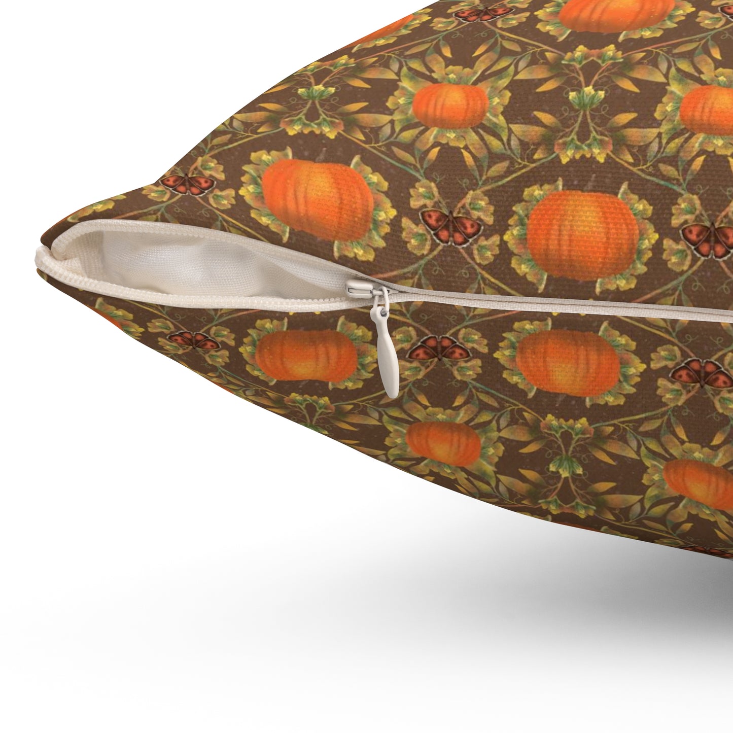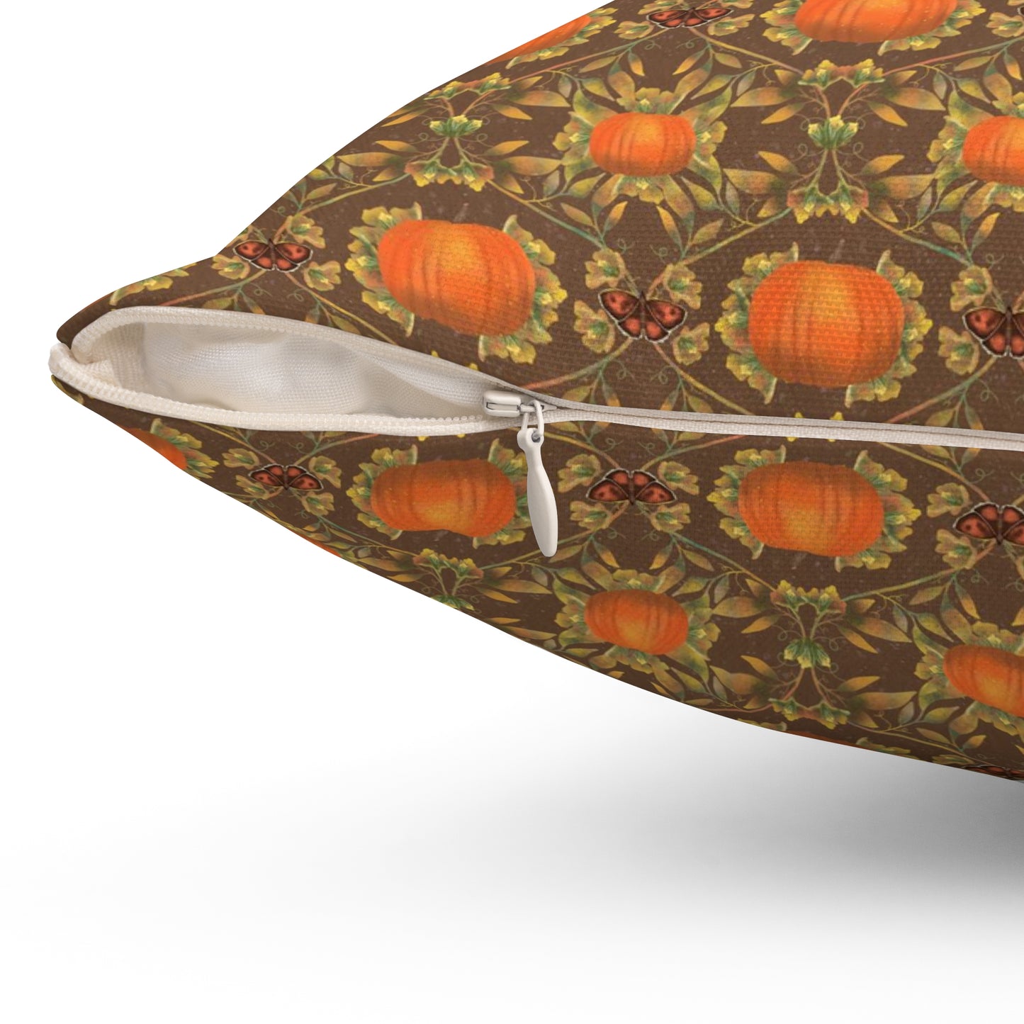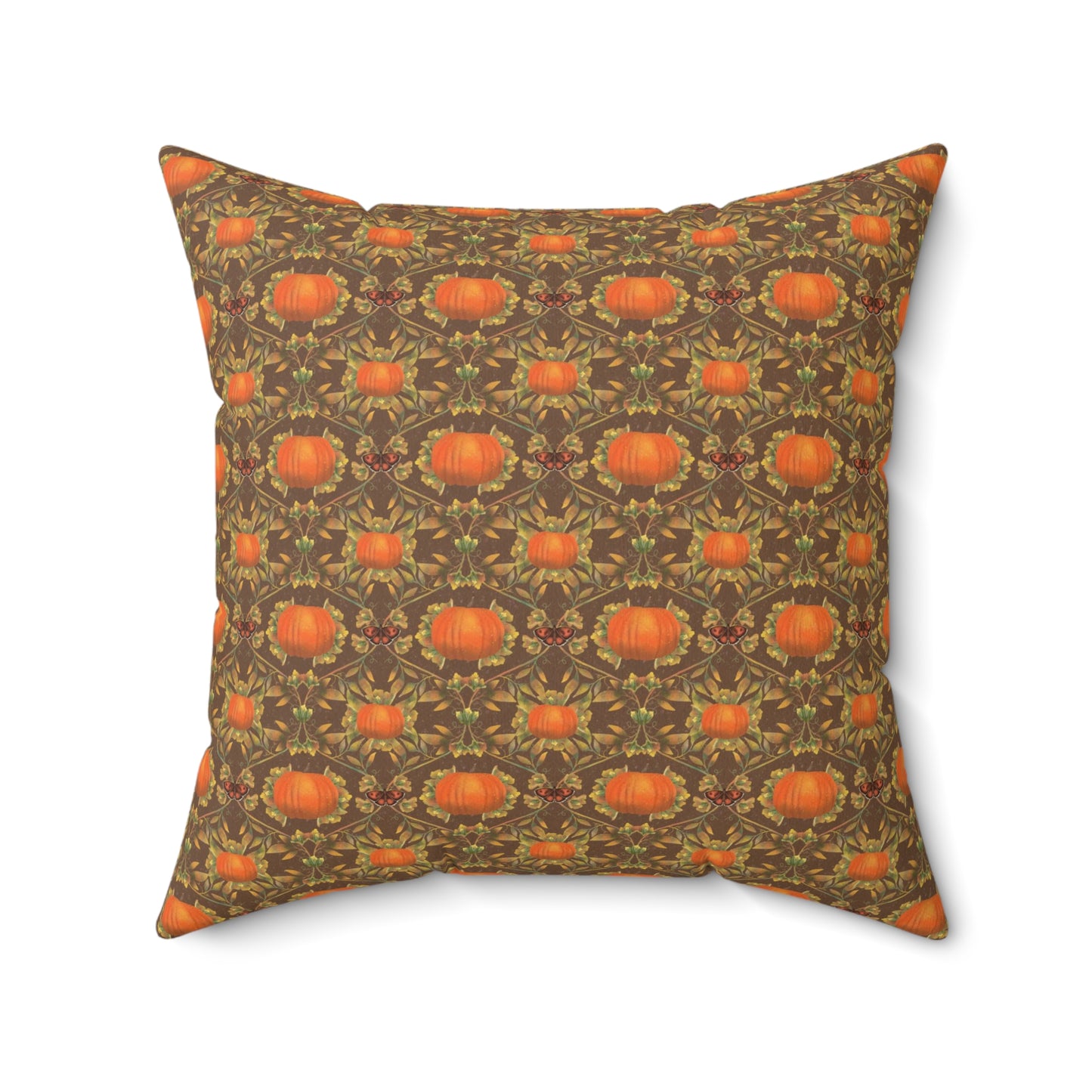 Introducing the perfect addition to your autumn decor, our spun polyester square throw pillow featuring a beautiful geometric design of pumpkins surrounded by autumn-colored pumpkin leaves and vines on a soft brown background. This pillow is not only visually stunning but also incredibly comfortable to rest on. The spun polyester fabric provides a soft and durable surface, ensuring that your pillow will last for many autumns to come.