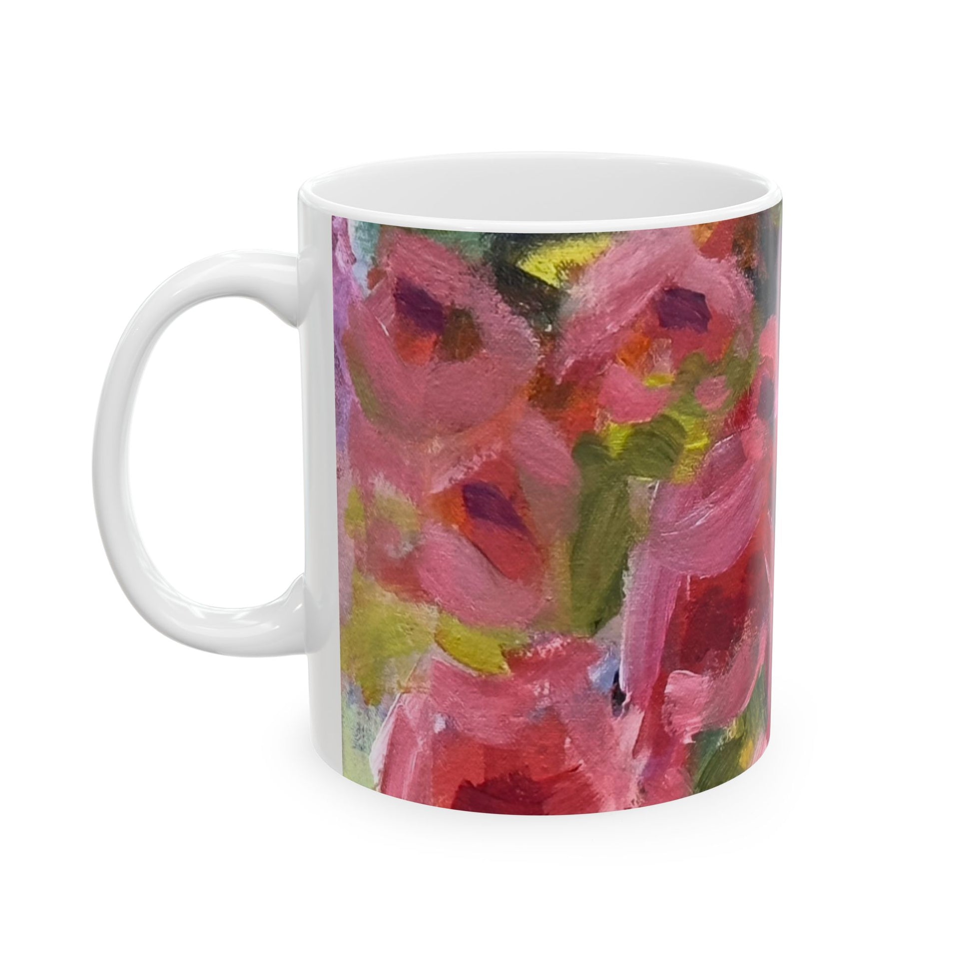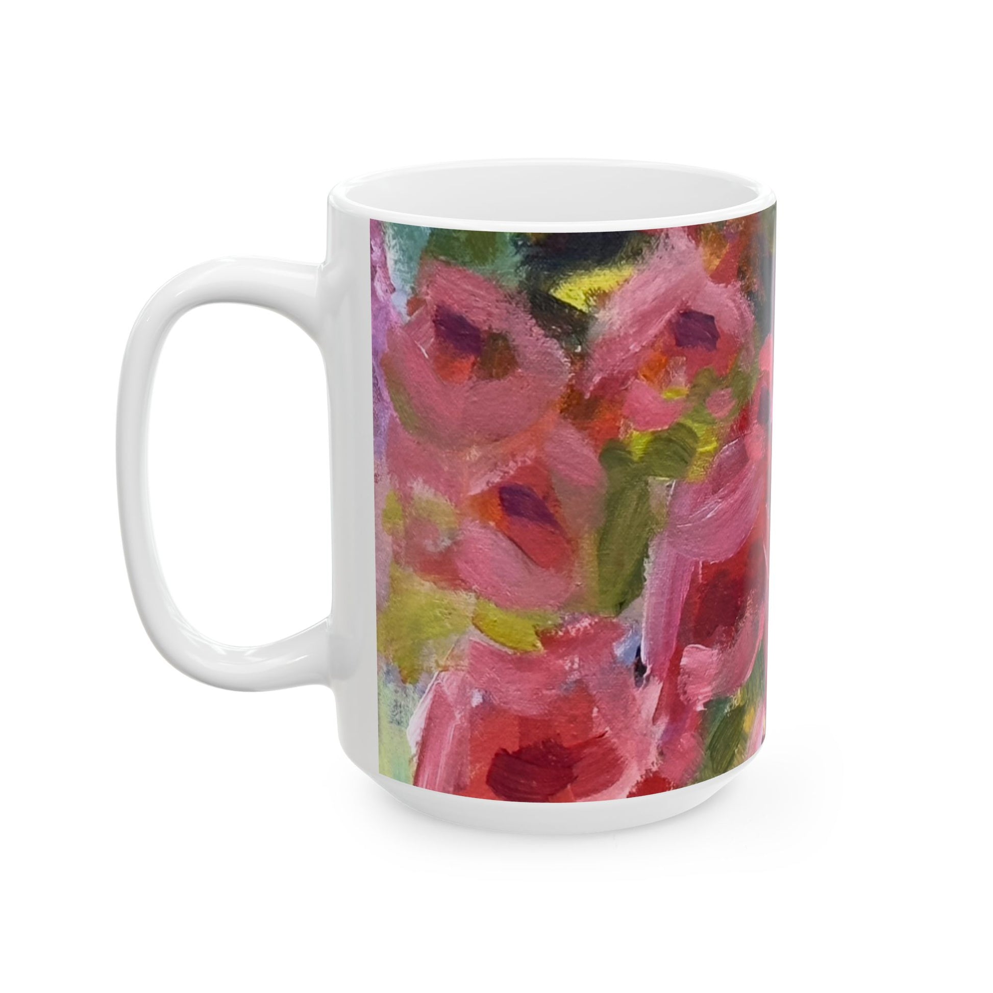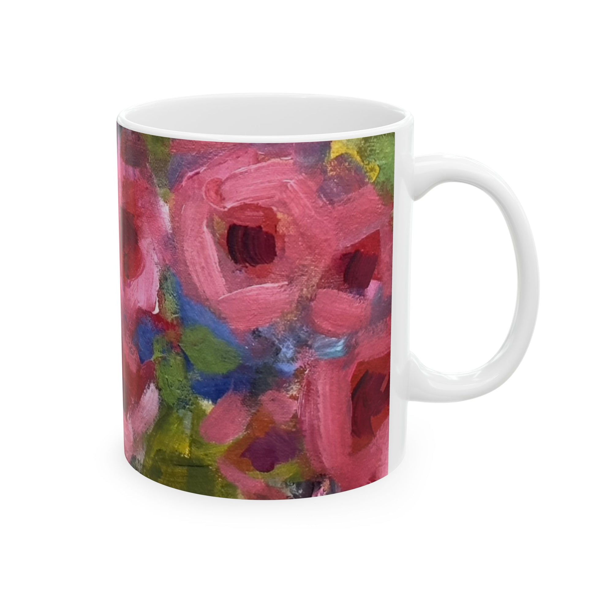 Sip your favorite beverage in blooming style with this ceramic mug featuring a close-up of my original acrylic painting, Rose Garden Beauties. Loosely painted pink roses burst with color and energy, their petals expressed in sweeping, spontaneous brushstrokes. Created in an abstract expressionist style, the design celebrates the beauty of imperfection, texture, and movement — much like a real garden in full bloom. Available in both 11 oz and 15 oz sizes, this mug is perfect for morning coffee, afternoon tea, or simply enjoying a moment surrounded by art.