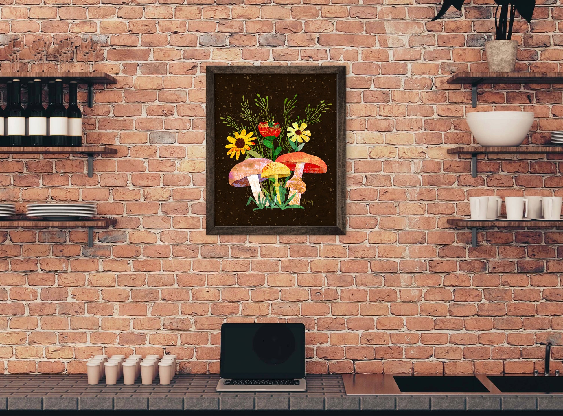 Bring a touch of woodland enchantment to your walls with the “Shrooms n Fleurs” wood-framed premium matte print. This dreamy illustration features a red, golden, and tan mushroom surrounded by a sunflower, red poppy, and yellow daisy, all rising from lush grasses against a deep, textured mushroom-inspired background. Printed on premium matte paper for a smooth, elegant finish and framed in natural wood, this piece combines cozy cottagecore charm with timeless artistry—perfect for adding warmth and whimsy to any living space, studio, or reading nook.