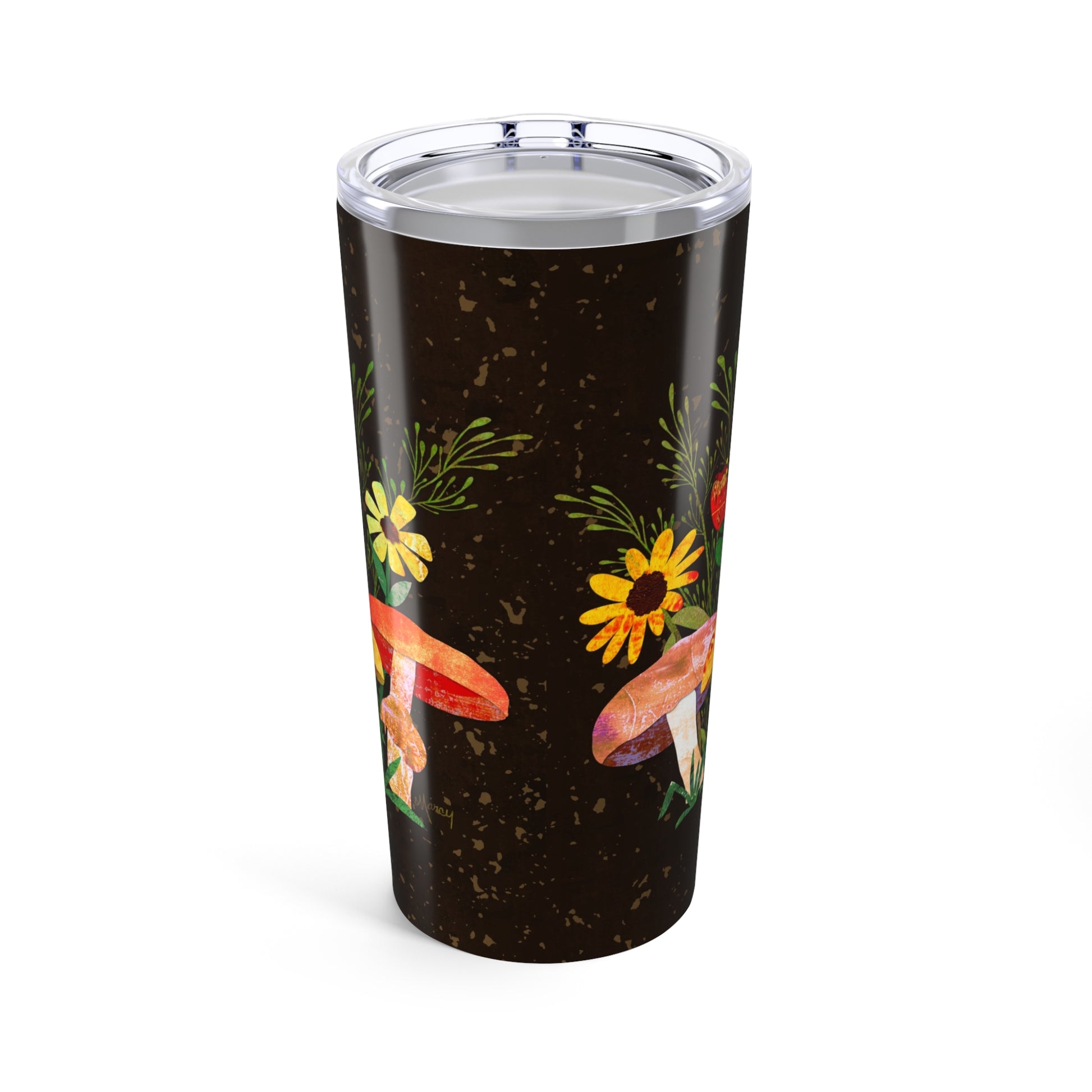 Sip in style with the “Shrooms n Fleurs” 20oz stainless steel travel mug. This enchanting design showcases a red, golden, and tan mushroom nestled alongside a sunflower, a red poppy, and a bright yellow daisy. Tall grasses rise in the background while soft greenery sits at the base, all set against a deep mushroom-textured backdrop. Double-walled insulation keeps drinks hot or cold for hours, while the sturdy stainless steel build makes it perfect for daily use—whether you’re commuting, hiking, or simply enjoying your favorite beverage on the go. A functional and beautiful piece for nature lovers and dreamers alike.
