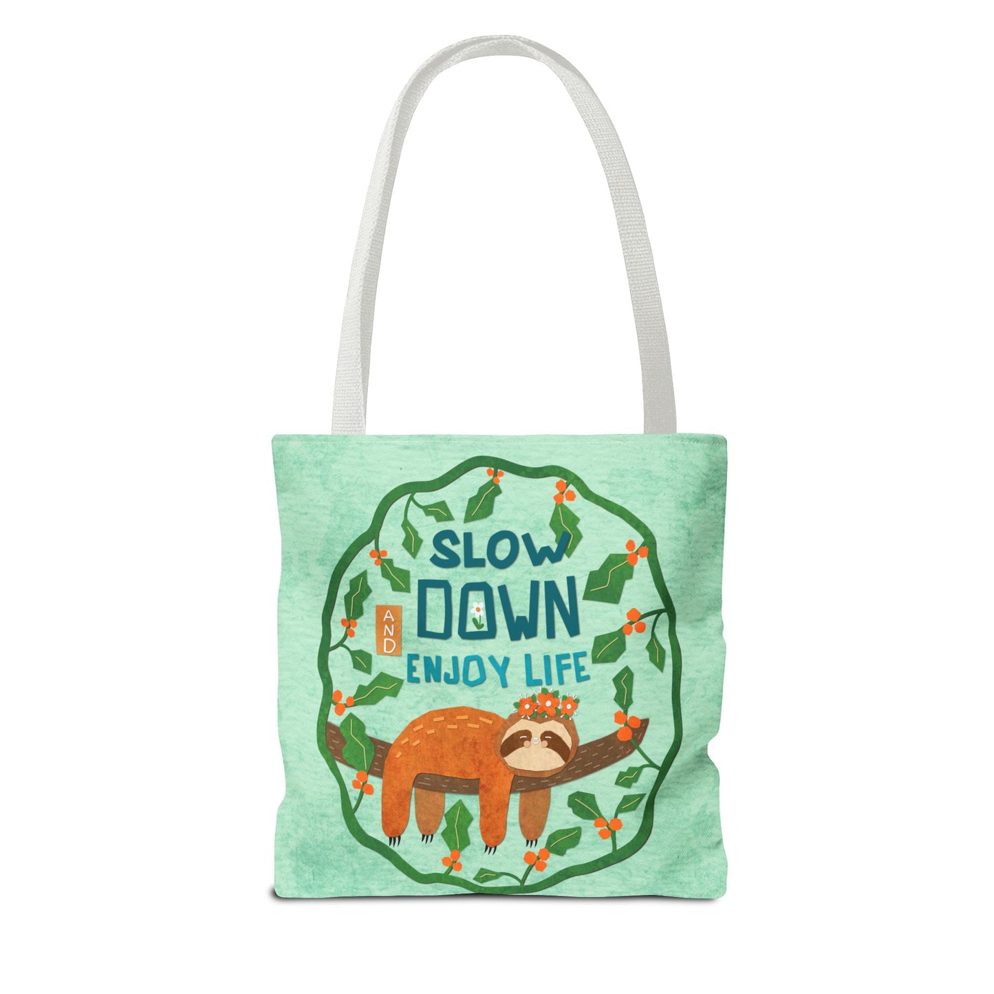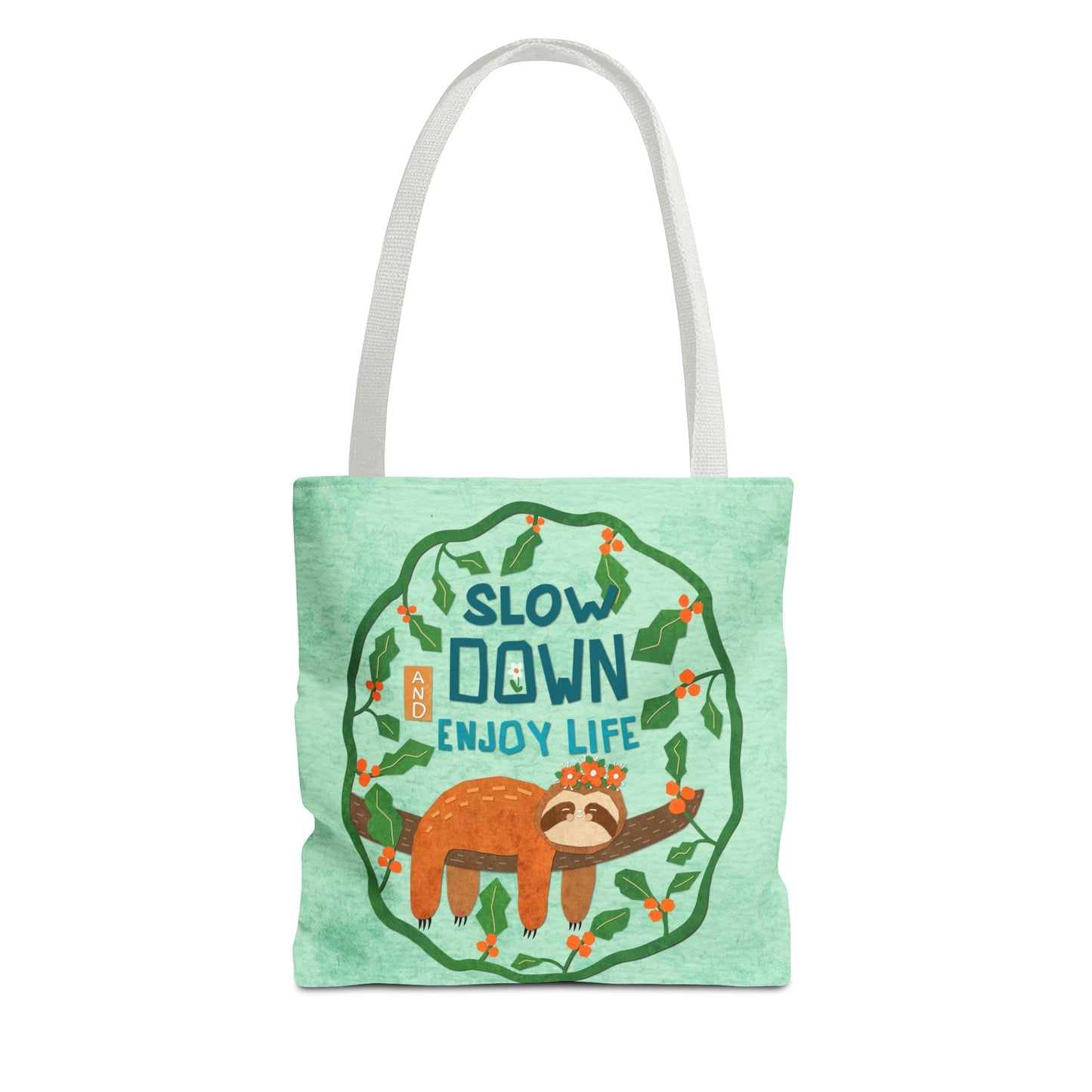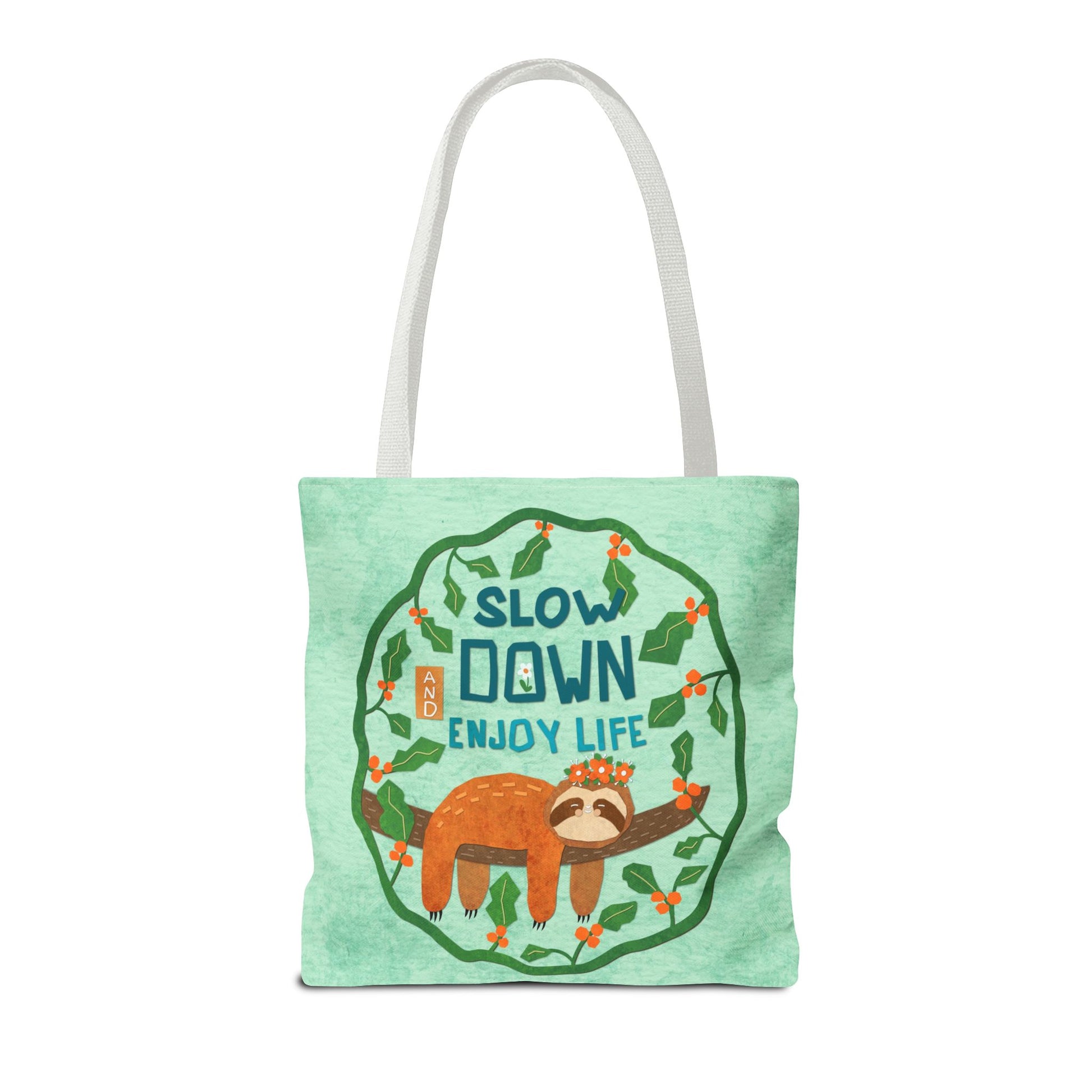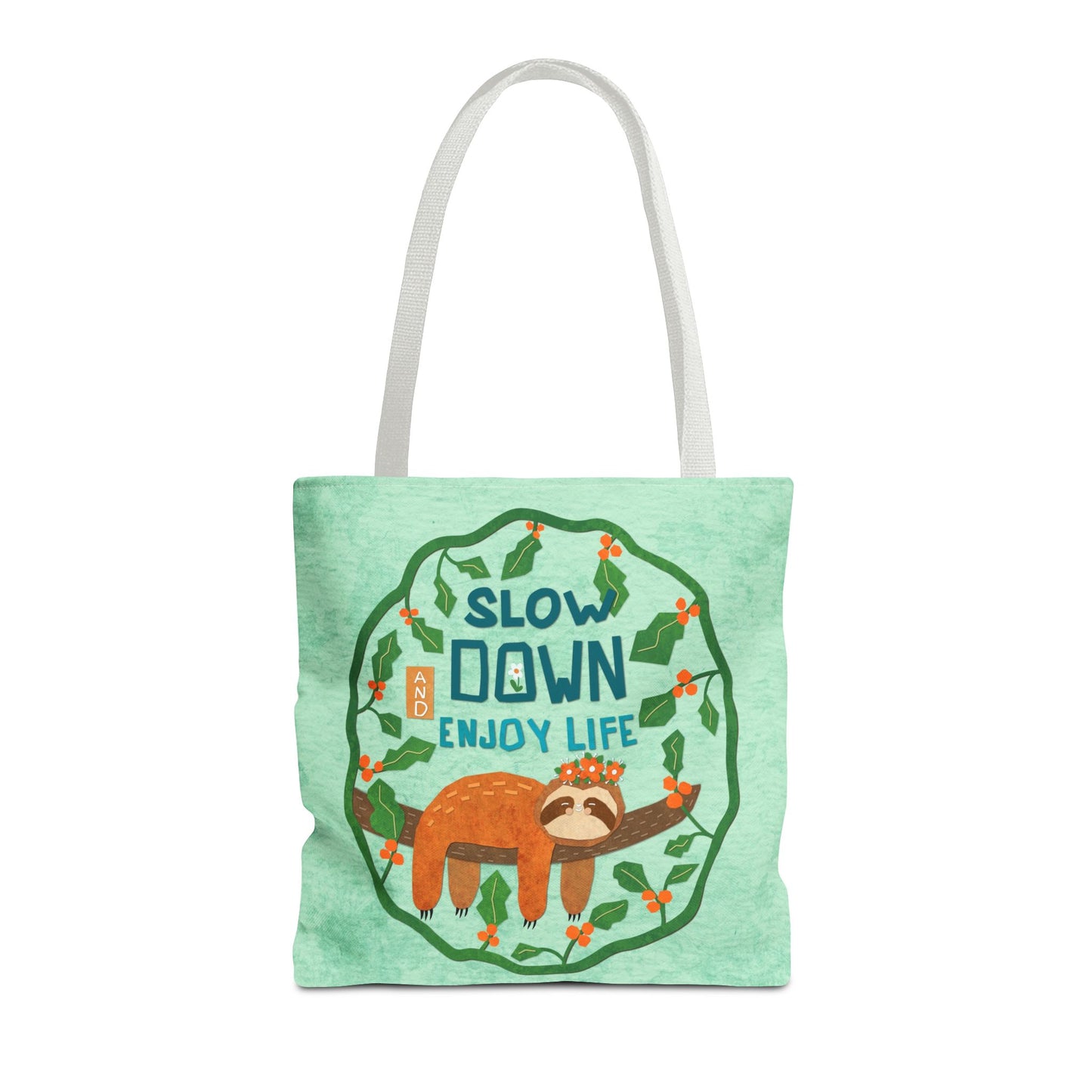 Take things slow and stylish with this charming tote bag featuring a hand-cut collage illustration of a flower-crowned sloth hanging peacefully from a tree branch. Encircled by lush green leaves and playful orange berries, this sweet scene is paired with hand-lettered text that reads: “Slow Down and Enjoy Life.”