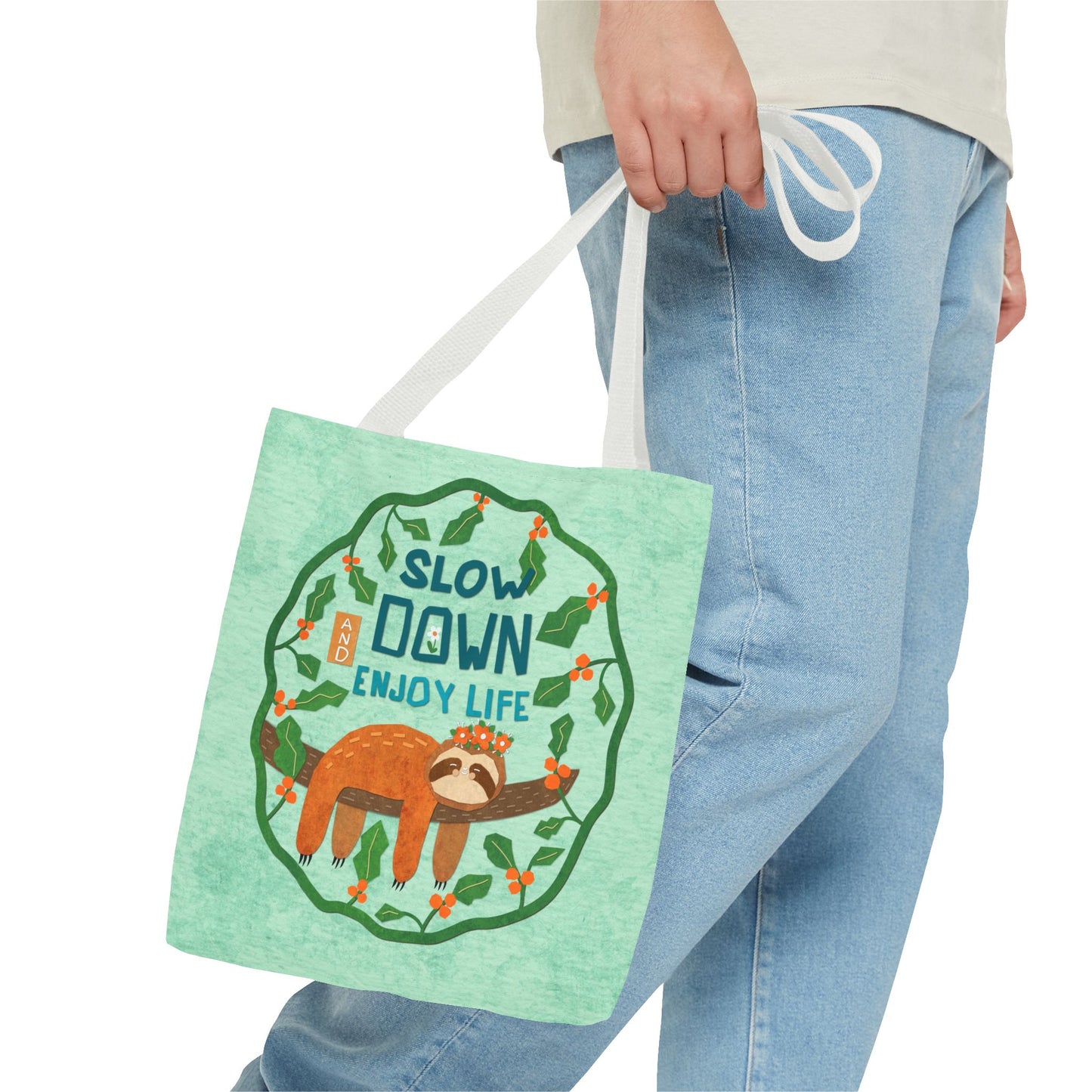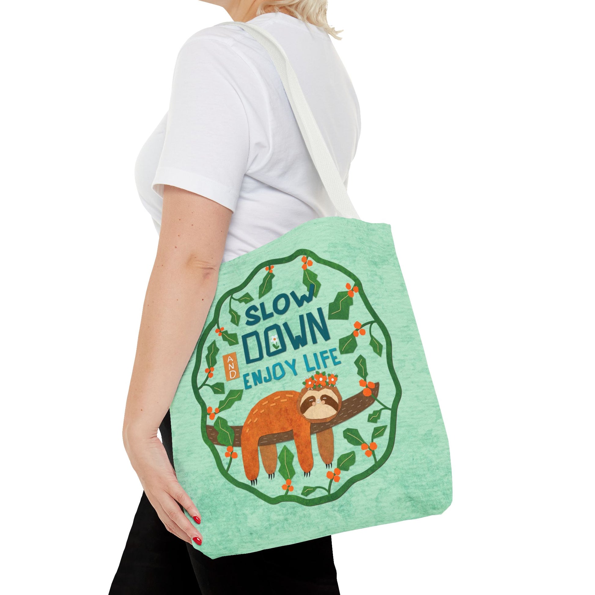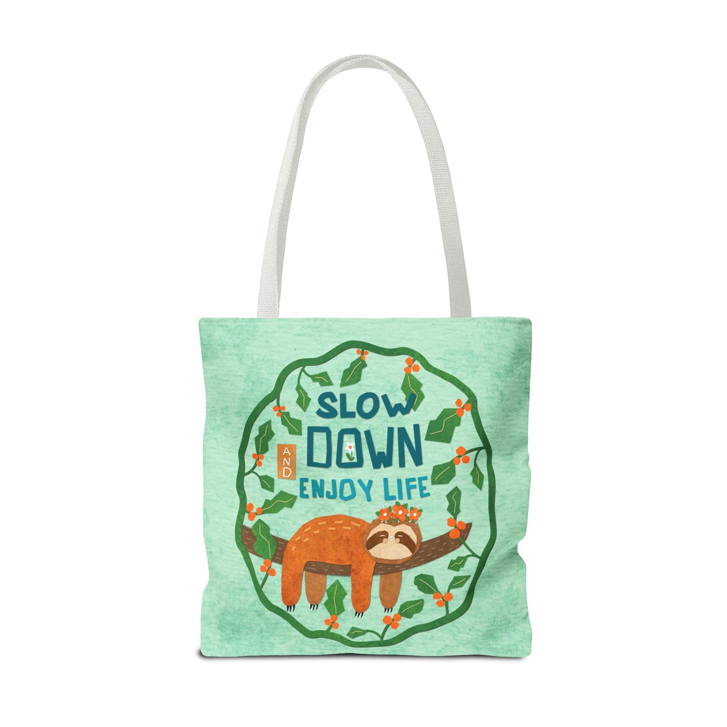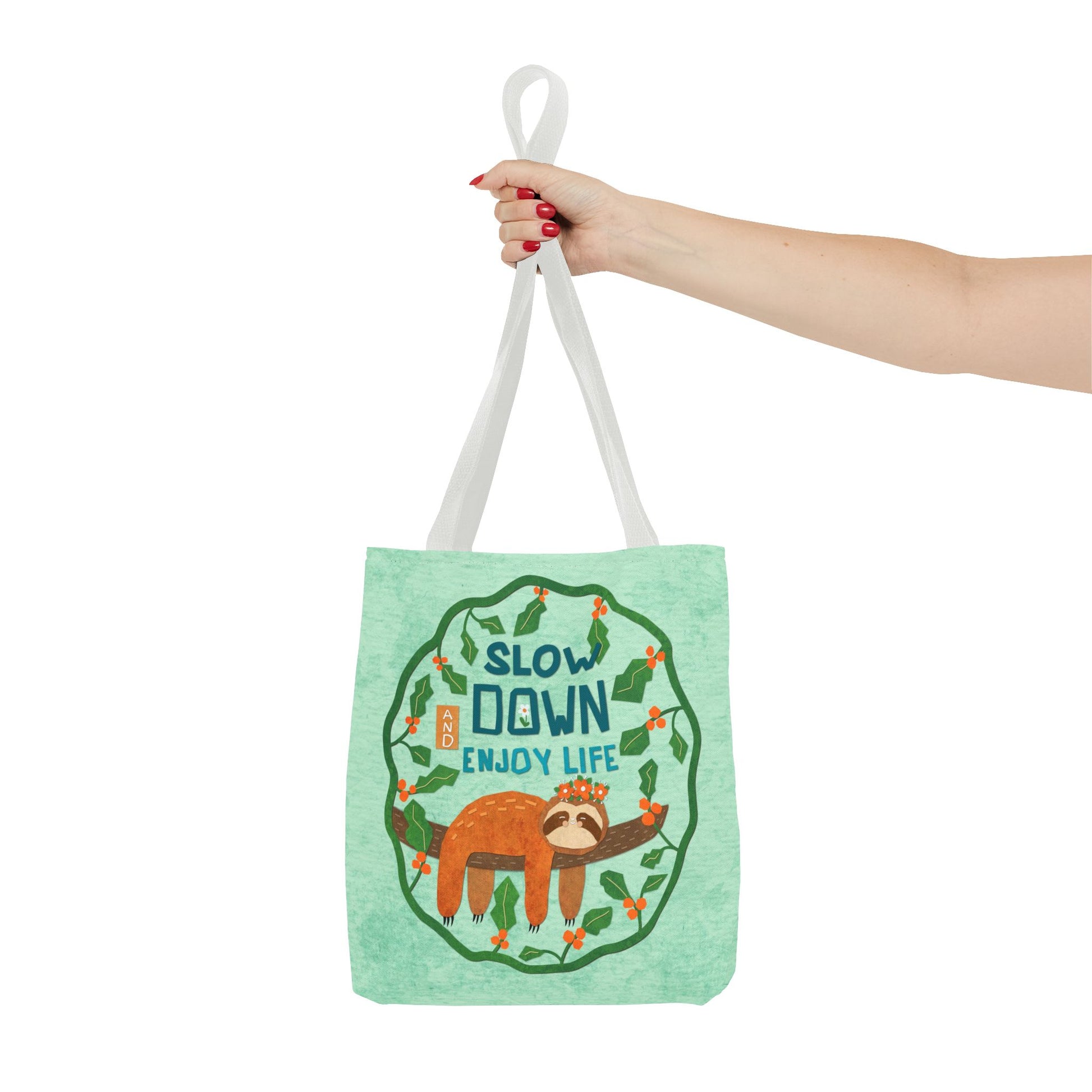 Take things slow and stylish with this charming tote bag featuring a hand-cut collage illustration of a flower-crowned sloth hanging peacefully from a tree branch. Encircled by lush green leaves and playful orange berries, this sweet scene is paired with hand-lettered text that reads: “Slow Down and Enjoy Life.”