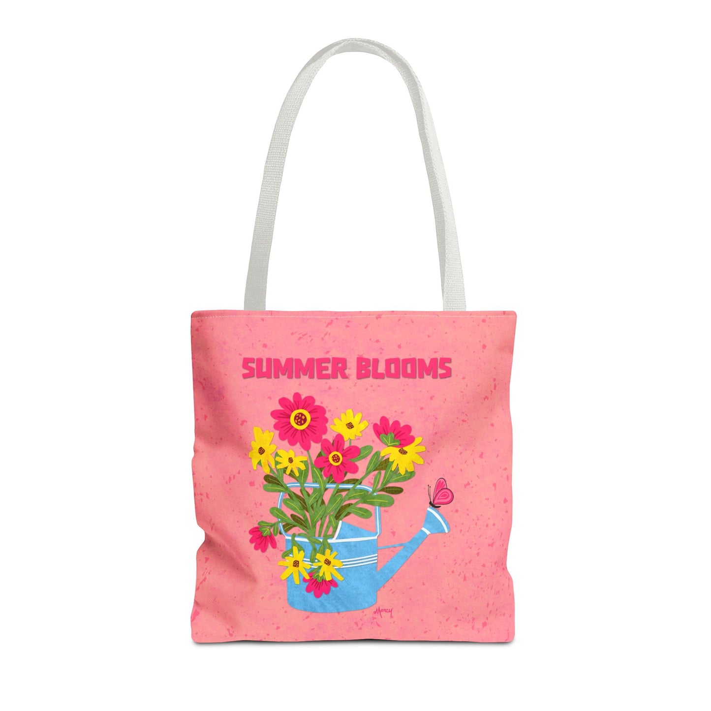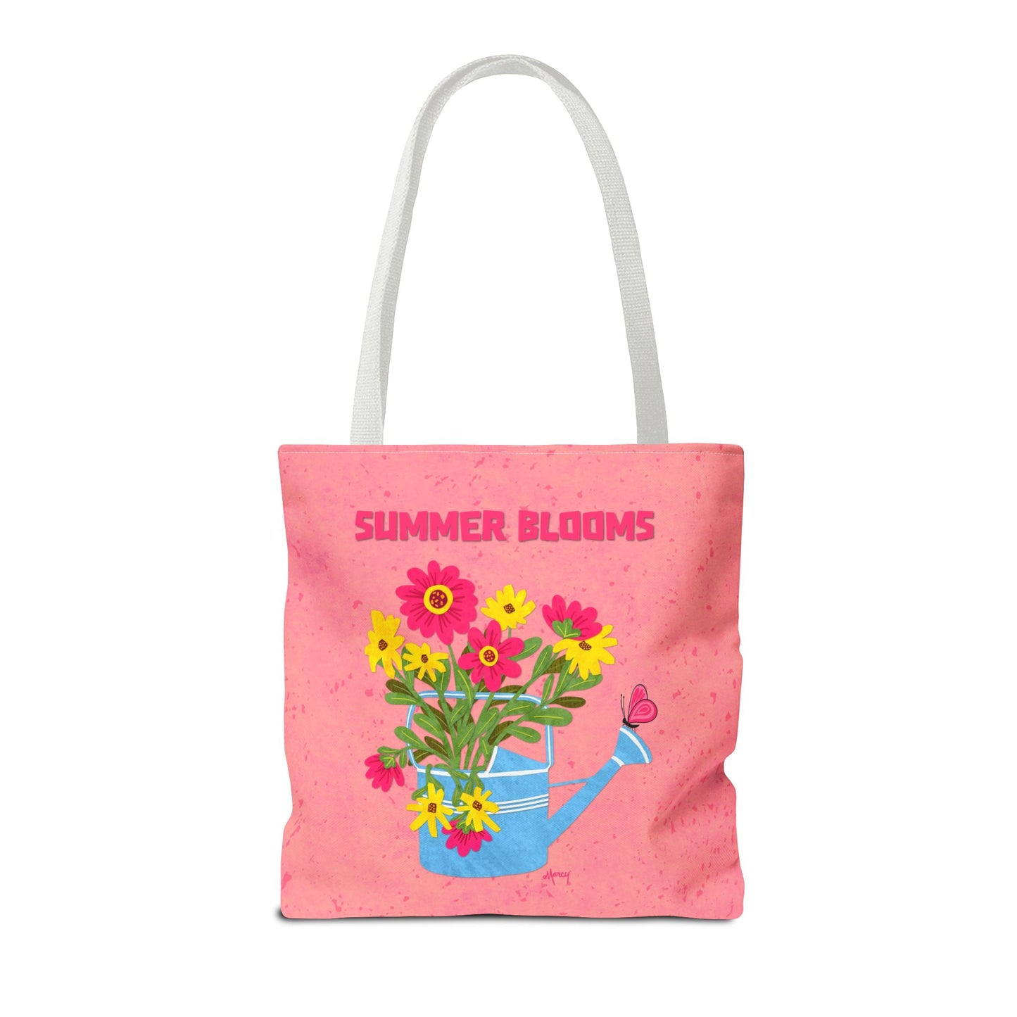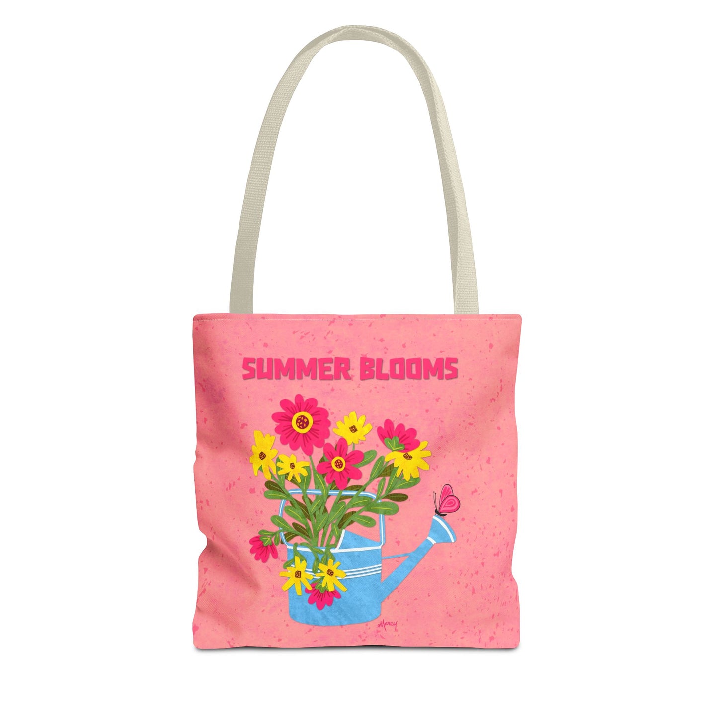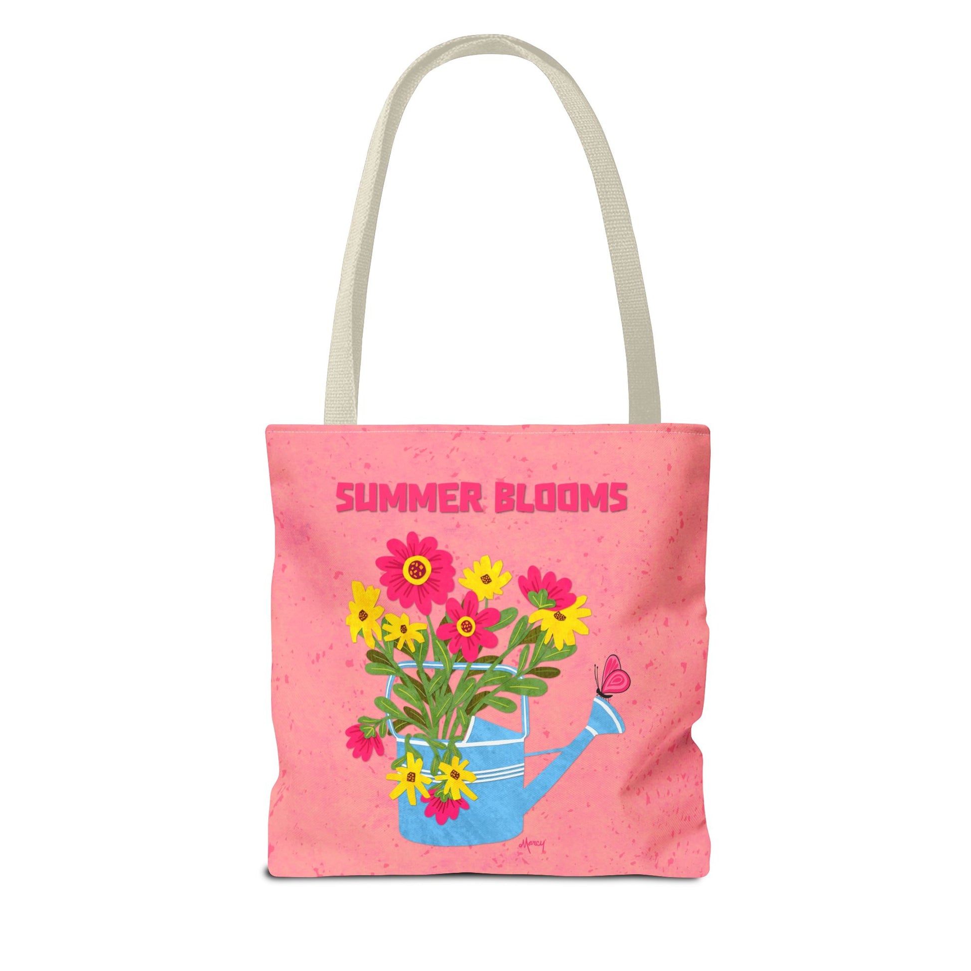Bring a burst of sunshine wherever you go with this charming tote bag featuring my Summer Blooms Collage design! Styled in a playful digital cut paper aesthetic, this bright and cheerful artwork showcases a blue watering can overflowing with pink and yellow summer flowers. The phrase “Summer Blooms” is hand-lettered in soft pink cut paper-style lettering, adding a sweet handmade touch. Made with durable fabric and sturdy straps, this tote is perfect for farmers' market trips, beach days, garden strolls, or carrying your everyday essentials with a splash of seasonal joy.
