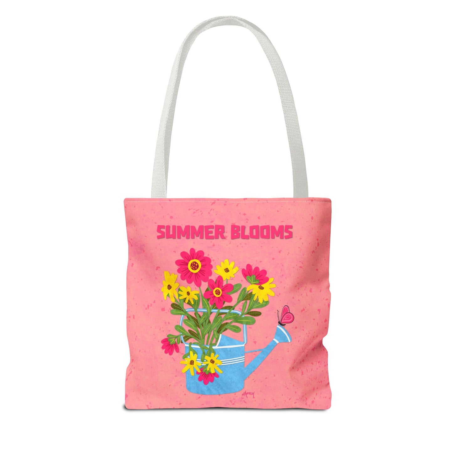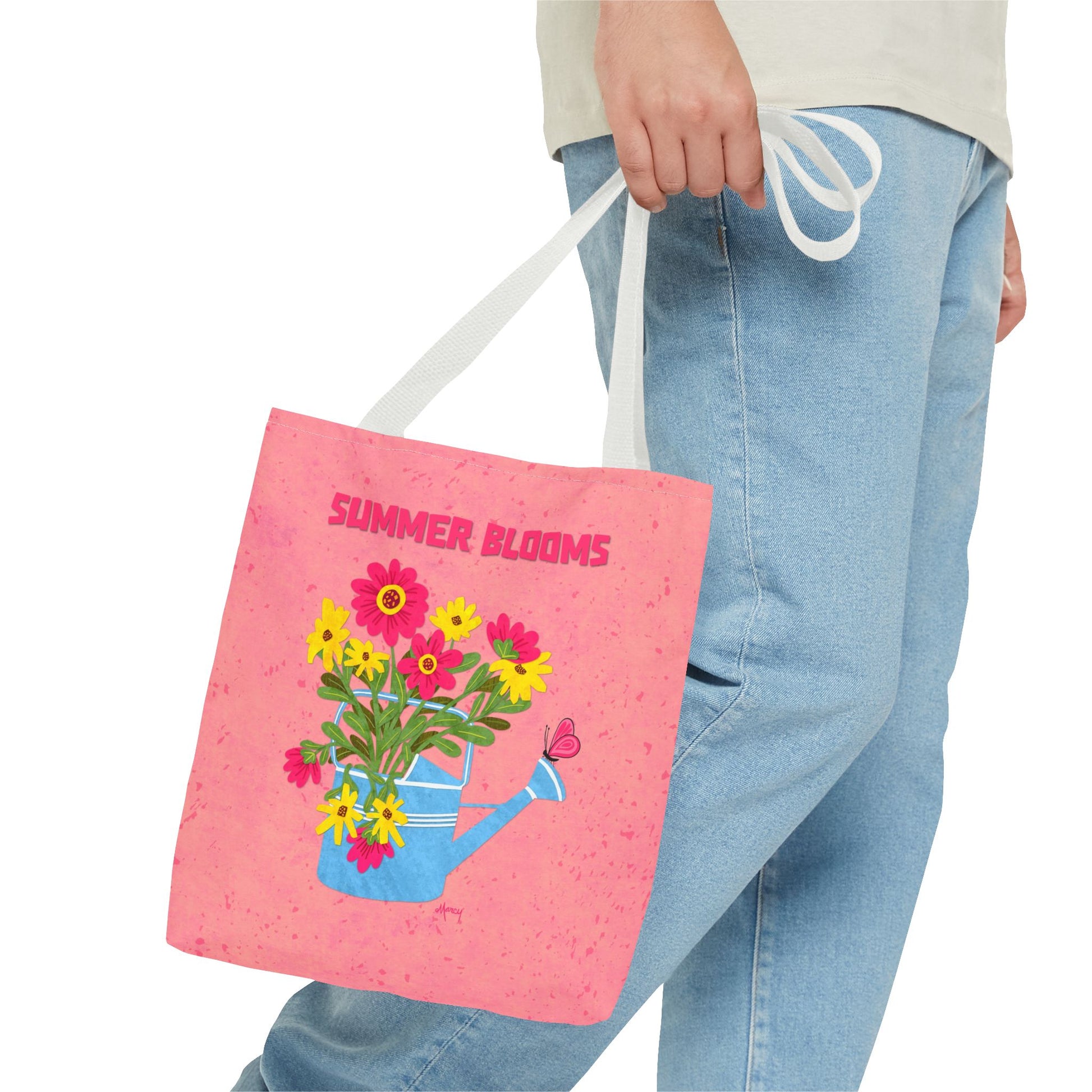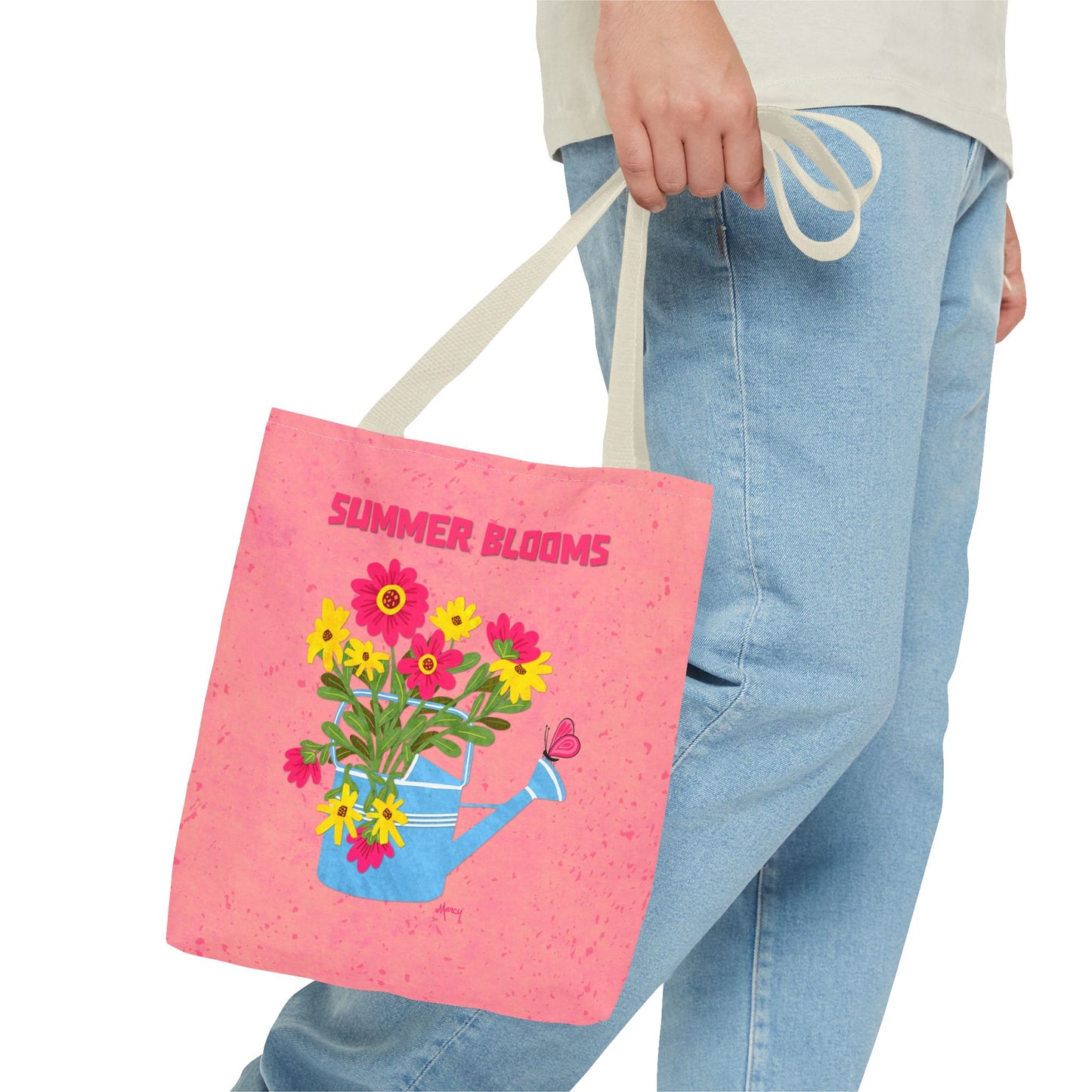Bring a burst of sunshine wherever you go with this charming tote bag featuring my Summer Blooms Collage design! Styled in a playful digital cut paper aesthetic, this bright and cheerful artwork showcases a blue watering can overflowing with pink and yellow summer flowers. The phrase “Summer Blooms” is hand-lettered in soft pink cut paper-style lettering, adding a sweet handmade touch. Made with durable fabric and sturdy straps, this tote is perfect for farmers' market trips, beach days, garden strolls, or carrying your everyday essentials with a splash of seasonal joy.