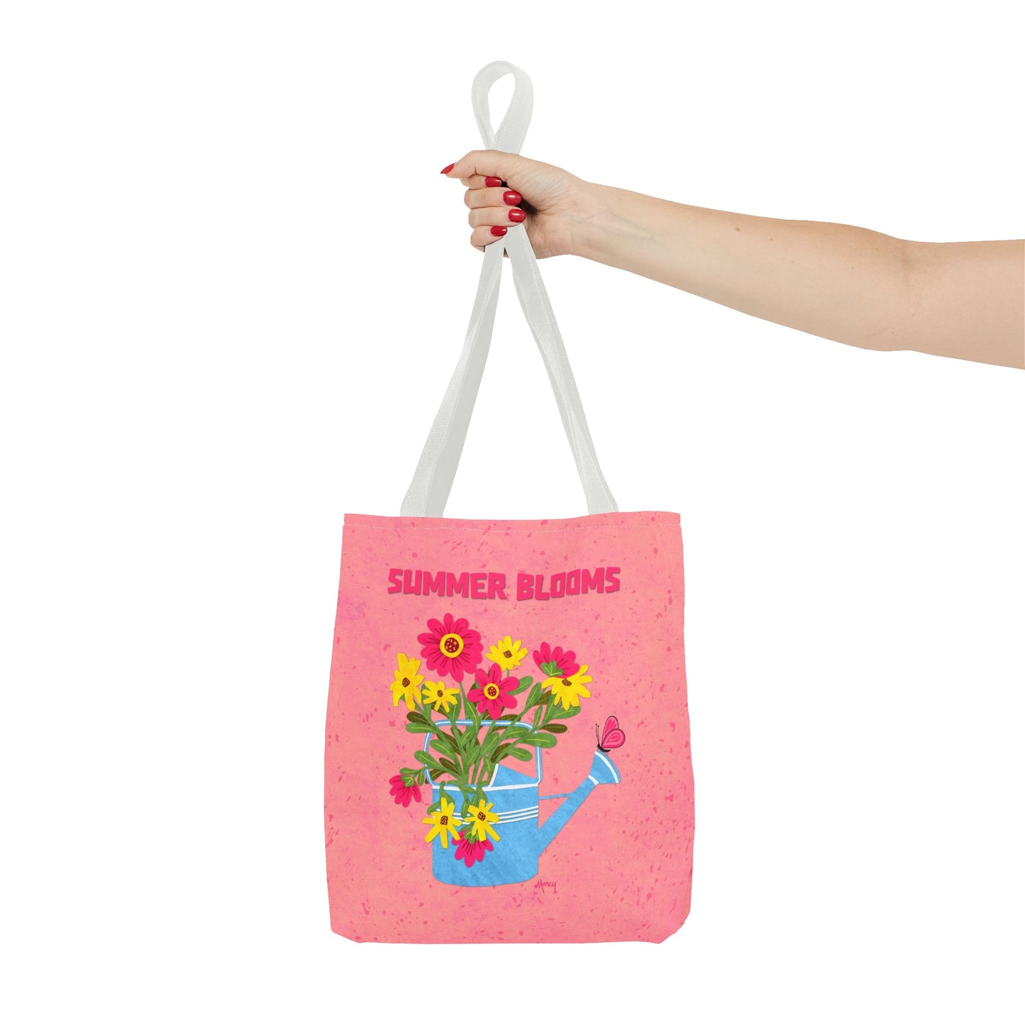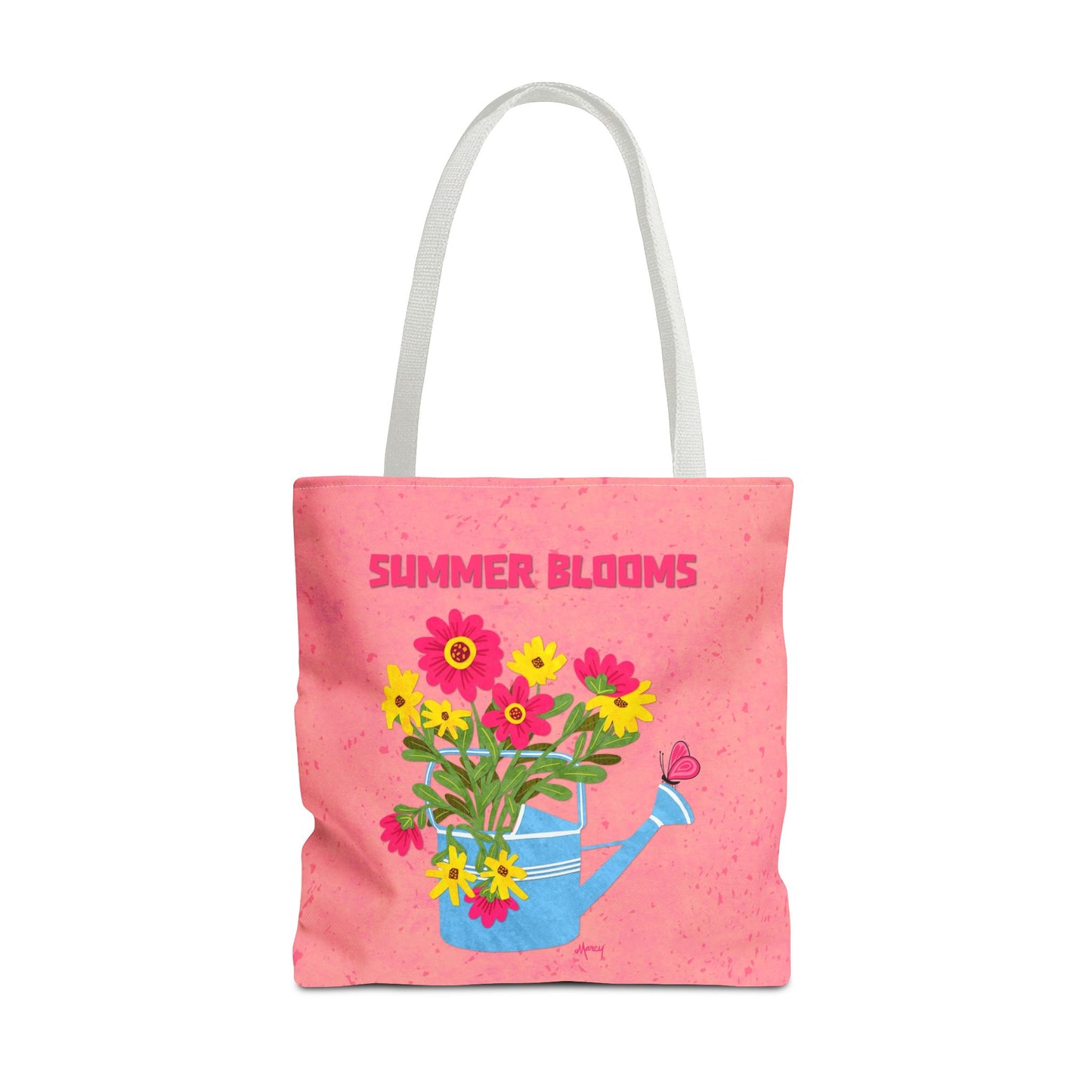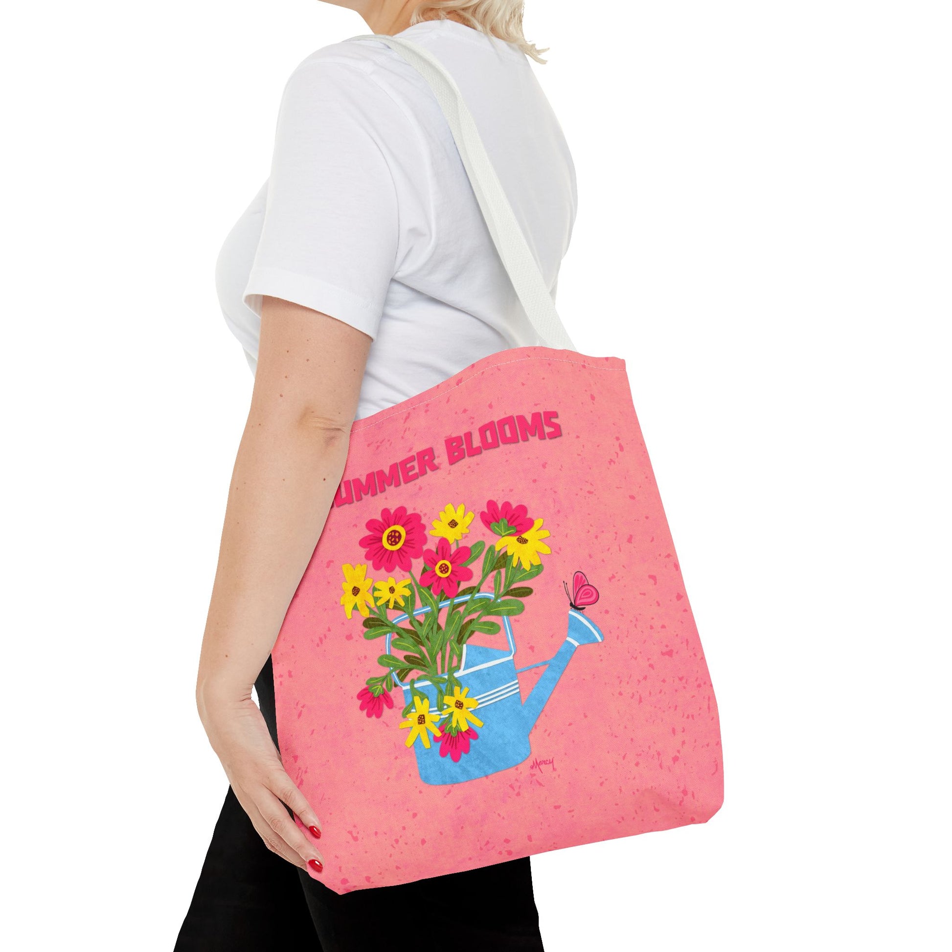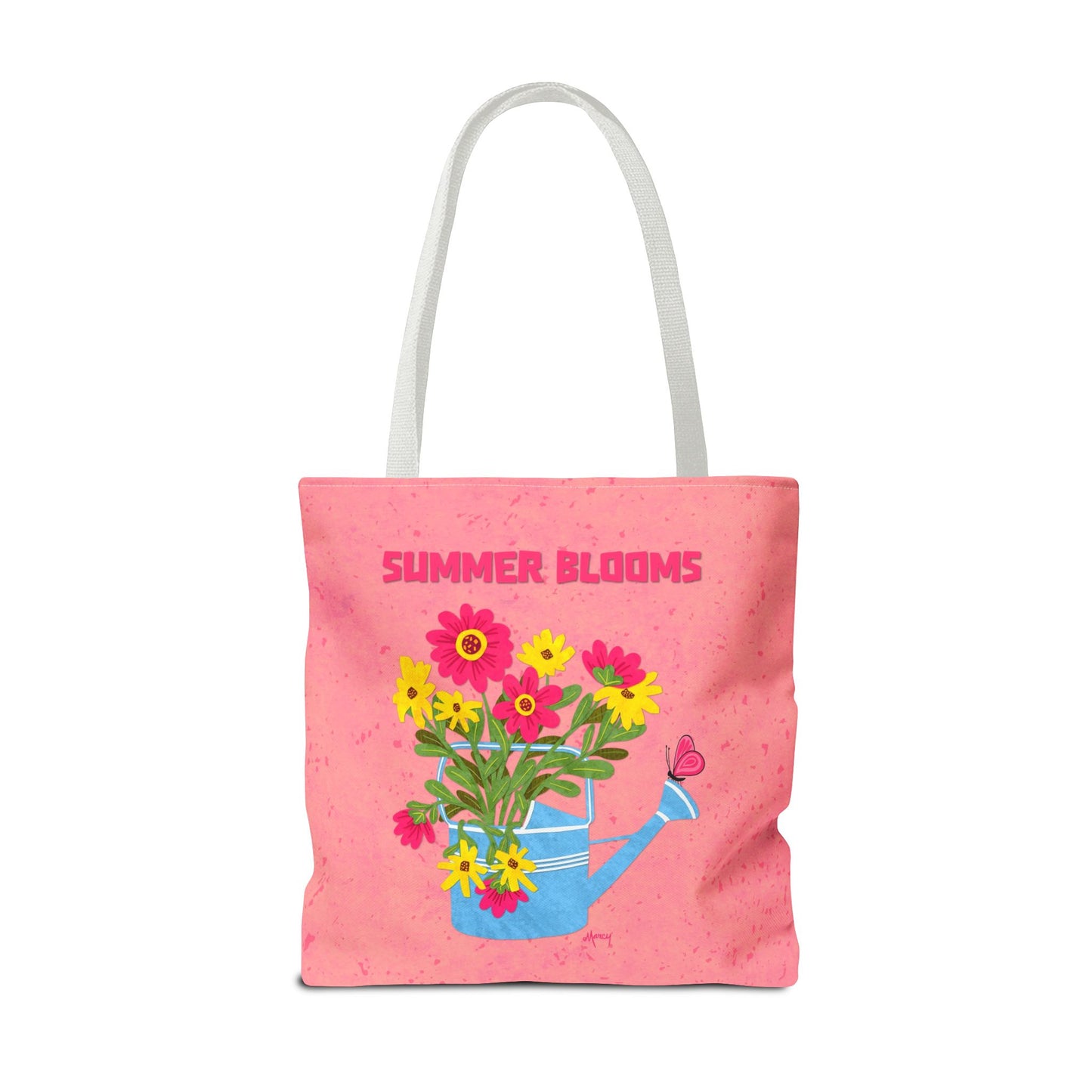 Bring a burst of sunshine wherever you go with this charming tote bag featuring my Summer Blooms Collage design! Styled in a playful digital cut paper aesthetic, this bright and cheerful artwork showcases a blue watering can overflowing with pink and yellow summer flowers. The phrase “Summer Blooms” is hand-lettered in soft pink cut paper-style lettering, adding a sweet handmade touch. Made with durable fabric and sturdy straps, this tote is perfect for farmers' market trips, beach days, garden strolls, or carrying your everyday essentials with a splash of seasonal joy.