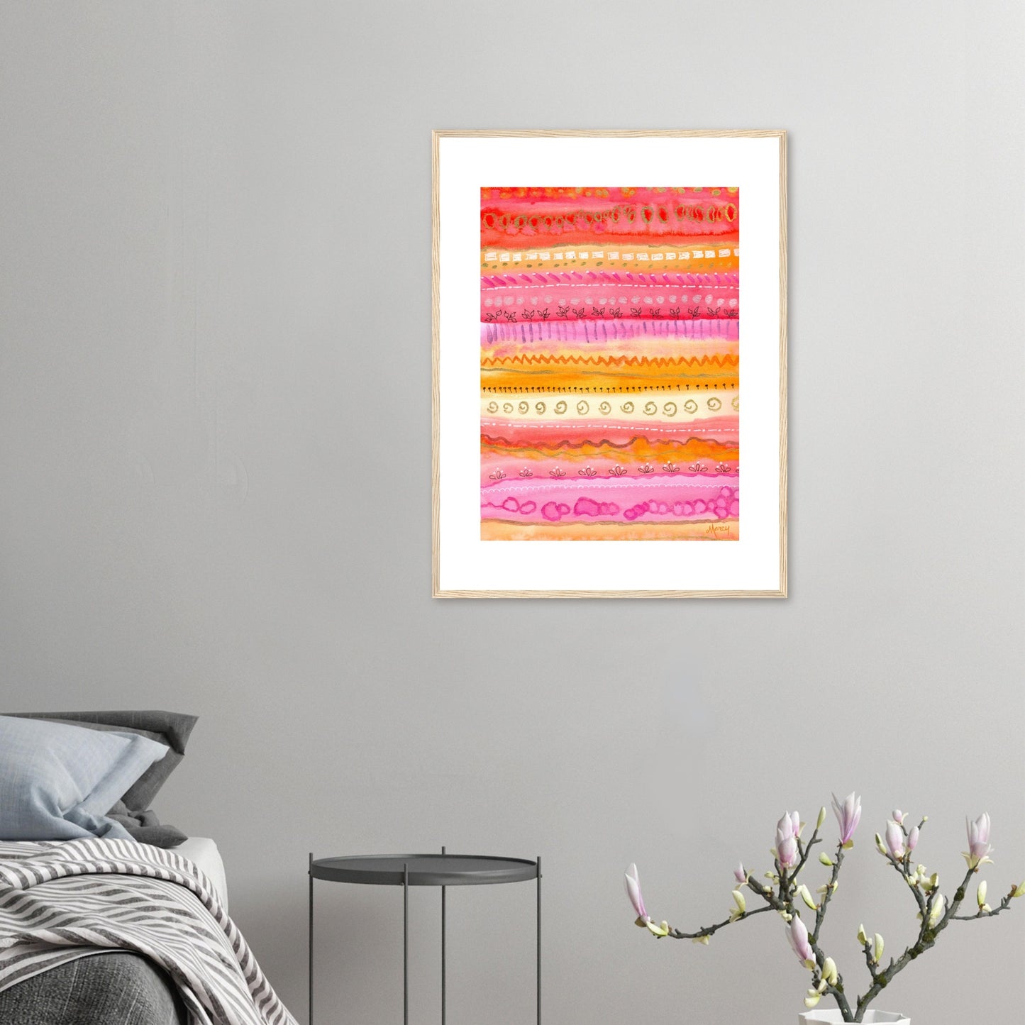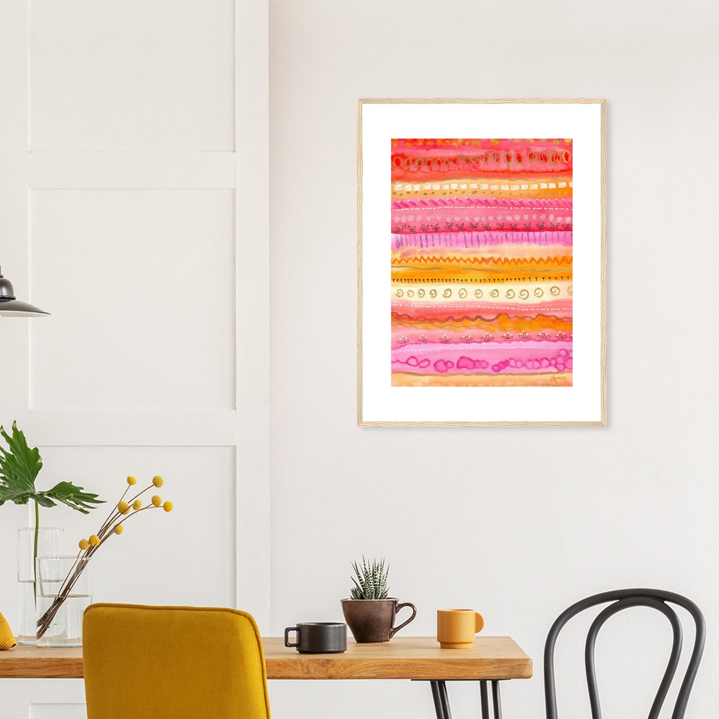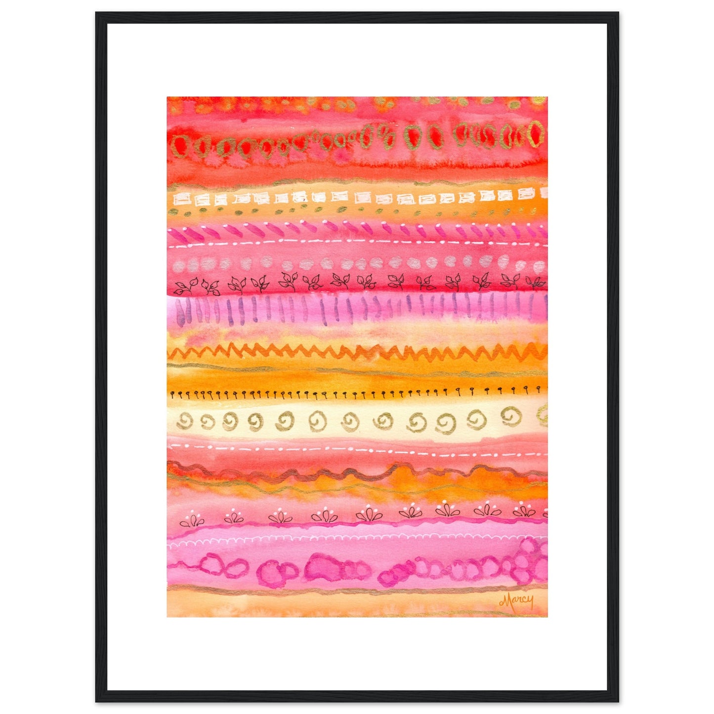 Immerse yourself in the captivating hues of "Sunset Serenade: A Symphony of Warmth and Light" with this stunning framed poster. Created with a blend of loosely painted watercolor stripes in shades of orange, red, and pink, adorned with intricate black ink and metallic gold pen embellishments, this artwork evokes the serene beauty of a radiant sunset. Printed on premium matte paper, each detail of this piece is brought to life, making it a captivating addition to any space. Let the warmth and light of this masterpiece fill your home or office with its mesmerizing charm.