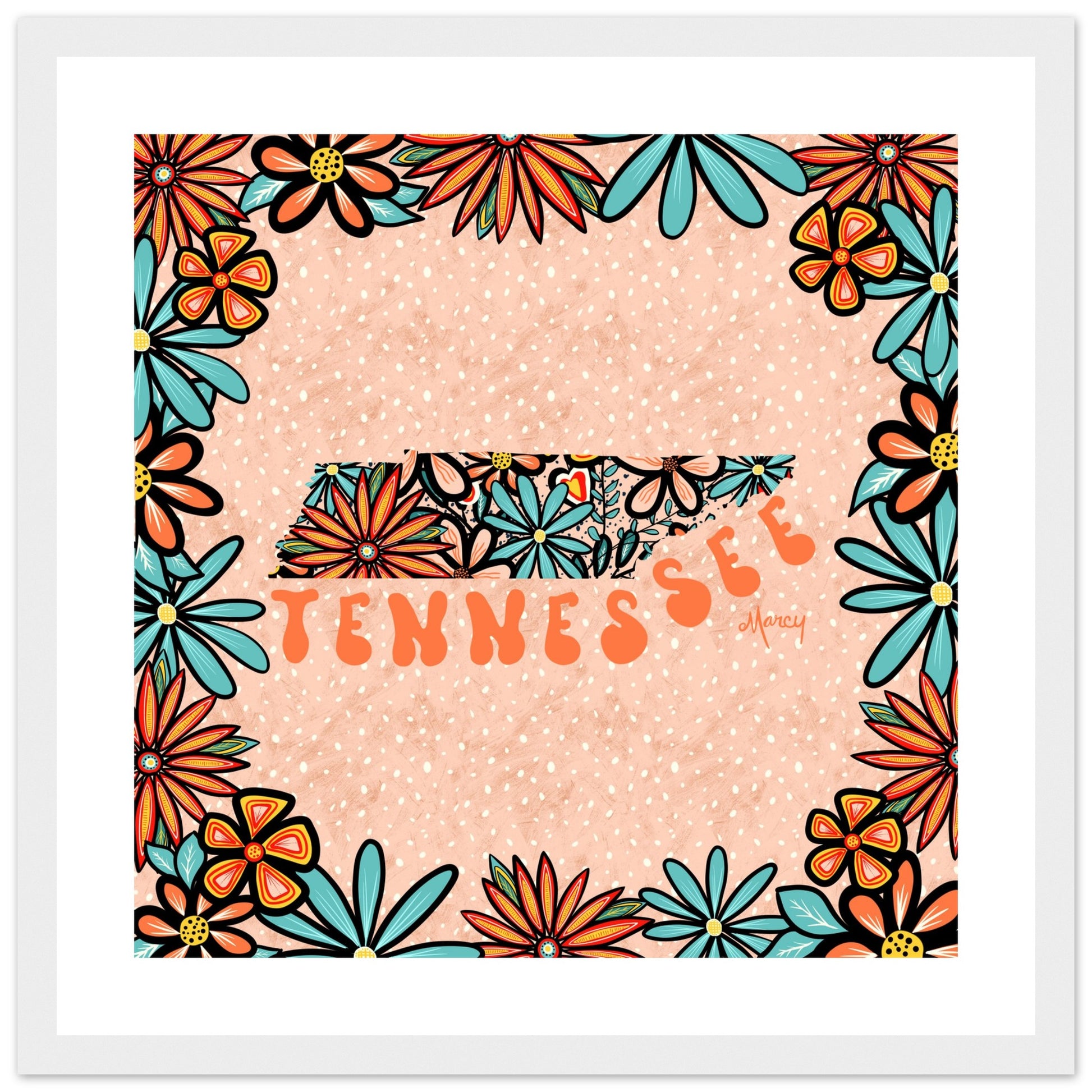This Tennessee state design features an original illustration created by designer Marcy Brennan Art. The illustration employs a 70’s retro ‘flower power’ pattern and color palette with playful 70’s inspired hand-lettering spelling out ‘Tennessee’ in orange. The design is set on a peach background. The perfect gift for a Tennessean.