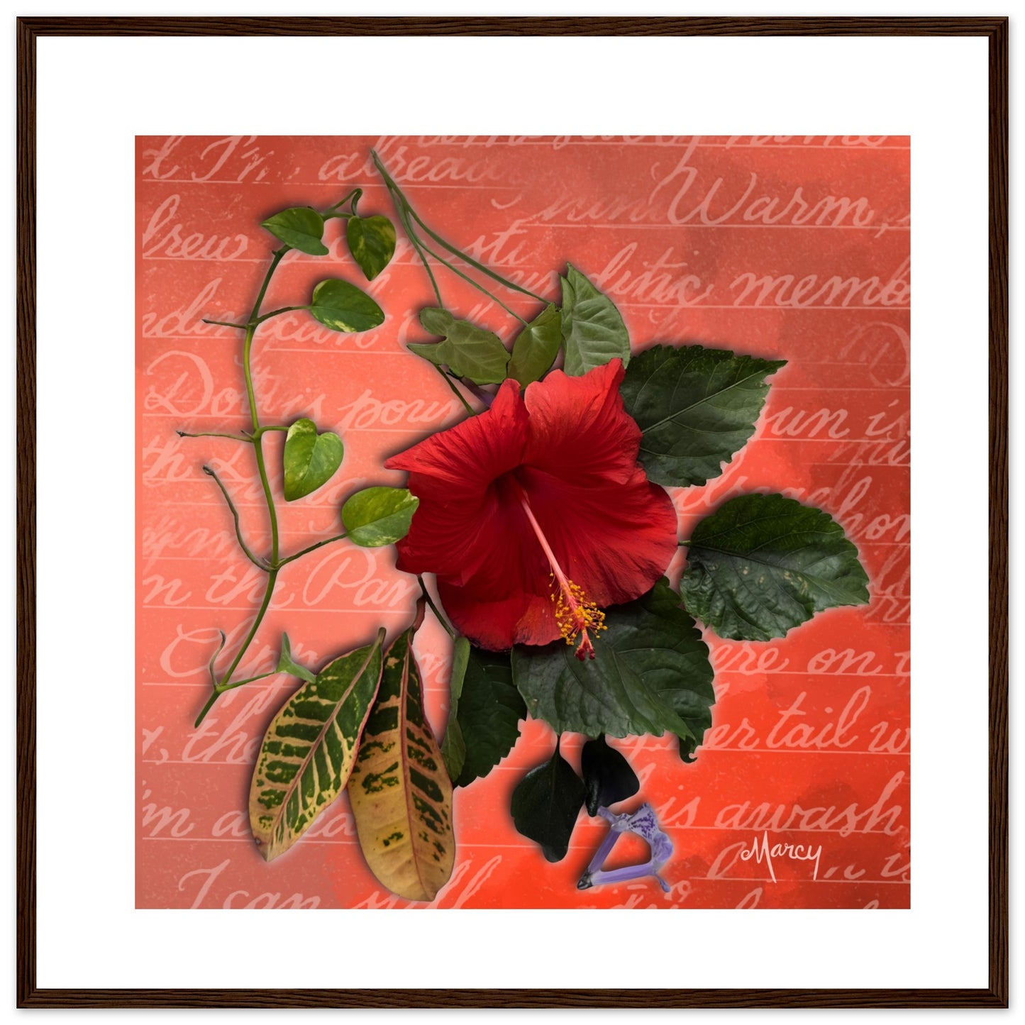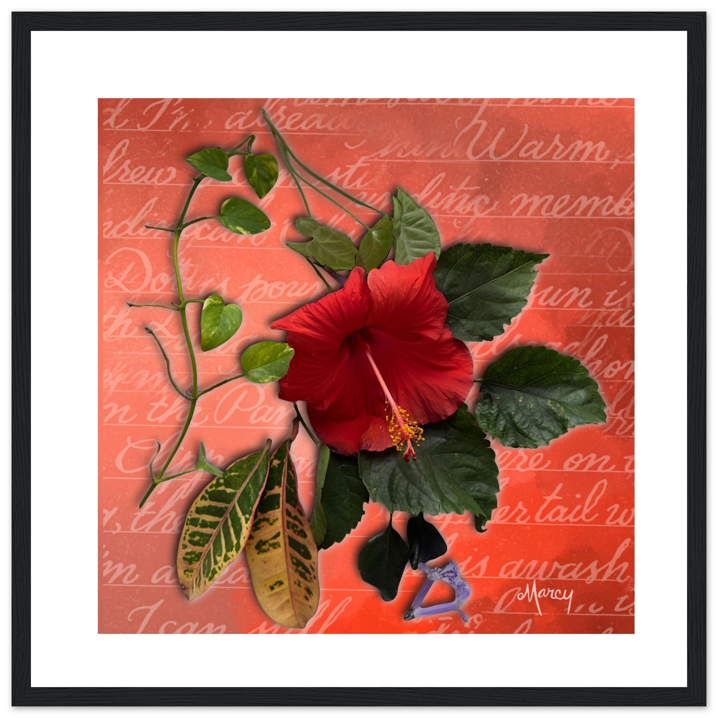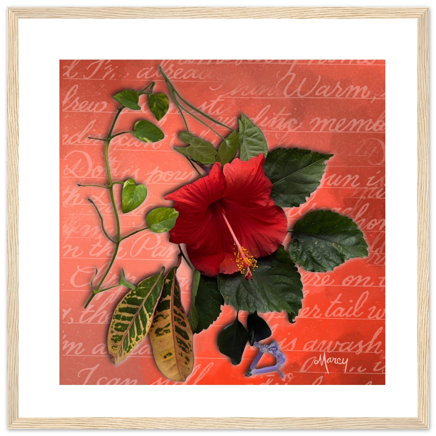 This stunning mixed media print showcases the beauty of tropical botanicals, featuring a high resolution photo of a hibiscus flower and leaves, as well as other vibrant tropical leaves on a mixed media digital background of shades of orange and handwritten script. The combination of the natural elements and artistic elements in this piece creates a unique and eye-catching work of art that is perfect for any tropical or nature-inspired decor.