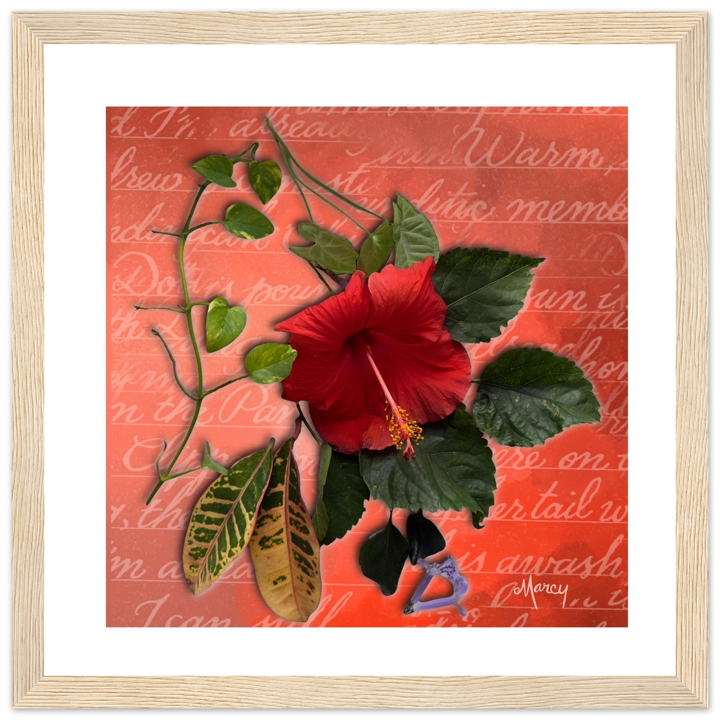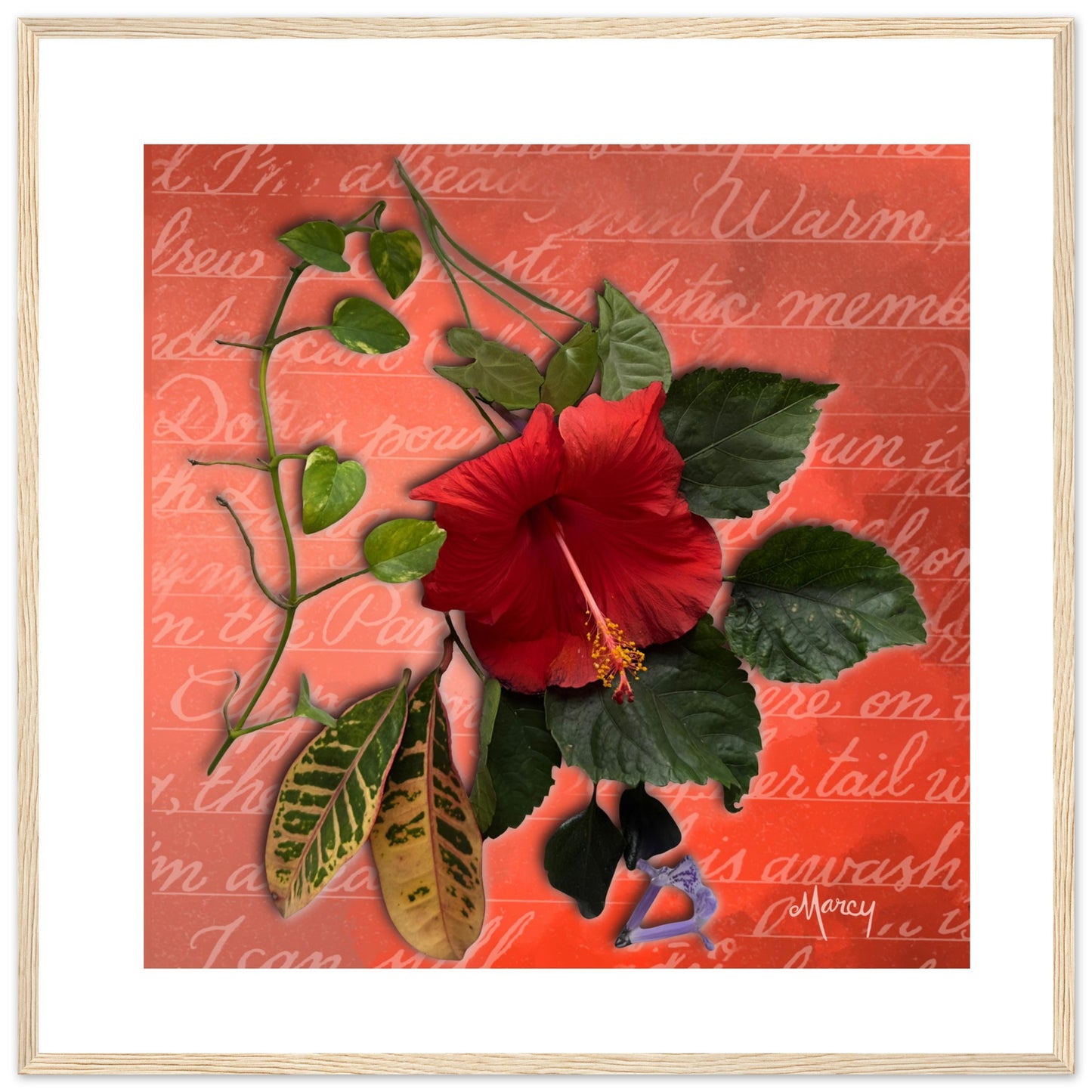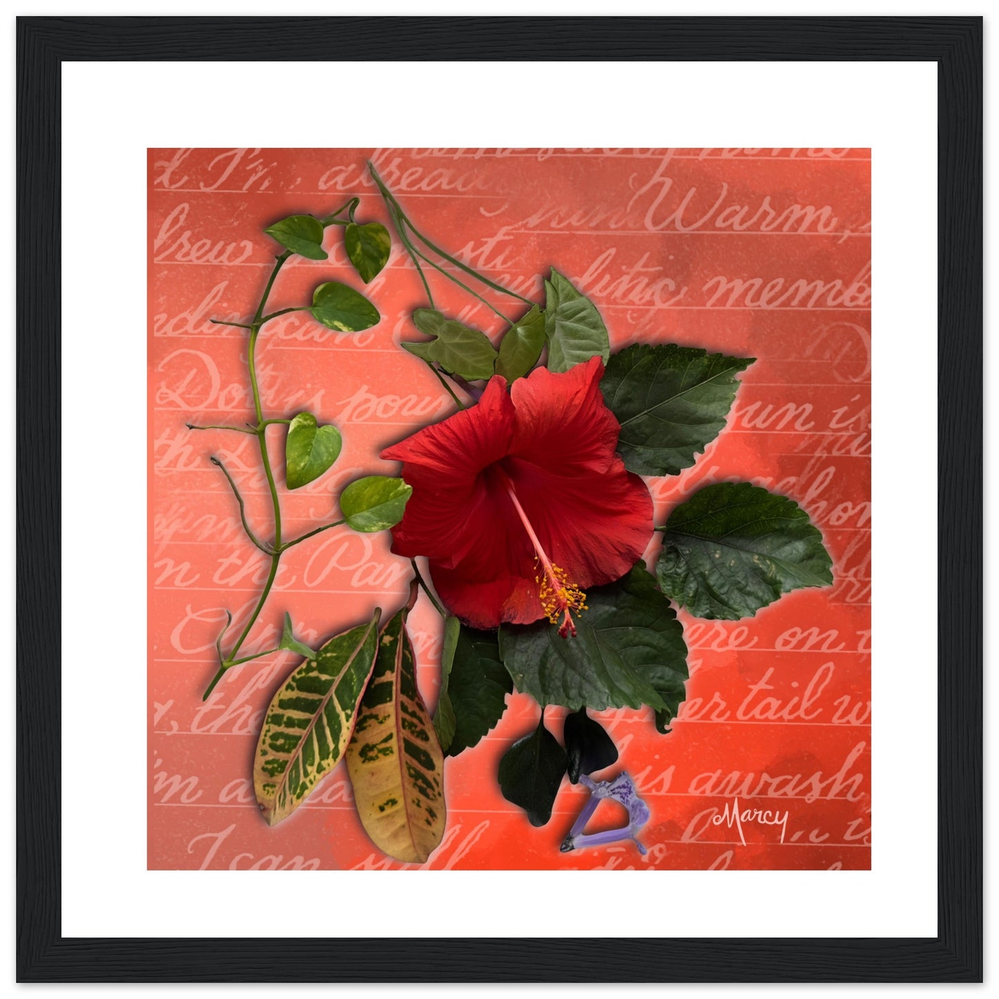 This stunning mixed media print showcases the beauty of tropical botanicals, featuring a high resolution photo of a hibiscus flower and leaves, as well as other vibrant tropical leaves on a mixed media digital background of shades of orange and handwritten script. The combination of the natural elements and artistic elements in this piece creates a unique and eye-catching work of art that is perfect for any tropical or nature-inspired decor.