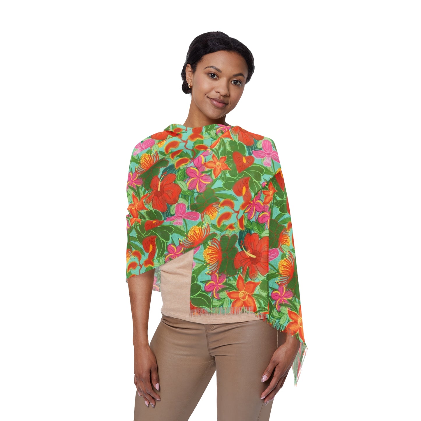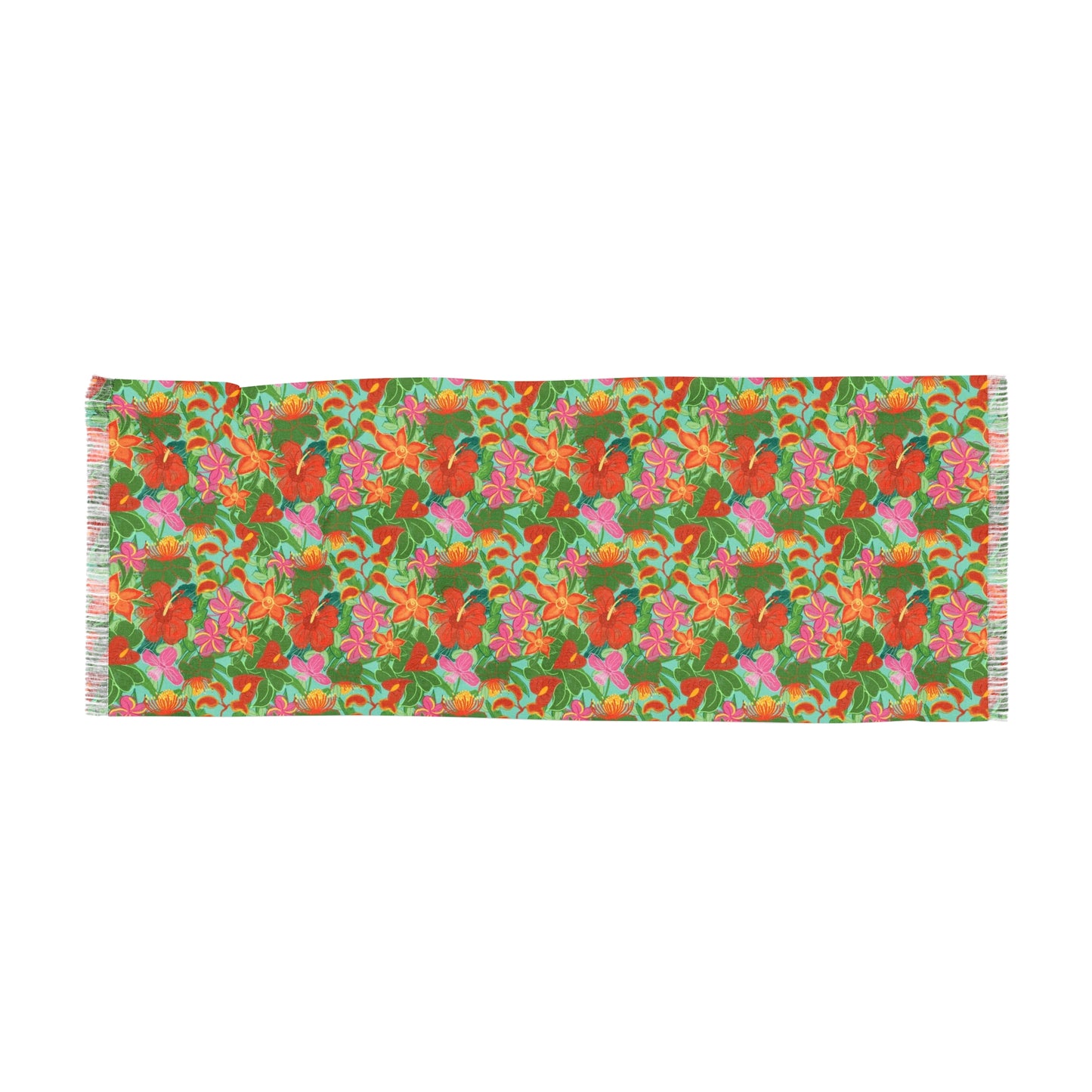 Introducing our rectangular light scarf featuring the stunning "Tropical Flowers" design, showcasing a lively arrangement of tropical flowers including orange hibiscus, pink orchids, orange allamanda, orange and yellow protea, pink plumeria, red heliconia, and red flamingo flowers against a refreshing aqua background. Crafted from lightweight and breathable fabric, this scarf adds a touch of tropical elegance to any outfit. Its versatile rectangular shape allows for various styling options, from draping it over the shoulders to knotting it around the neck. Whether you're strolling along the beach or attending a garden party, this scarf is the perfect accessory to complement your look with vibrant flair.