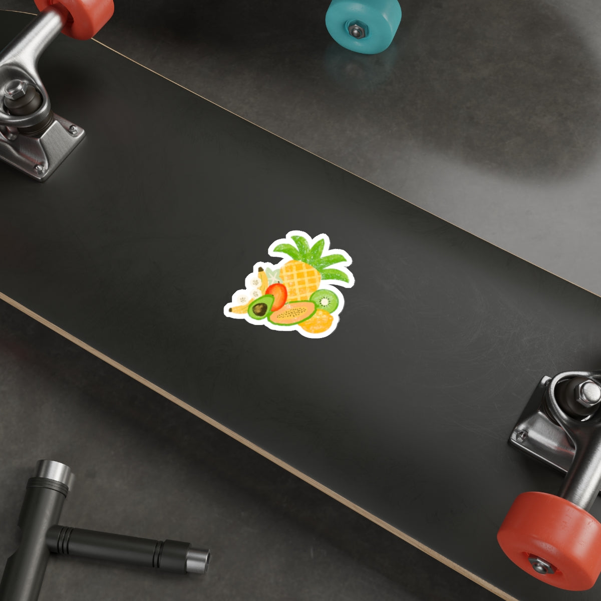 Introducing our vibrant and delectable tropical fruits die-cut sticker featuring a lively illustration of a pineapple, mango, starfruit, banana with slices, avocado, kiwi slice, papaya, and lemon. Perfect for adding a burst of tropical flavor to your laptop, water bottle, notebook, or any surface craving some fruity zest. Stick them on your travel gear to evoke memories of sunny beaches, adorn your planner for a daily dose of freshness, or gift them to fruit-loving friends for a delightful surprise. These stickers are durable, waterproof, and peel off easily, making them versatile for all your sticker needs. Embrace the tropical vibes wherever you go with these vibrant fruit stickers. Suitable for indoor and outdoor use