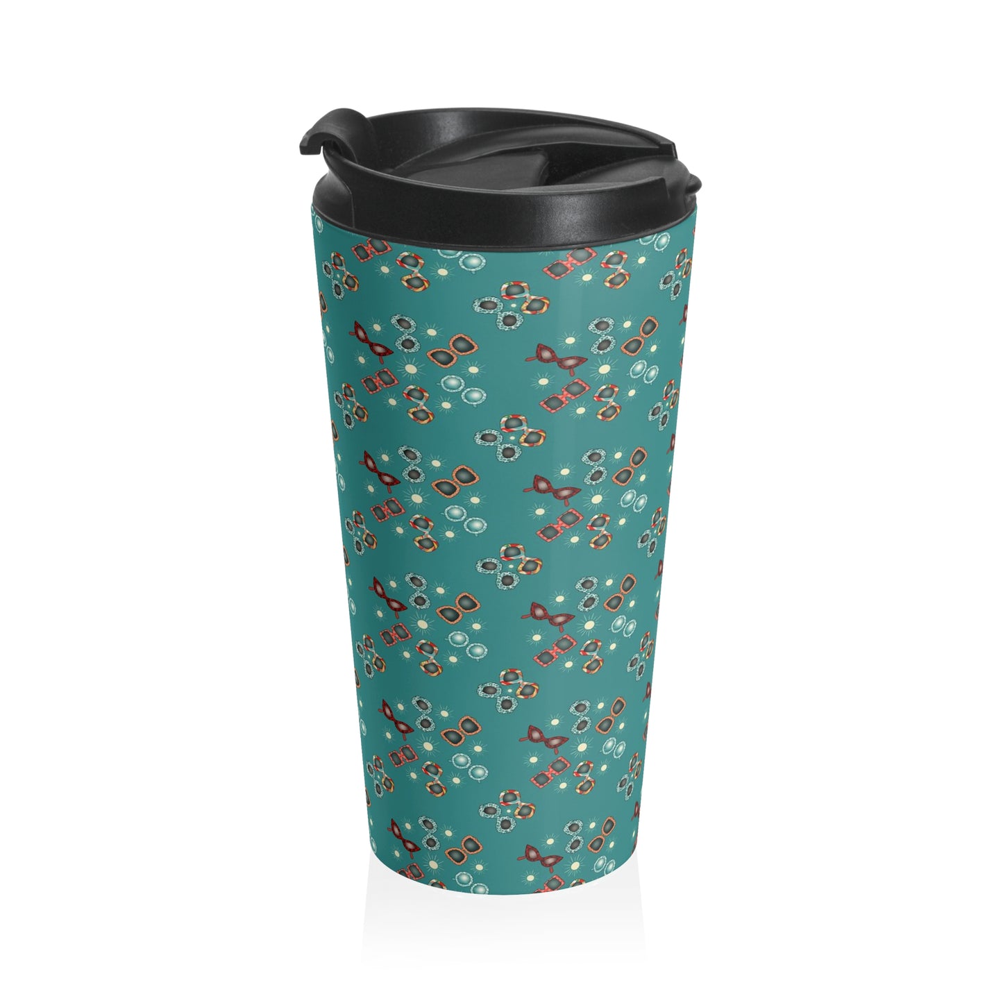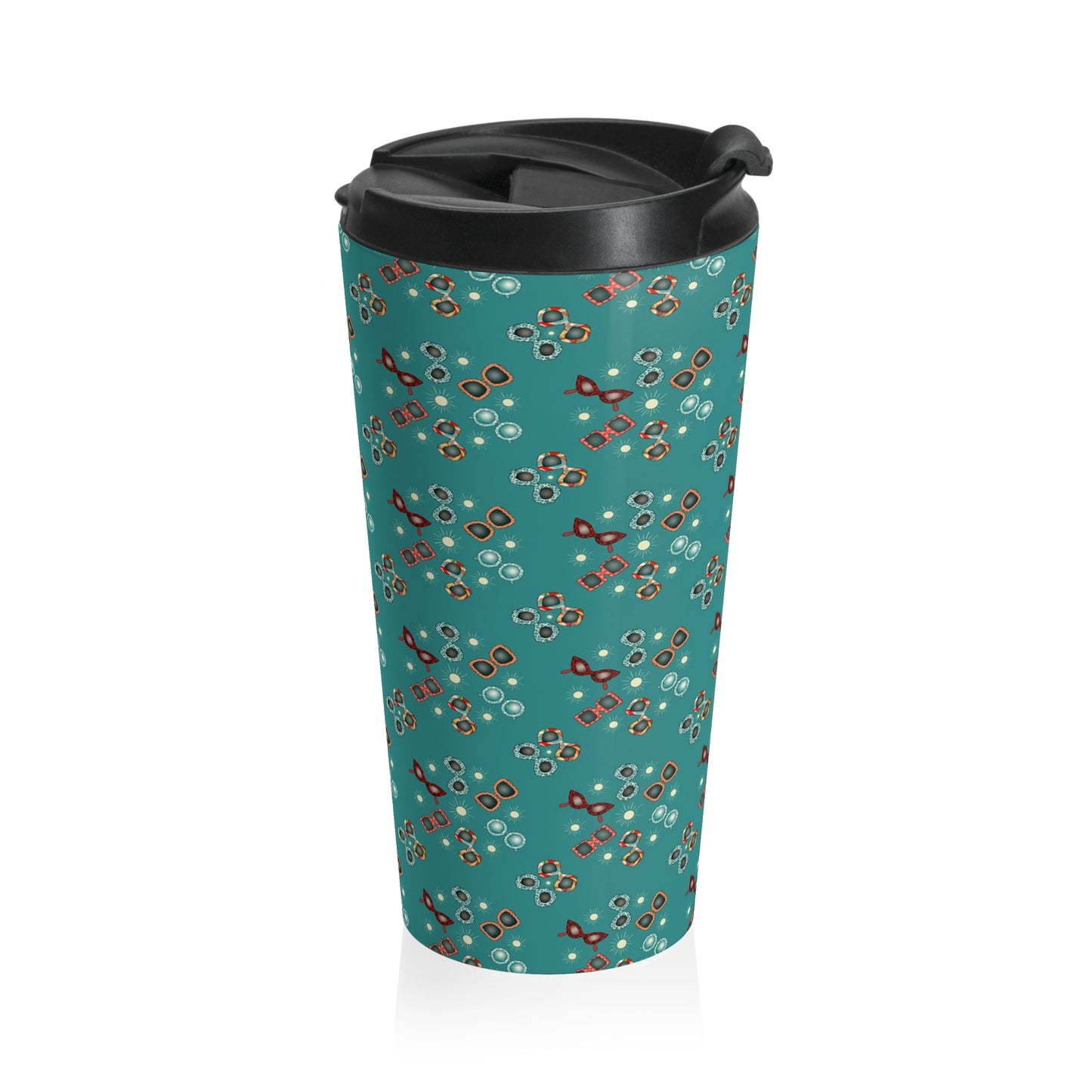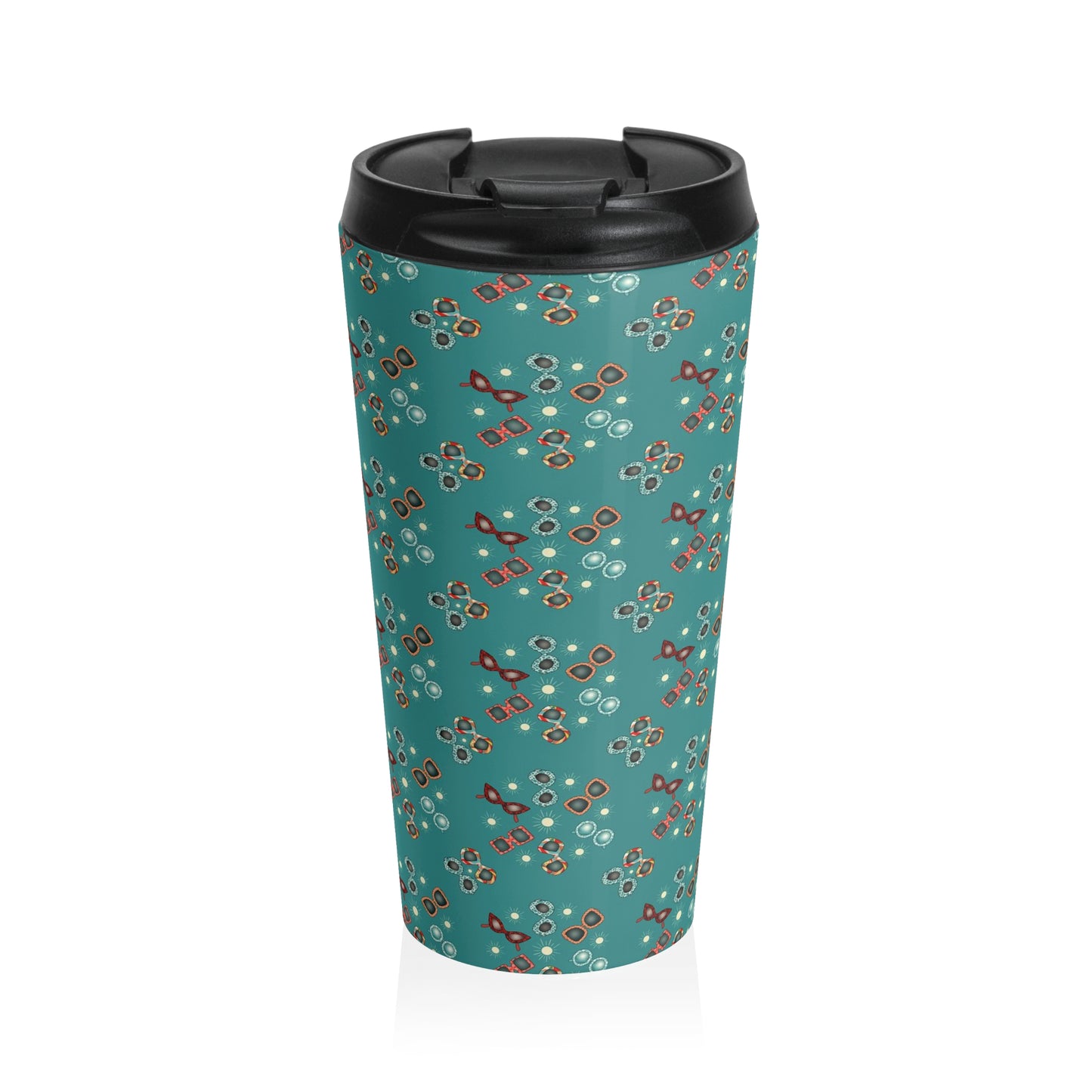 Introducing our 70s themed vintage sunglasses design on a sleek 15 oz stainless steel travel mug. This design is perfect for anyone who wants to add some retro flair to their daily commute or outdoor adventures. The vibrant colors and funky shapes of the sunglasses are sure to turn heads and make a statement..: Stainless steel