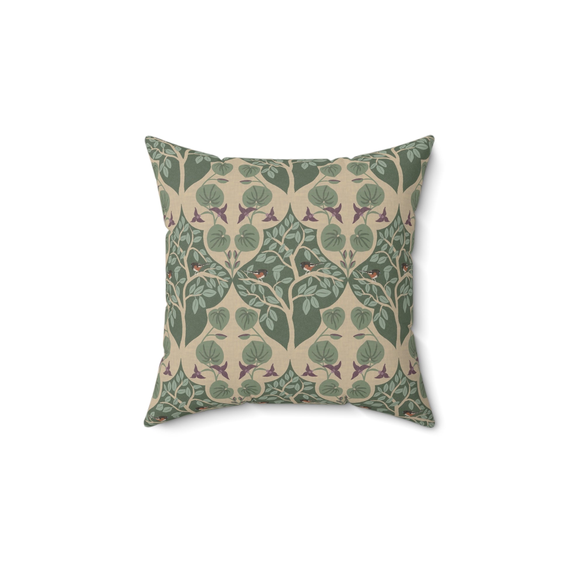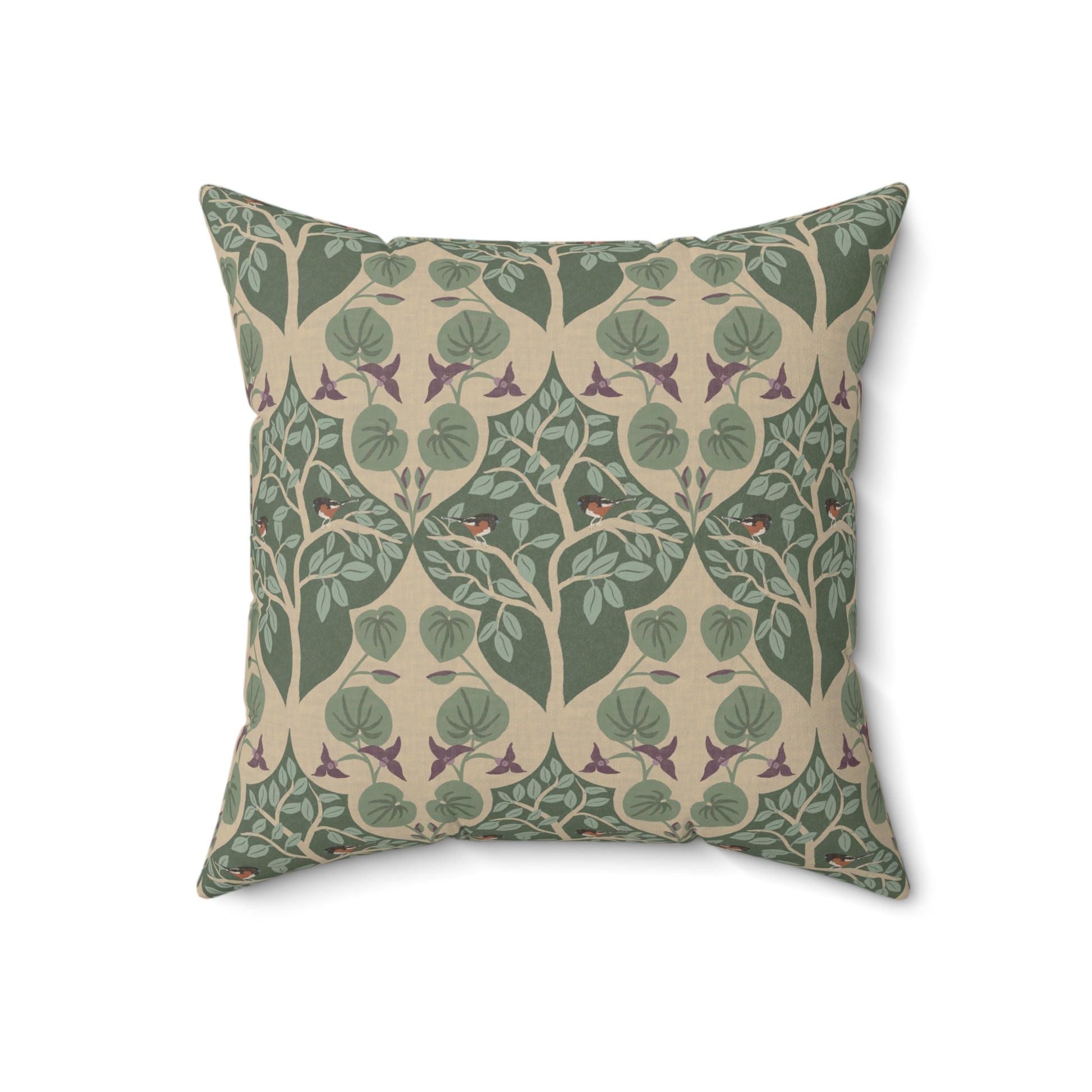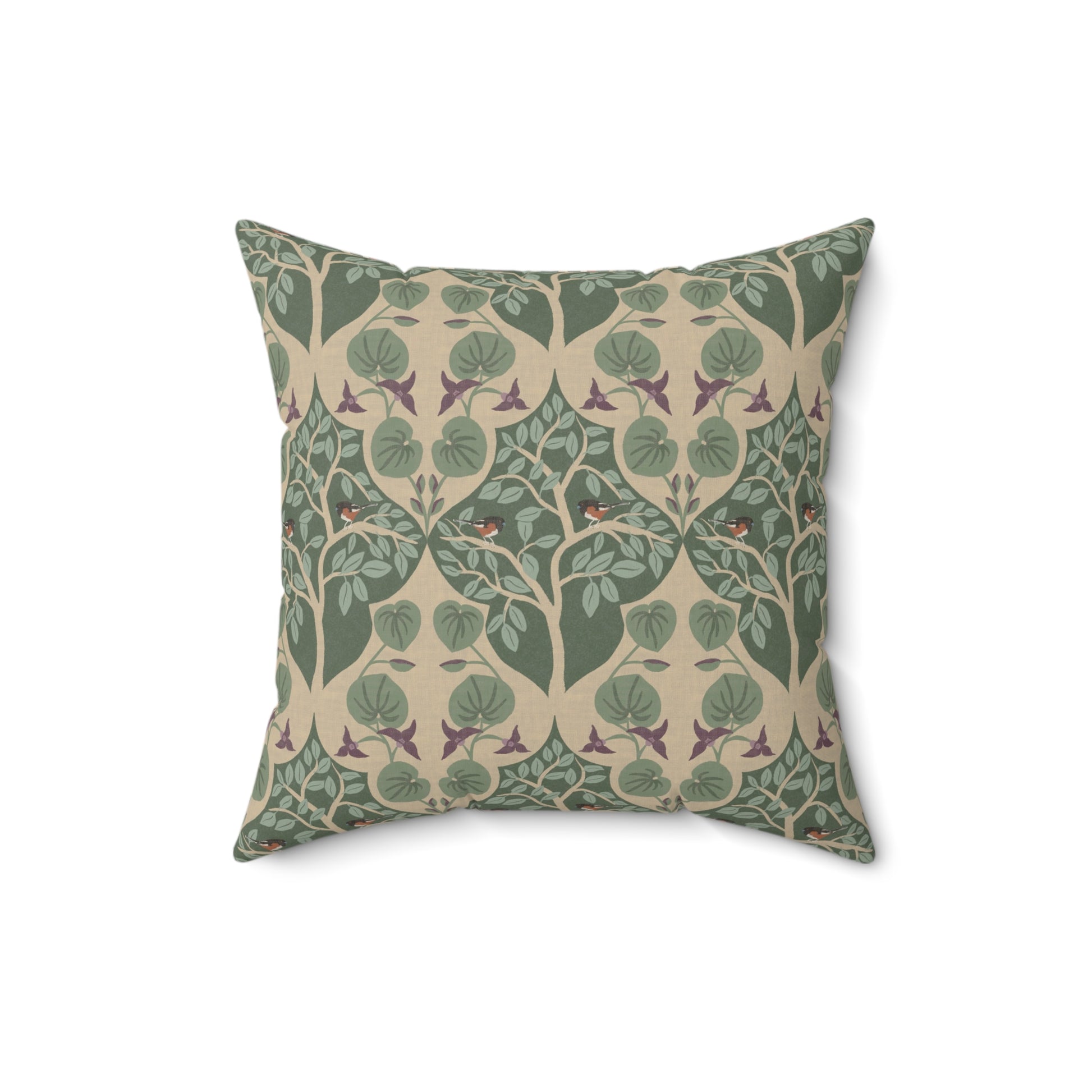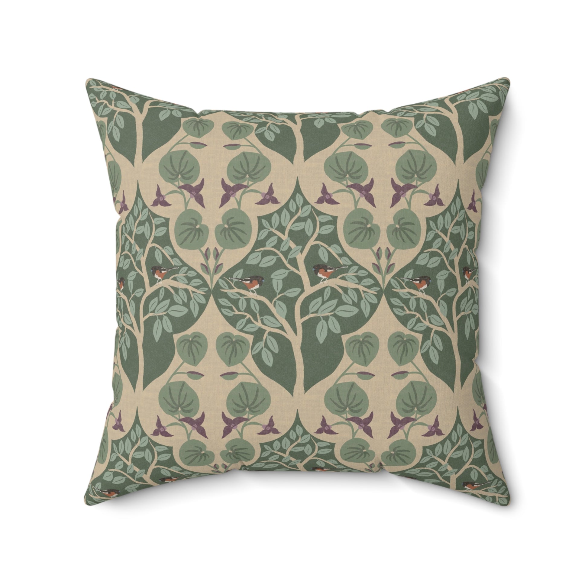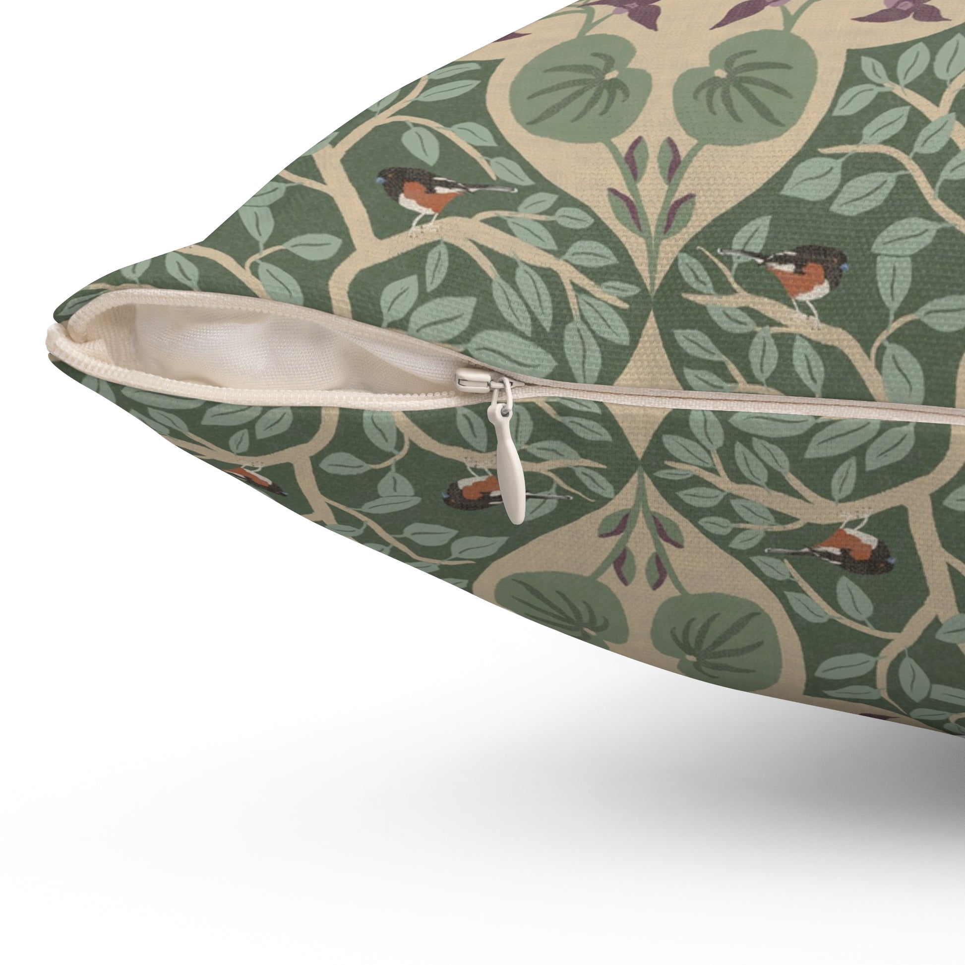 Wild Ginger, Beech Tree and Towhee Sparrows Spun Polyester Square Pillow
