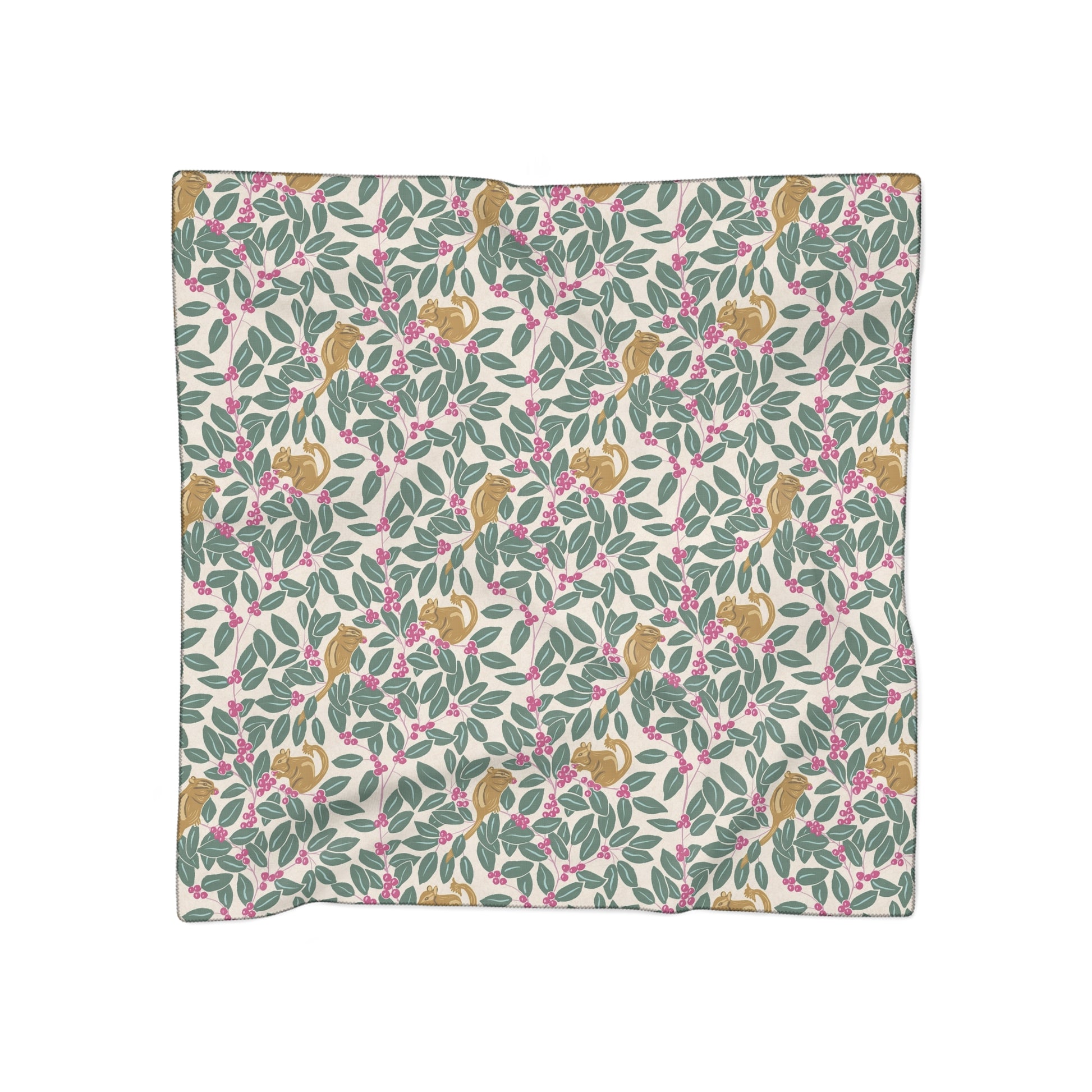 Wrap yourself in woodland charm with this square scarf featuring your trailing wintergreen (teaberry) plant design, inspired by the quiet forest floors of Northeast Tennessee. Soft green leaves and delicate pink berries wind gently across the fabric, while two raw-umber chipmunks explore the vines, capturing the playful energy of autumn and winter in the Appalachian woods.