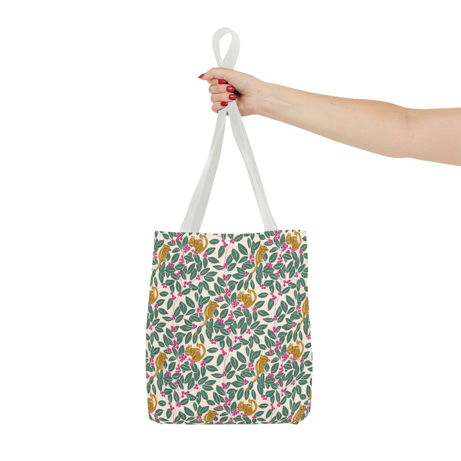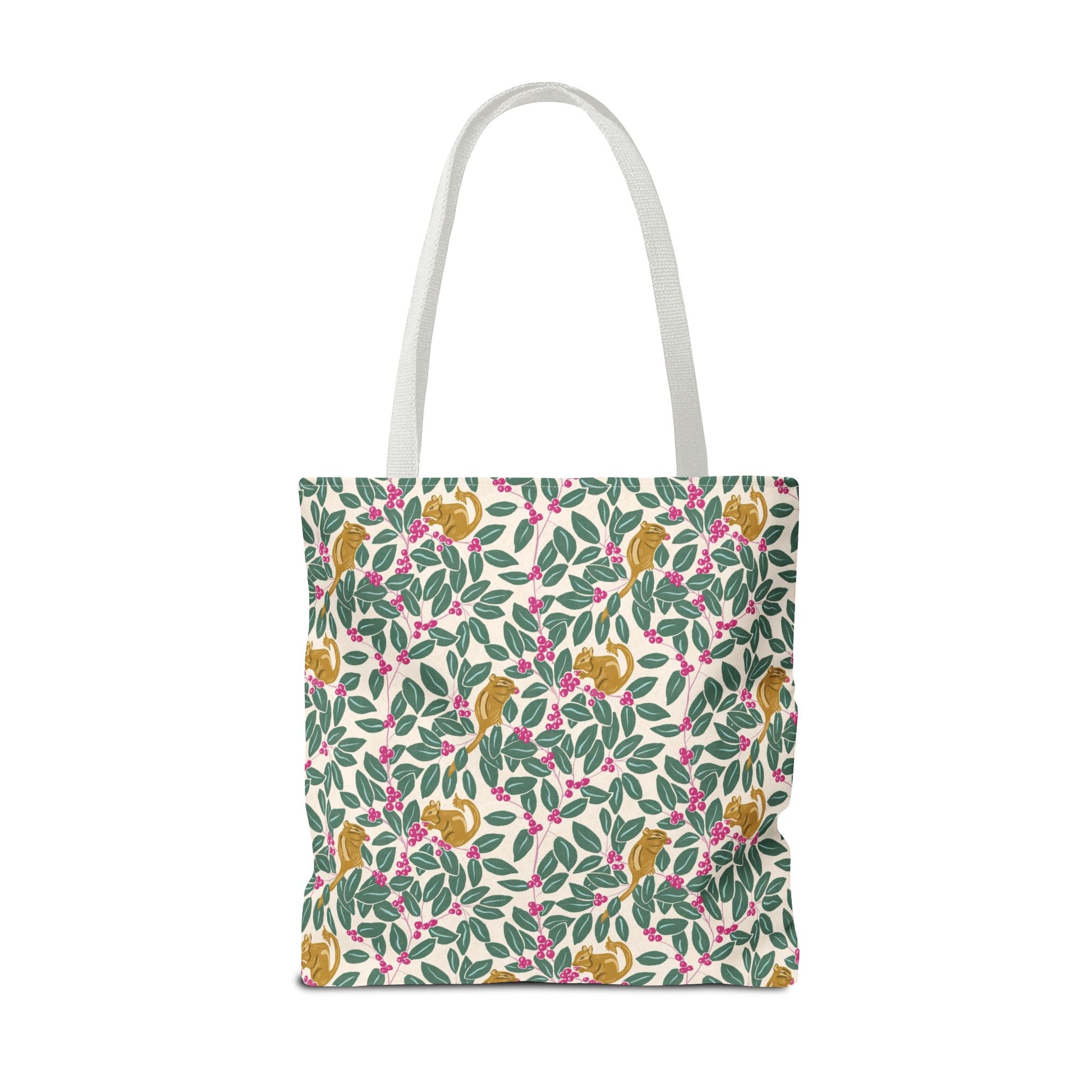 Bring a touch of Appalachian forest charm everywhere you go with this tote bag featuring my trailing wintergreen (teaberry) plant and chipmunk design. The wintergreen’s green leaves and soft pink berries weave gently across the bag, creating a flowing botanical pattern inspired by plants found in the wild forests of Northeast Tennessee. Two chipmunks—drawn in warm raw umber—peek out from the foliage, capturing the playful moment when chipmunks forage on wintergreen berries through fall and winter.