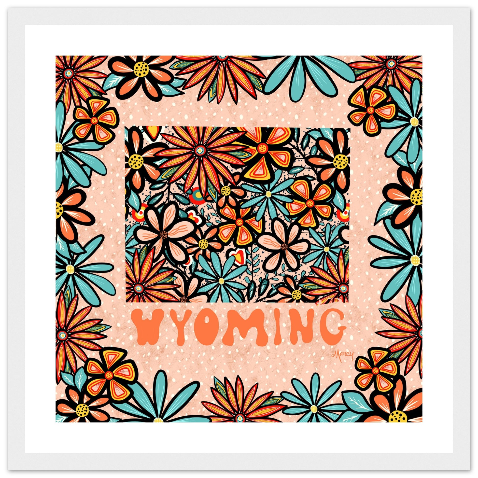 This Wyoming state design features an original illustration created by designer Marcy Brennan Art. The illustration employs a 70’s retro ‘flower power’ pattern and color palette with playful 70’s inspired hand-lettering spelling out ‘Wyoming’ in orange. The design is set on a peach background. The perfect gift for a Wyomingite.