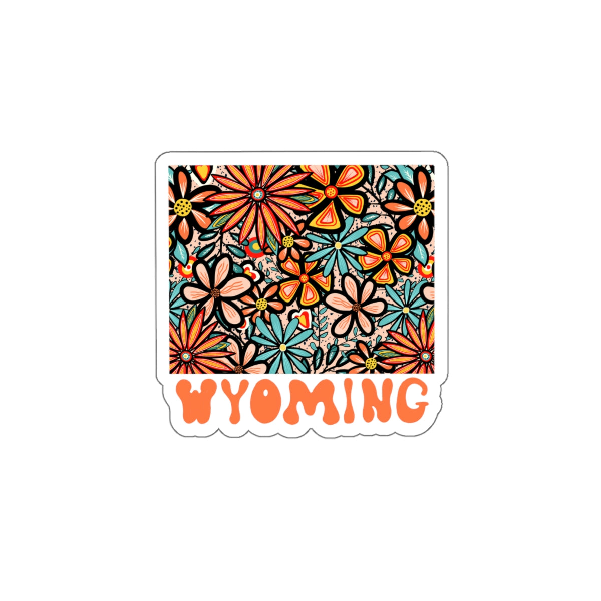 Wyoming State Sticker | Vinyl Artist Designed Illustration Featuring Wyoming State Filled With Retro Flowers with Retro Hand-Lettering Die-Cut Stickers