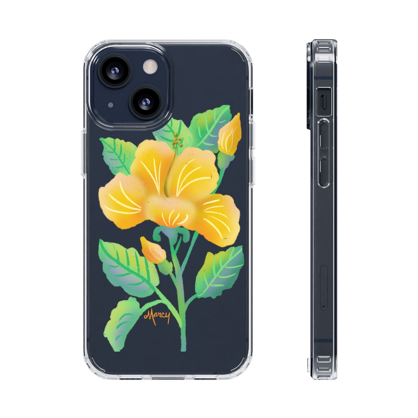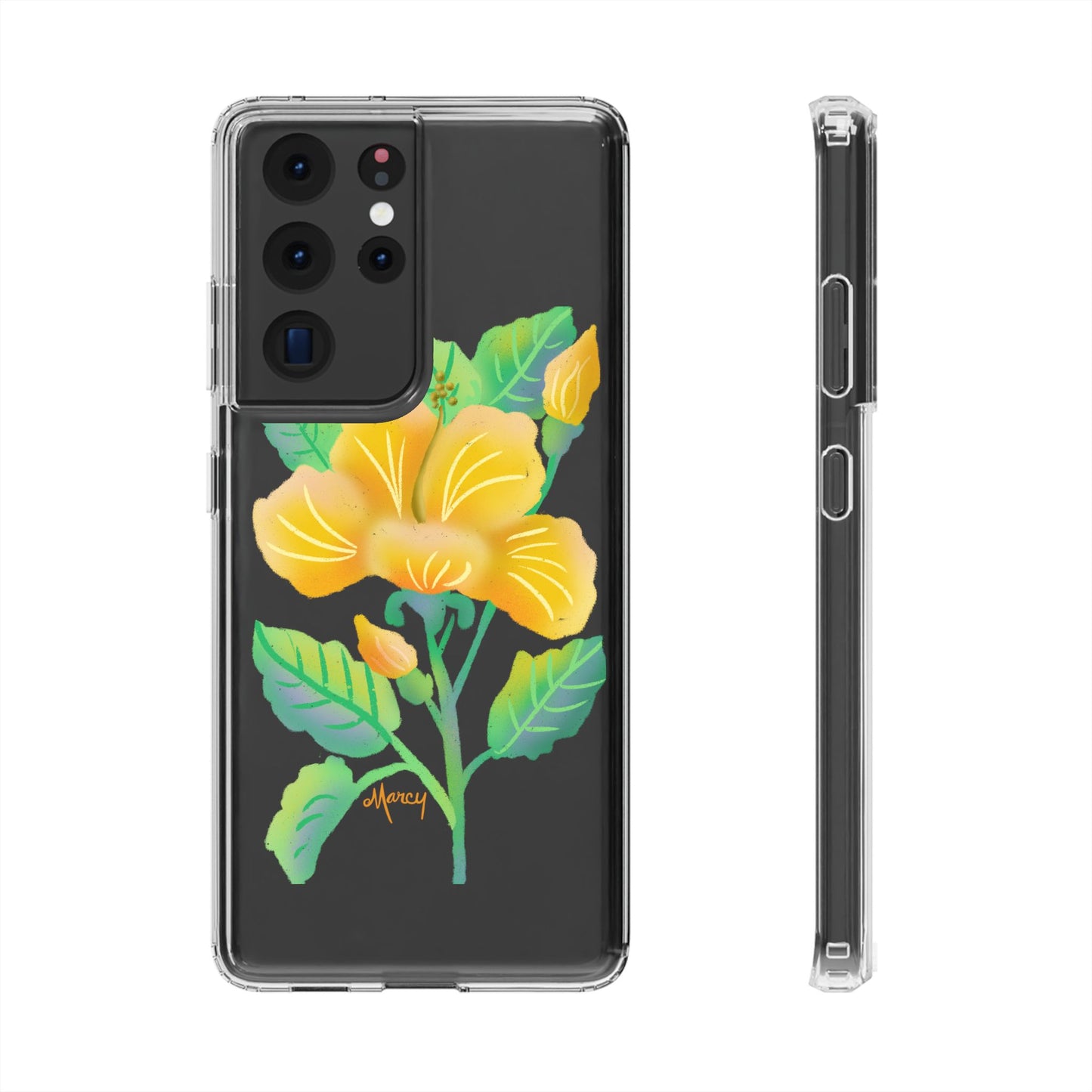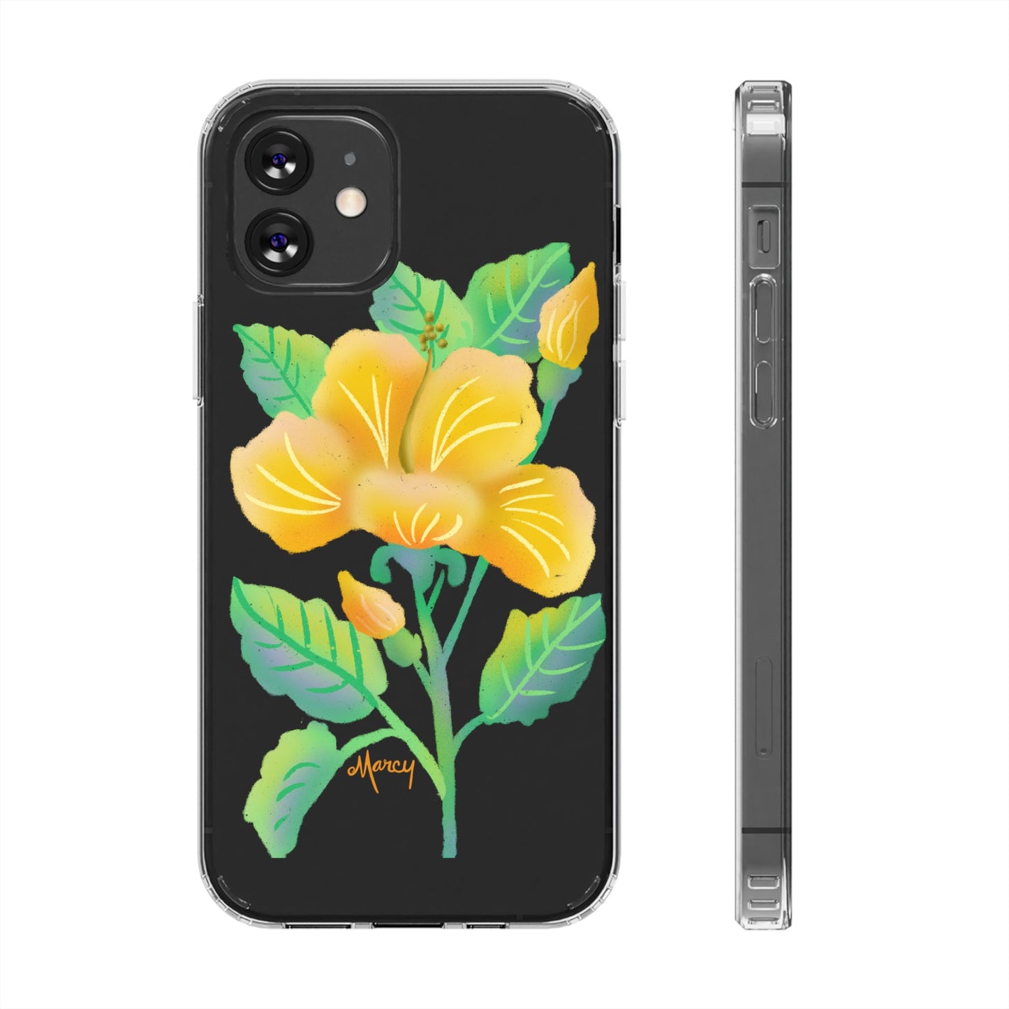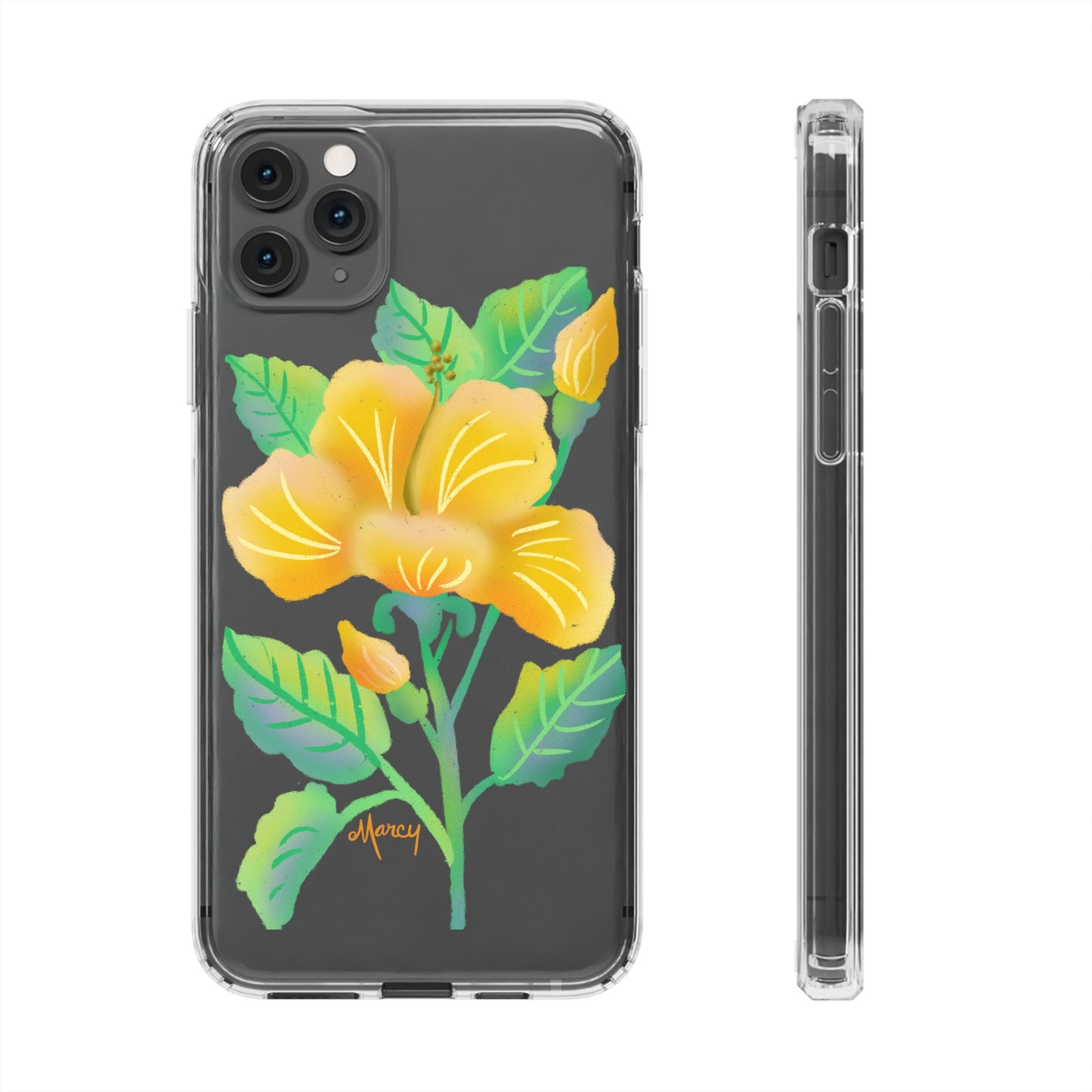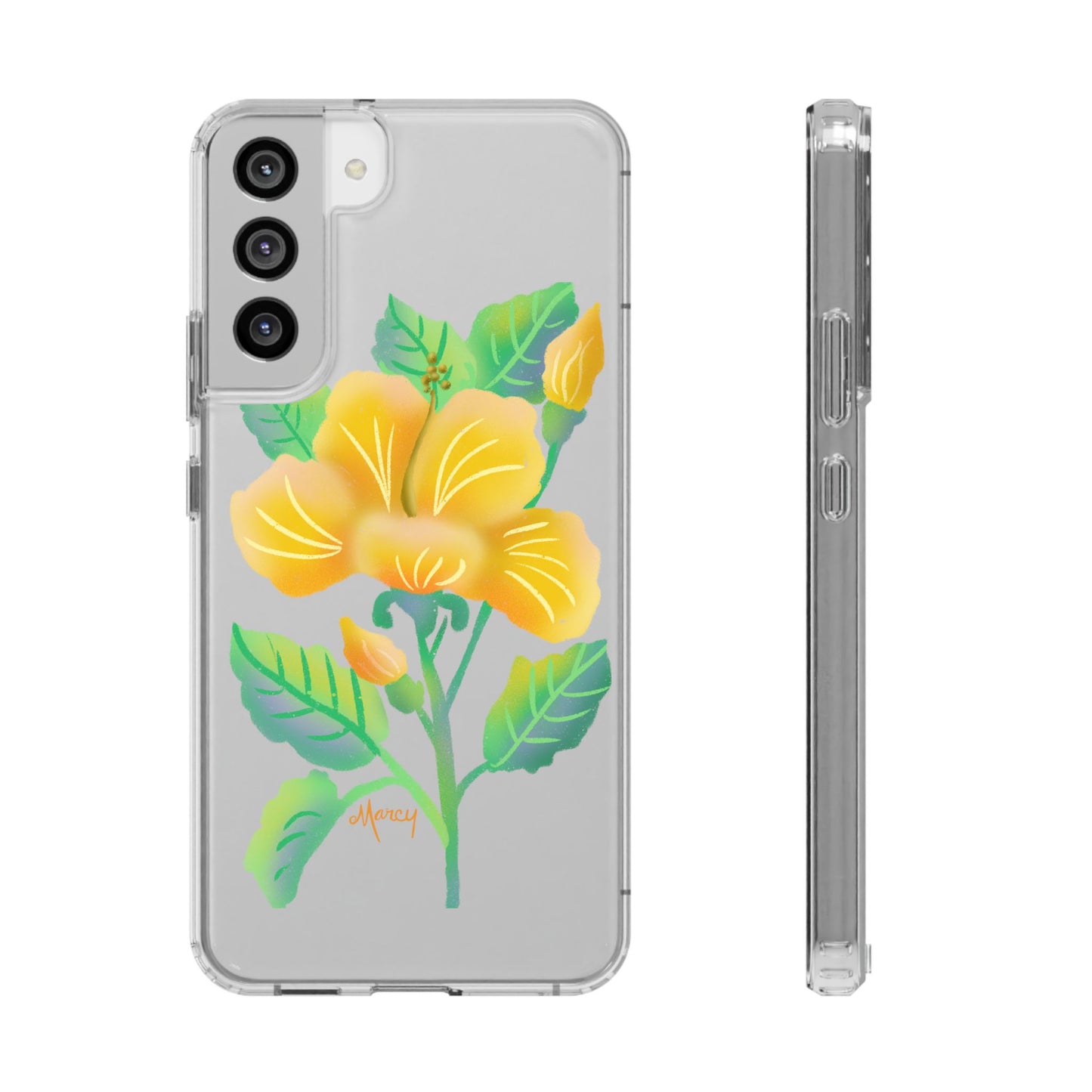 Bring the tropics to your everyday with this pretty yellow hibiscus blossom. This clear phone case comes to protect both your phone's surface and its aesthetics. The crystal clear polycarbonate case is flexible, crack and chip-resistant, as well as co-molded with TPU cushioned edges on the side. This gives protection against scratches and minor bumps while still keeping your phone's slim profile intact. Each case features open ports for hassle-free connectivity.