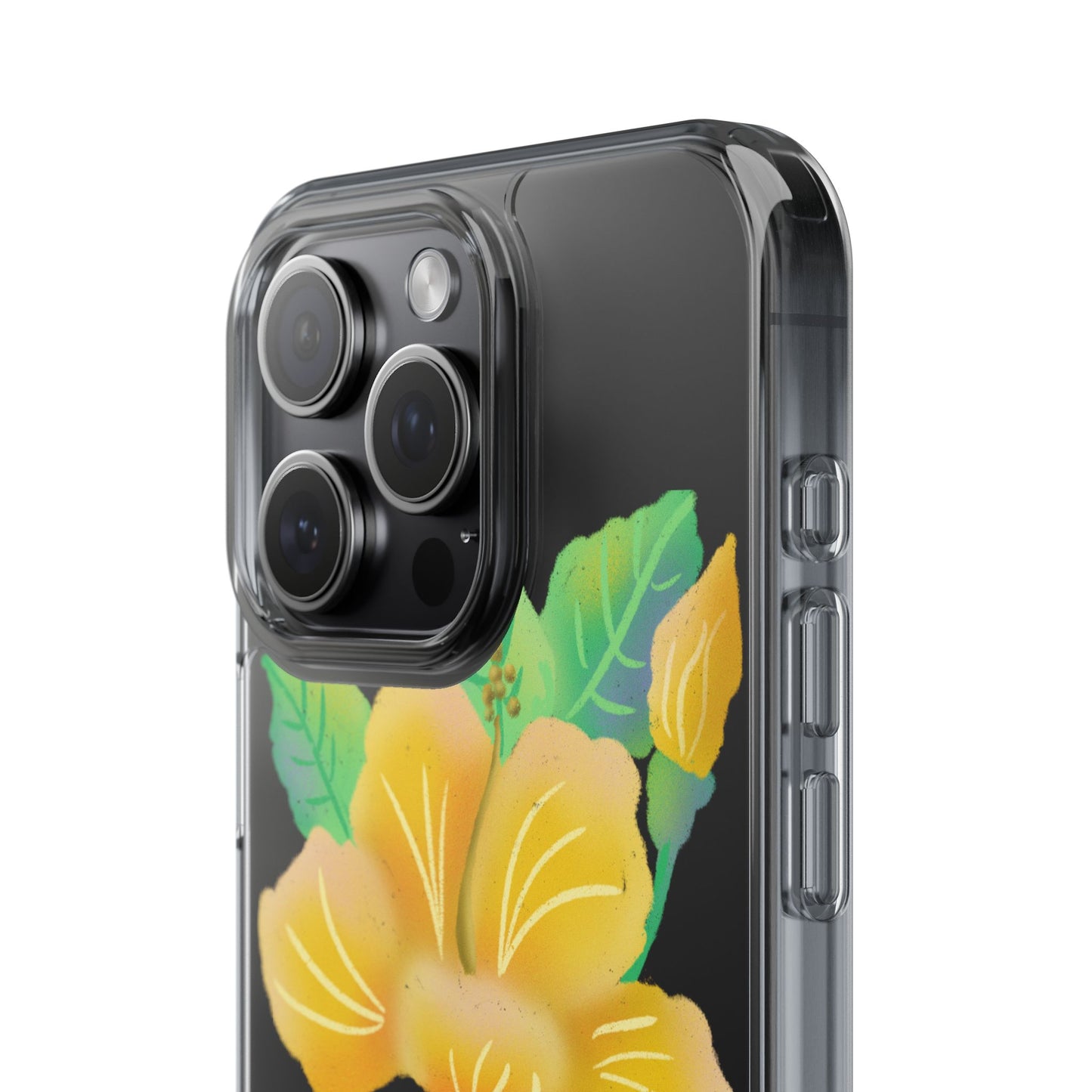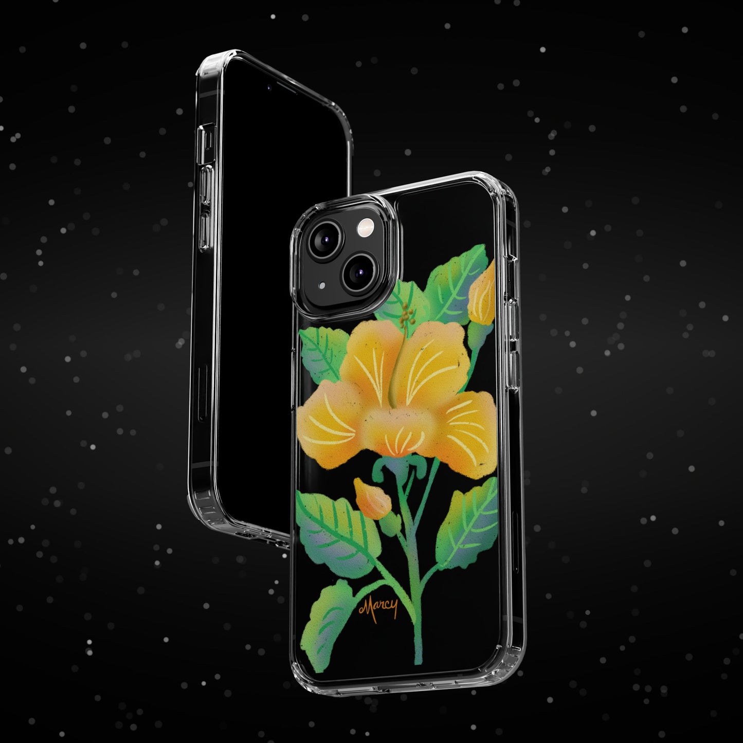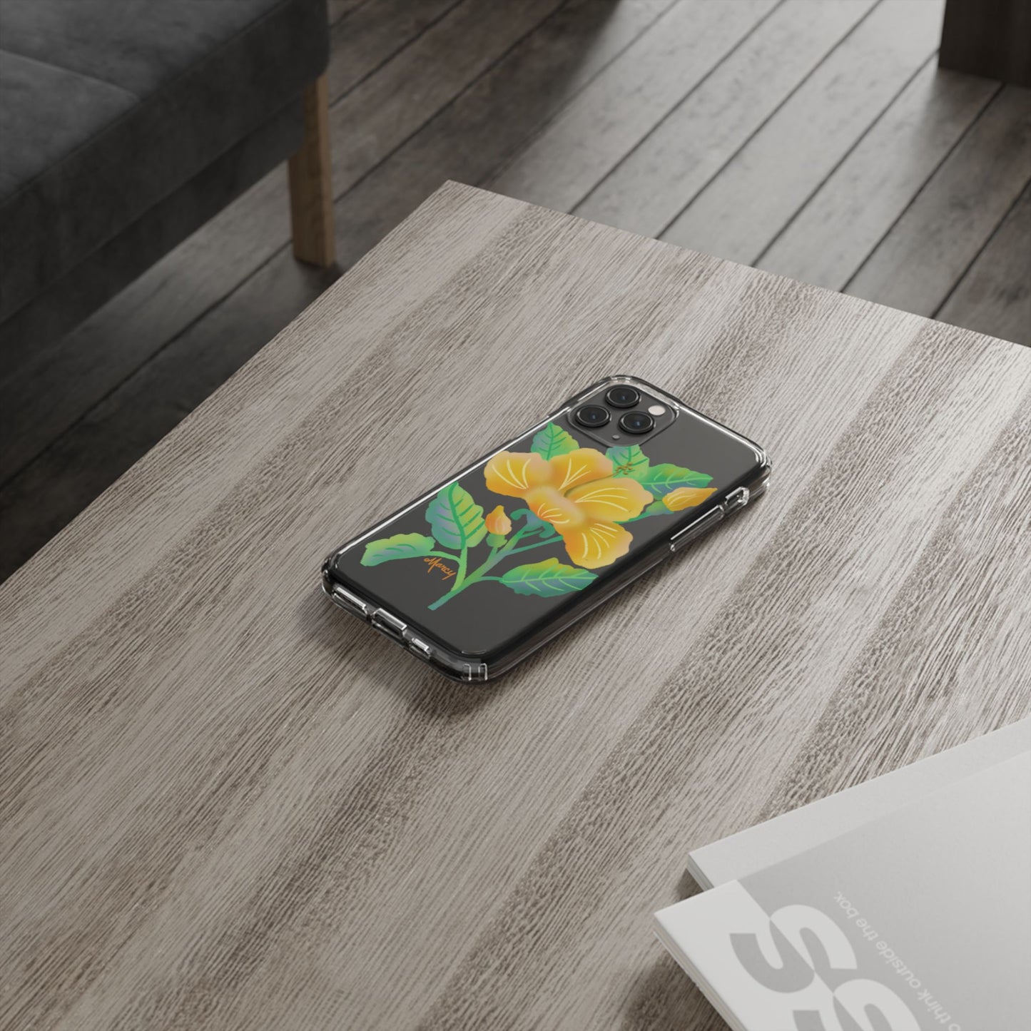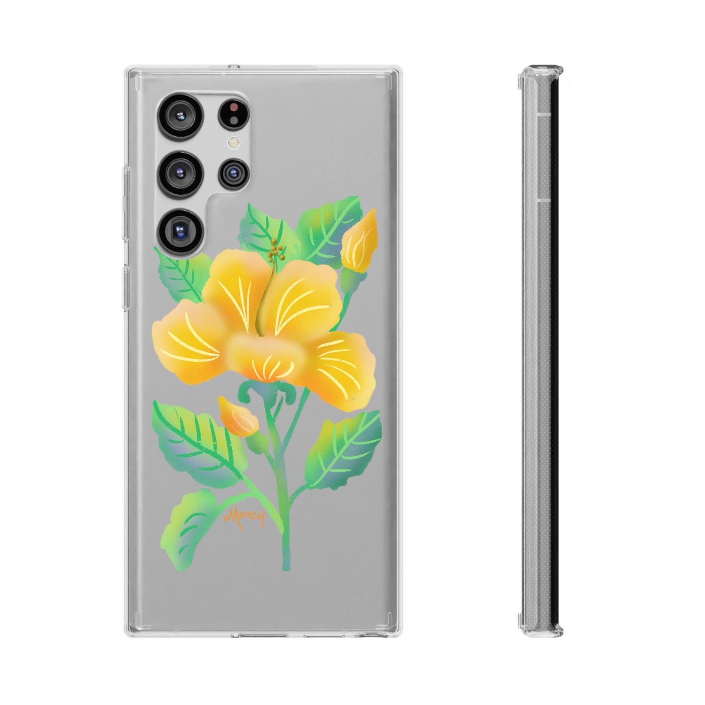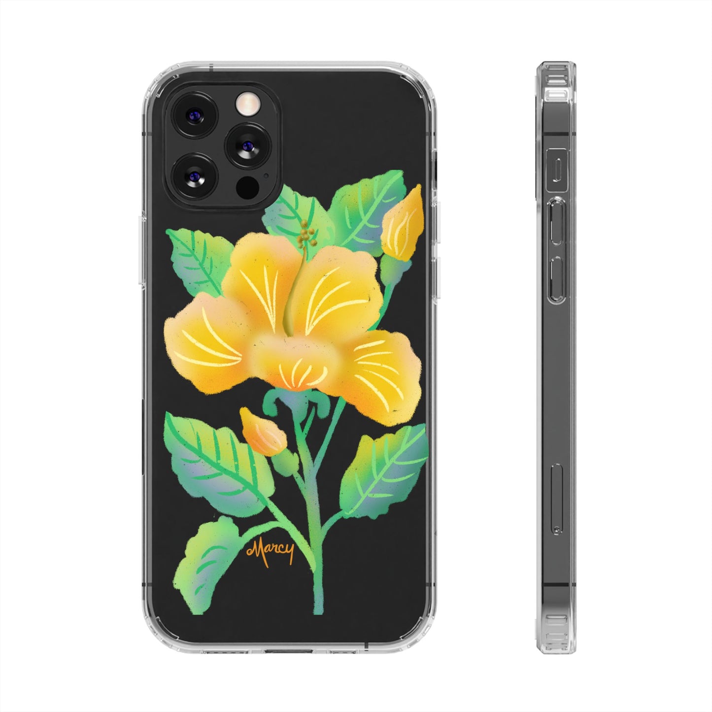 Bring the tropics to your everyday with this pretty yellow hibiscus blossom. This clear phone case comes to protect both your phone's surface and its aesthetics. The crystal clear polycarbonate case is flexible, crack and chip-resistant, as well as co-molded with TPU cushioned edges on the side. This gives protection against scratches and minor bumps while still keeping your phone's slim profile intact. Each case features open ports for hassle-free connectivity.
