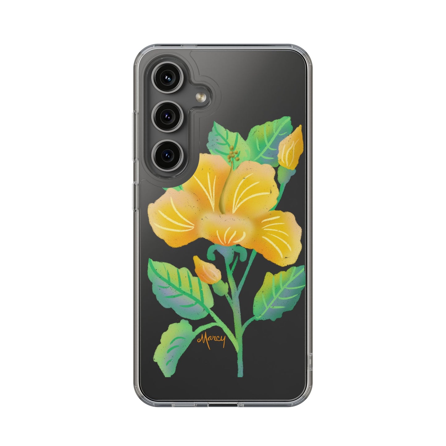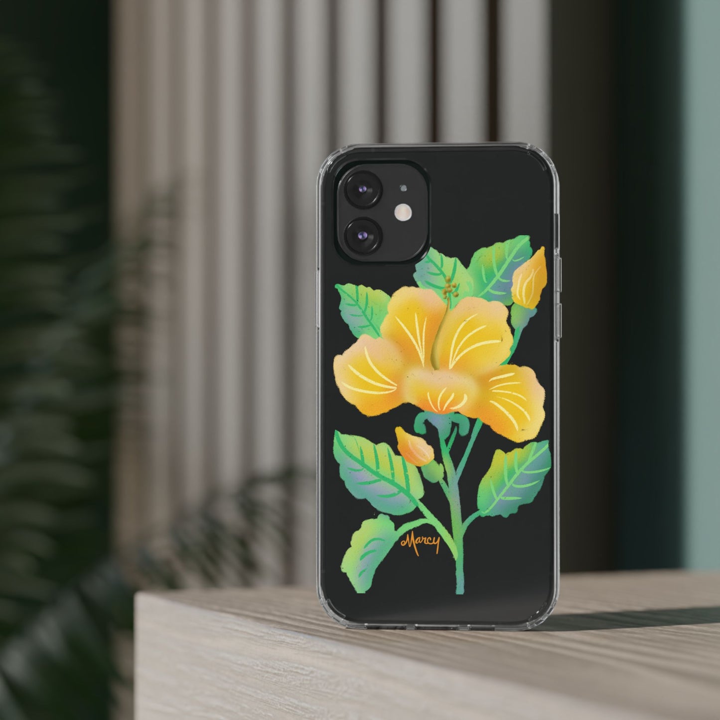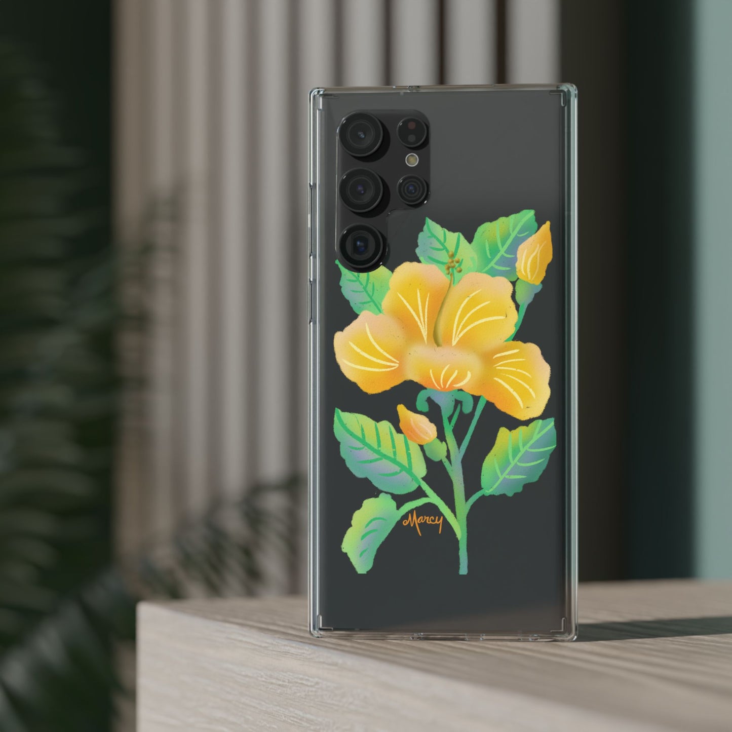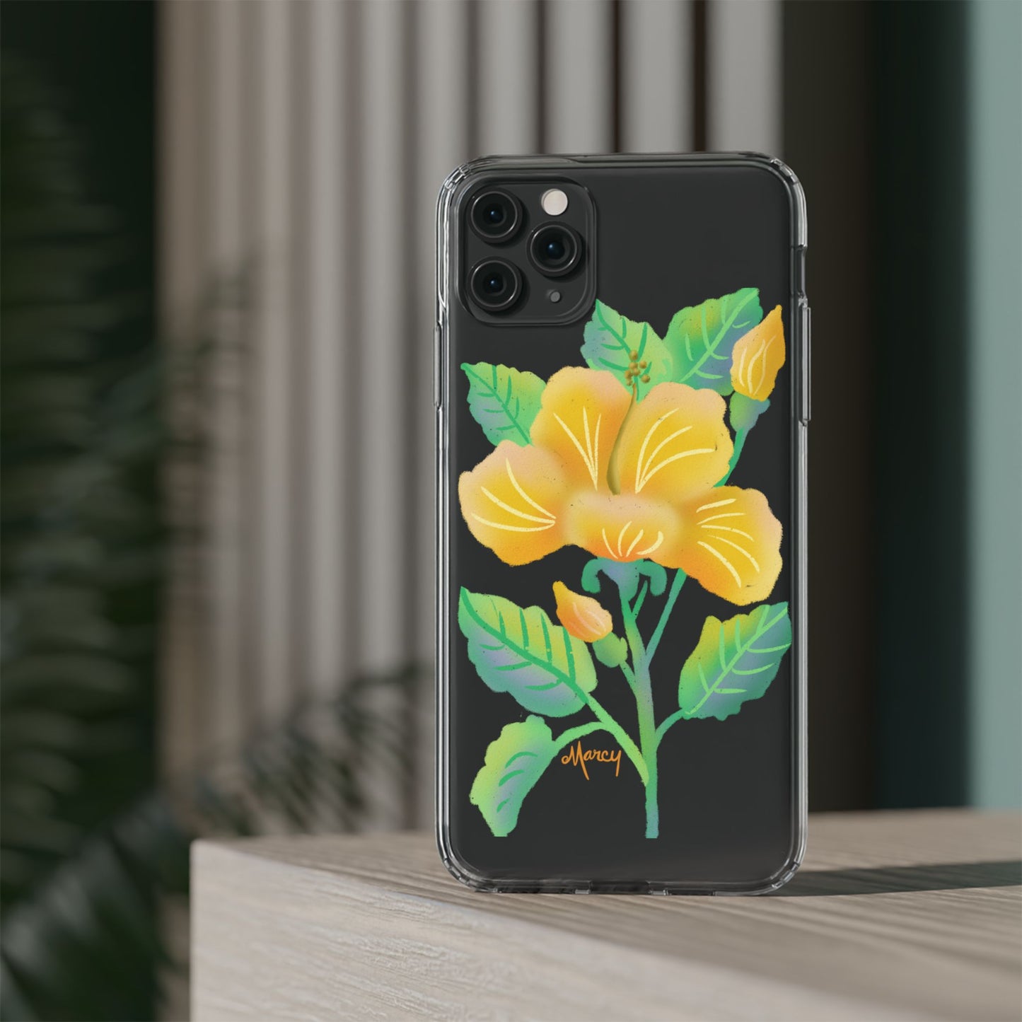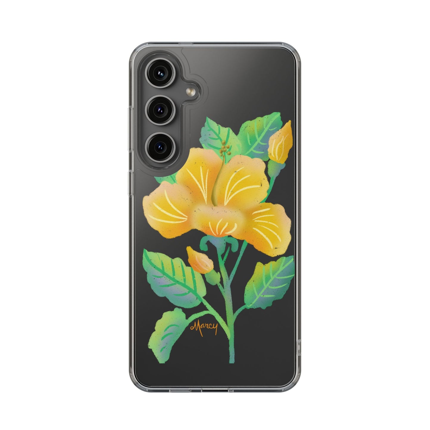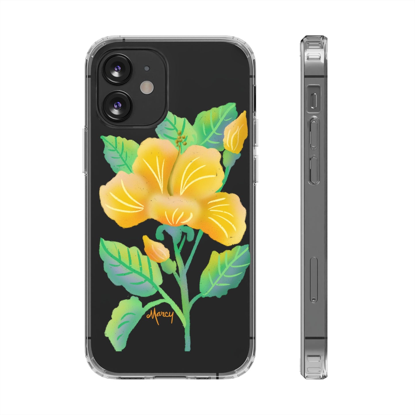 Bring the tropics to your everyday with this pretty yellow hibiscus blossom. This clear phone case comes to protect both your phone's surface and its aesthetics. The crystal clear polycarbonate case is flexible, crack and chip-resistant, as well as co-molded with TPU cushioned edges on the side. This gives protection against scratches and minor bumps while still keeping your phone's slim profile intact. Each case features open ports for hassle-free connectivity.