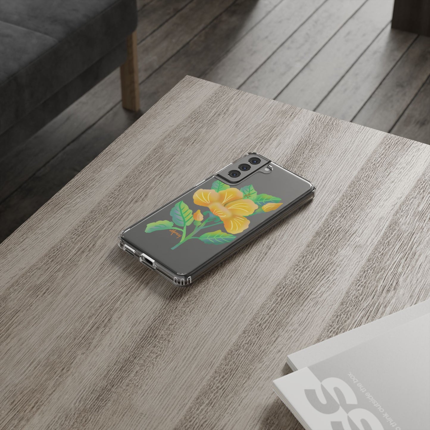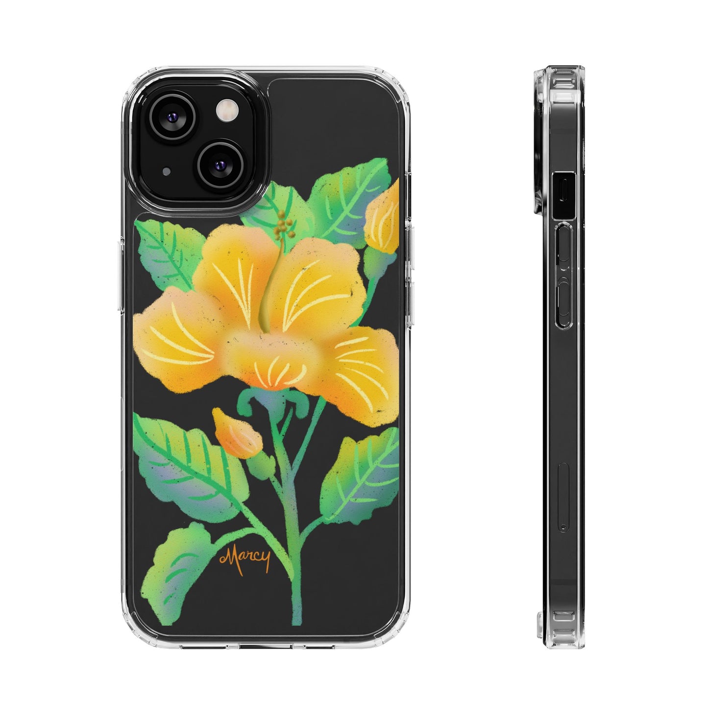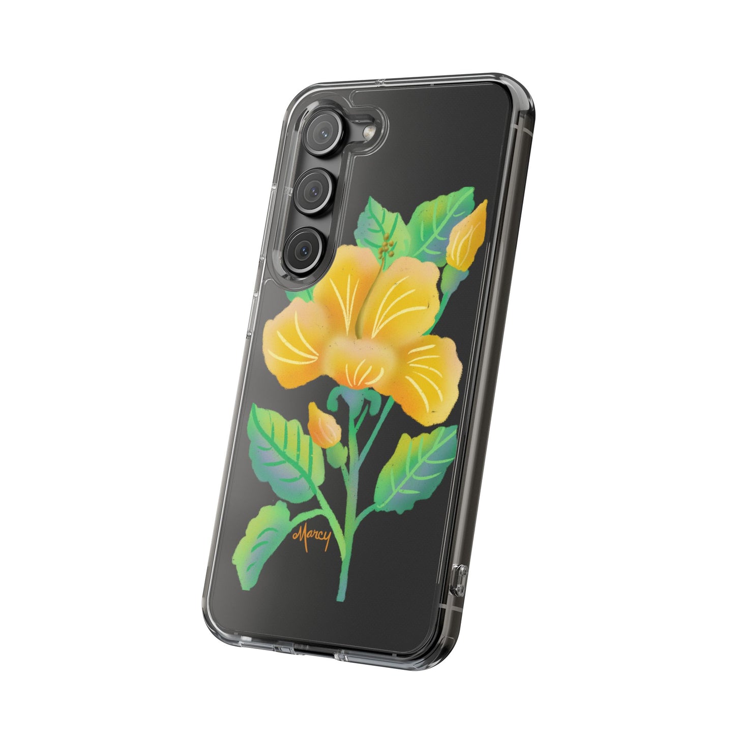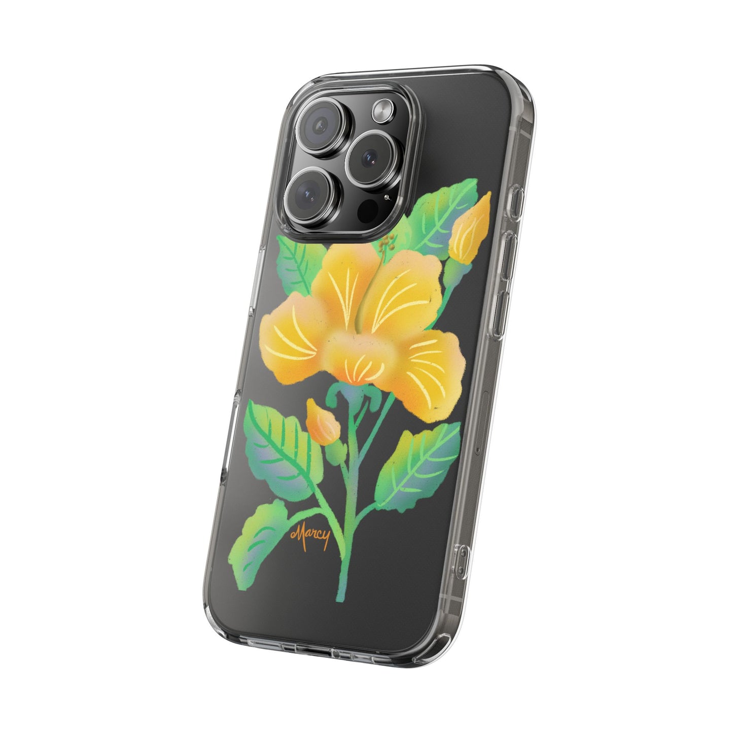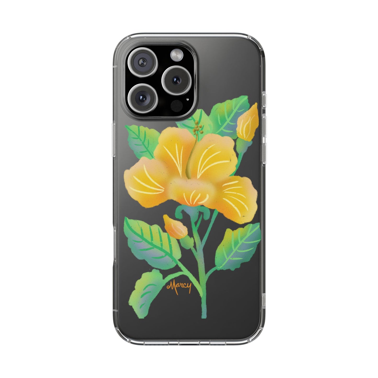 Bring the tropics to your everyday with this pretty yellow hibiscus blossom. This clear phone case comes to protect both your phone's surface and its aesthetics. The crystal clear polycarbonate case is flexible, crack and chip-resistant, as well as co-molded with TPU cushioned edges on the side. This gives protection against scratches and minor bumps while still keeping your phone's slim profile intact. Each case features open ports for hassle-free connectivity.