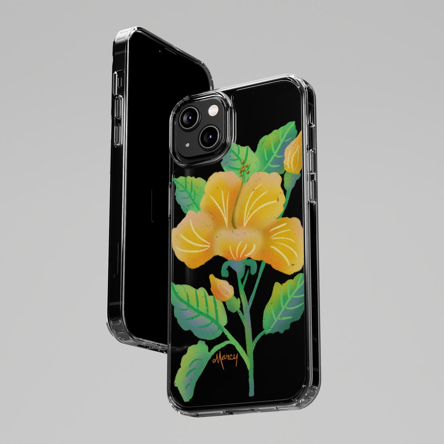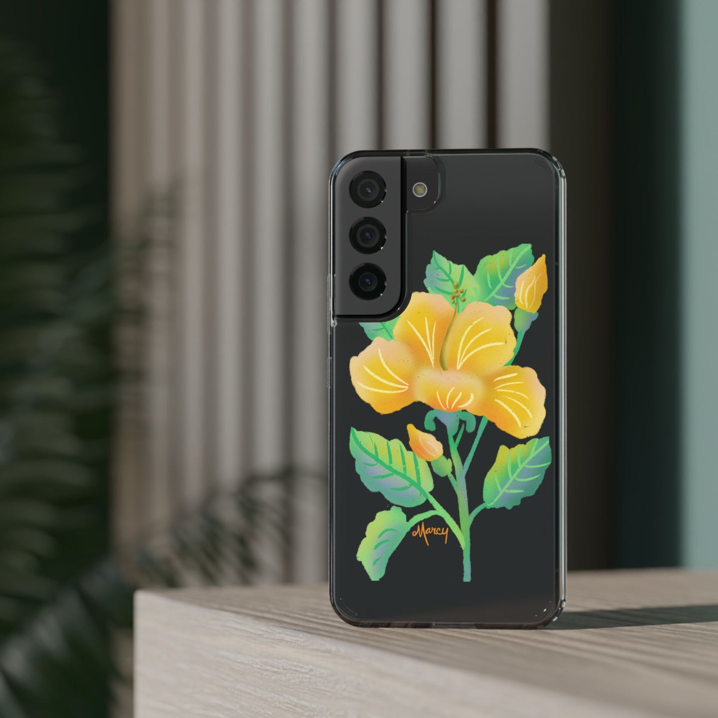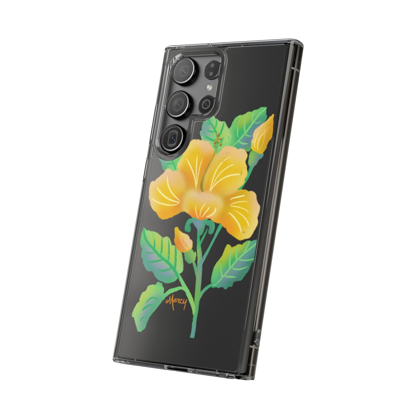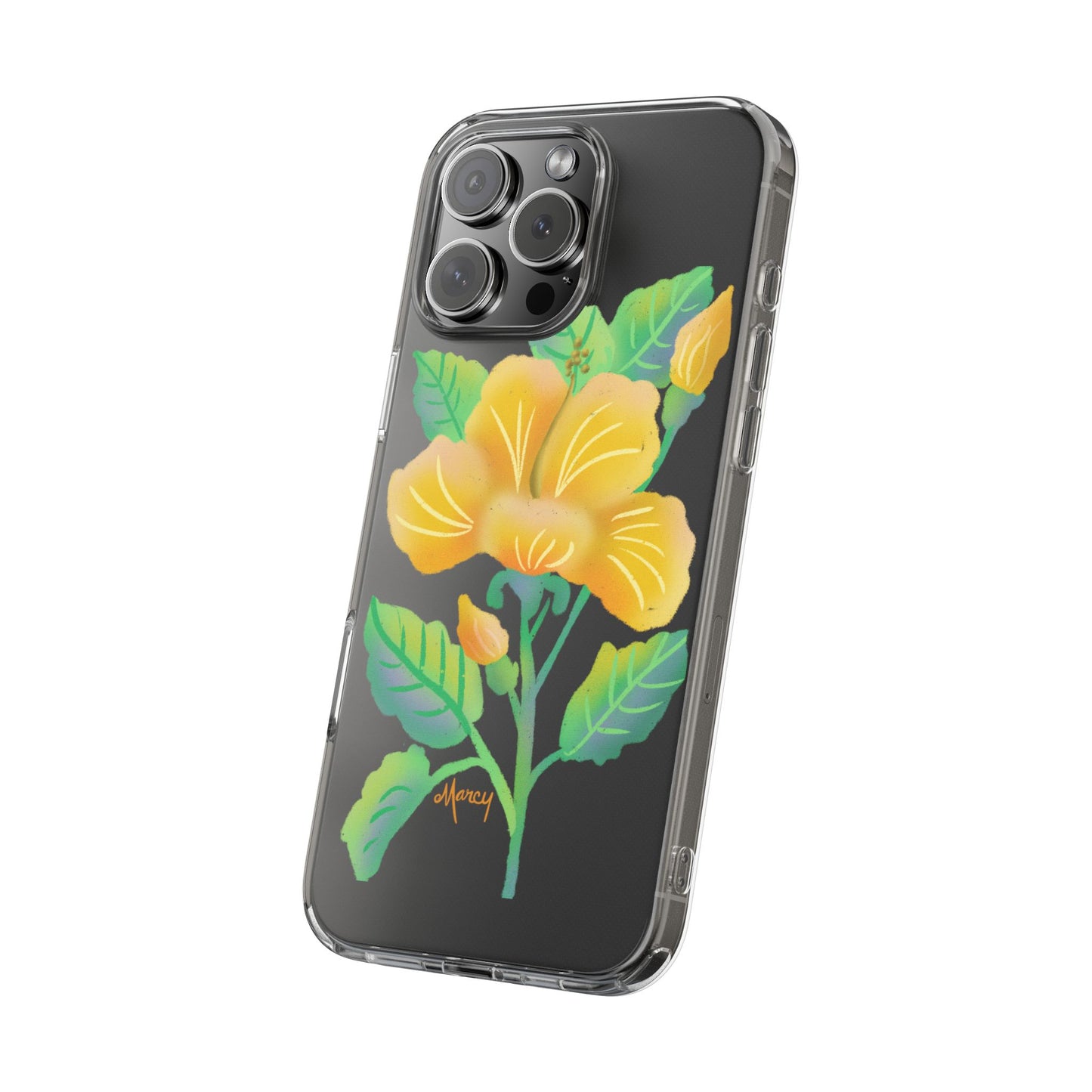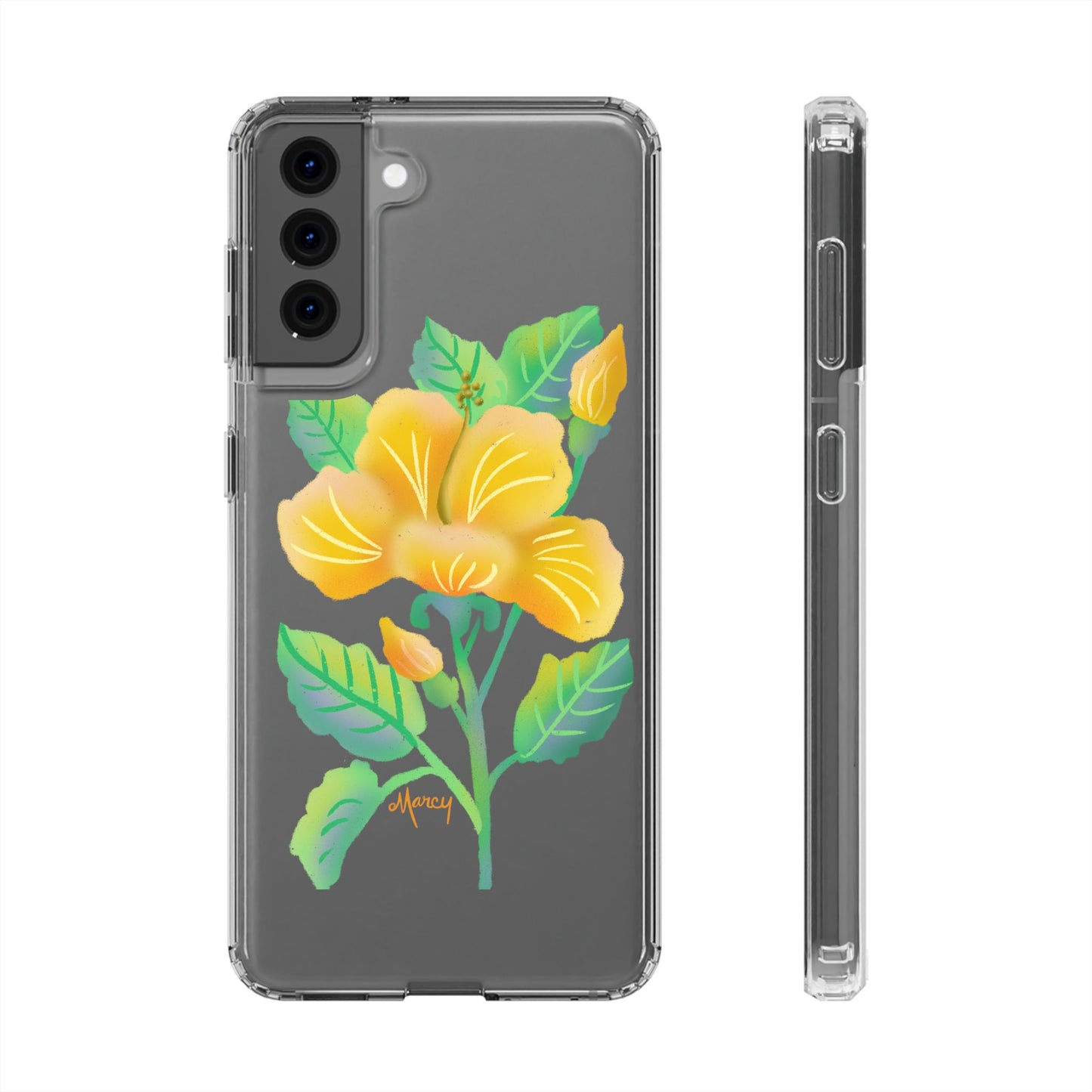 Bring the tropics to your everyday with this pretty yellow hibiscus blossom. This clear phone case comes to protect both your phone's surface and its aesthetics. The crystal clear polycarbonate case is flexible, crack and chip-resistant, as well as co-molded with TPU cushioned edges on the side. This gives protection against scratches and minor bumps while still keeping your phone's slim profile intact. Each case features open ports for hassle-free connectivity.