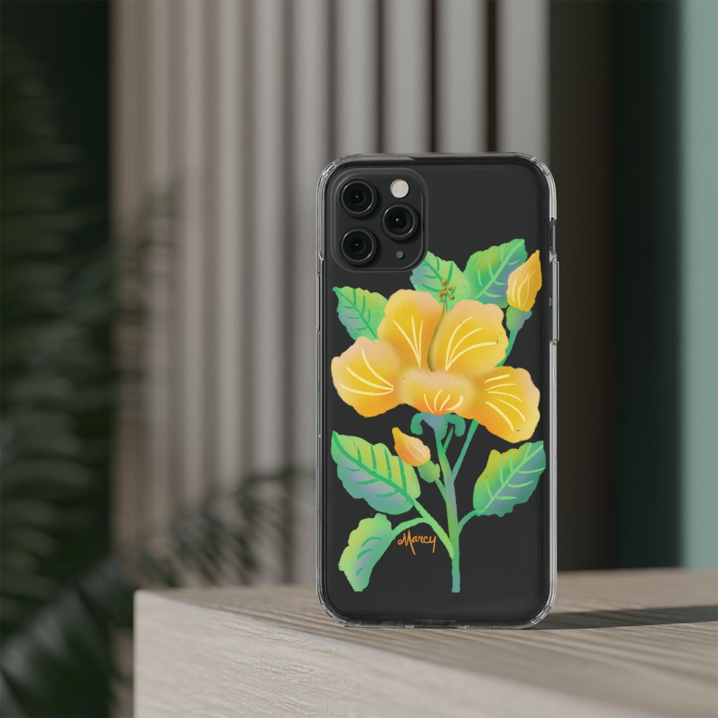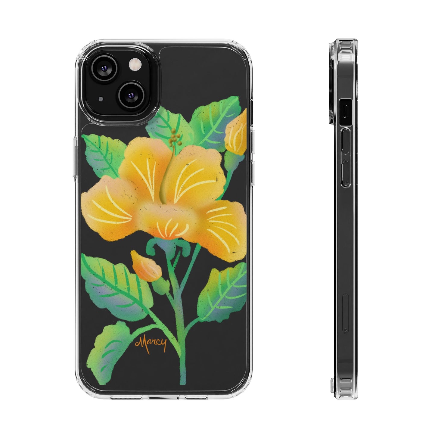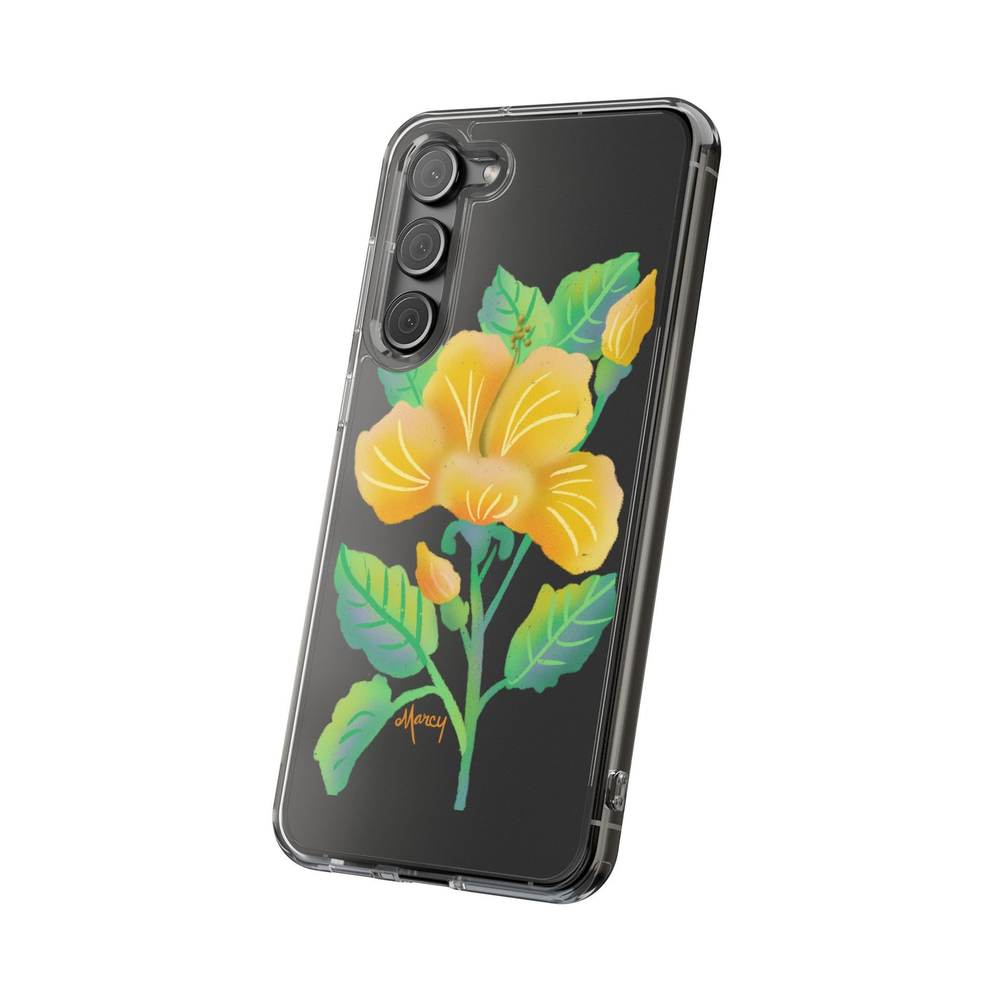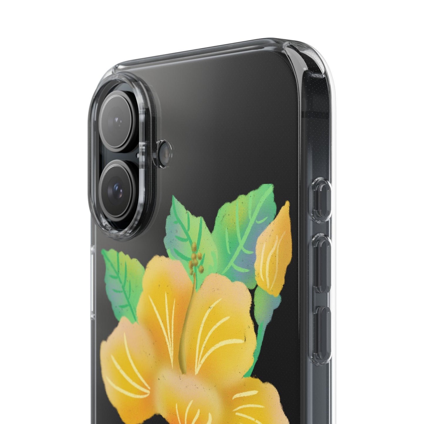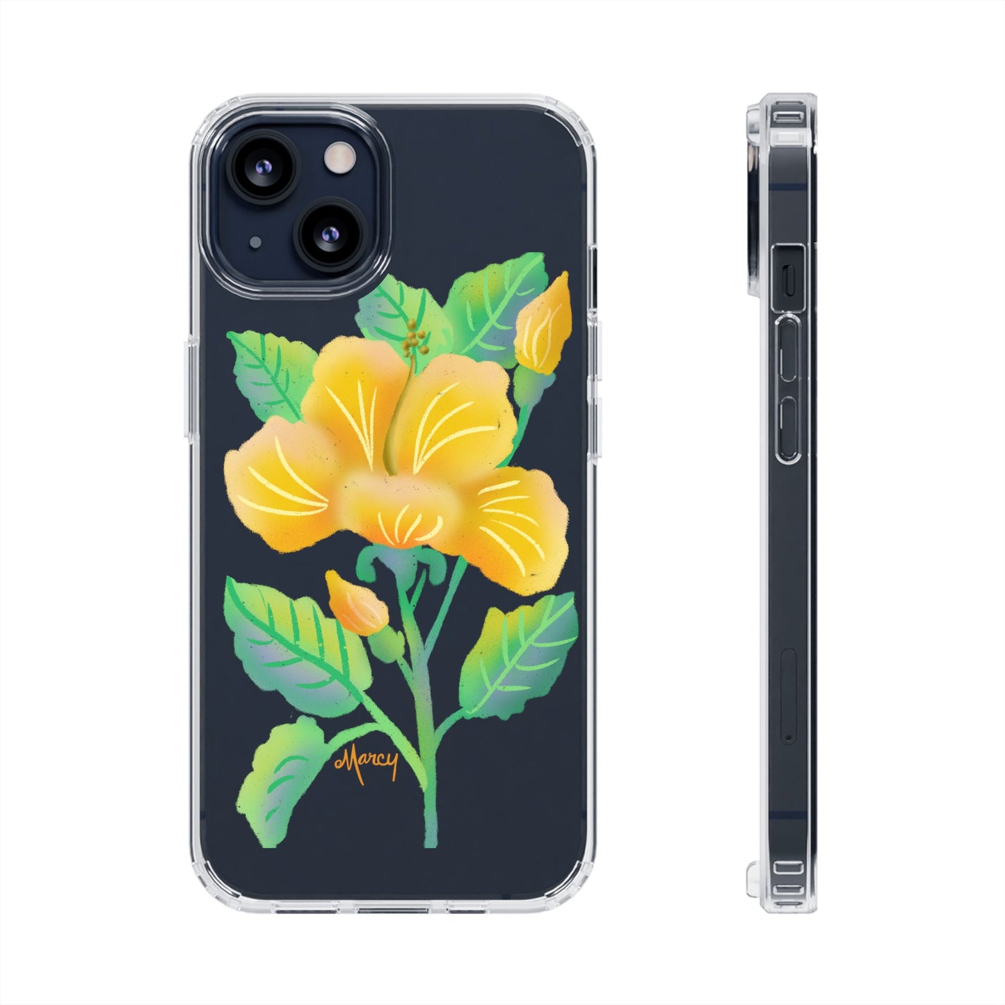 Bring the tropics to your everyday with this pretty yellow hibiscus blossom. This clear phone case comes to protect both your phone's surface and its aesthetics. The crystal clear polycarbonate case is flexible, crack and chip-resistant, as well as co-molded with TPU cushioned edges on the side. This gives protection against scratches and minor bumps while still keeping your phone's slim profile intact. Each case features open ports for hassle-free connectivity.