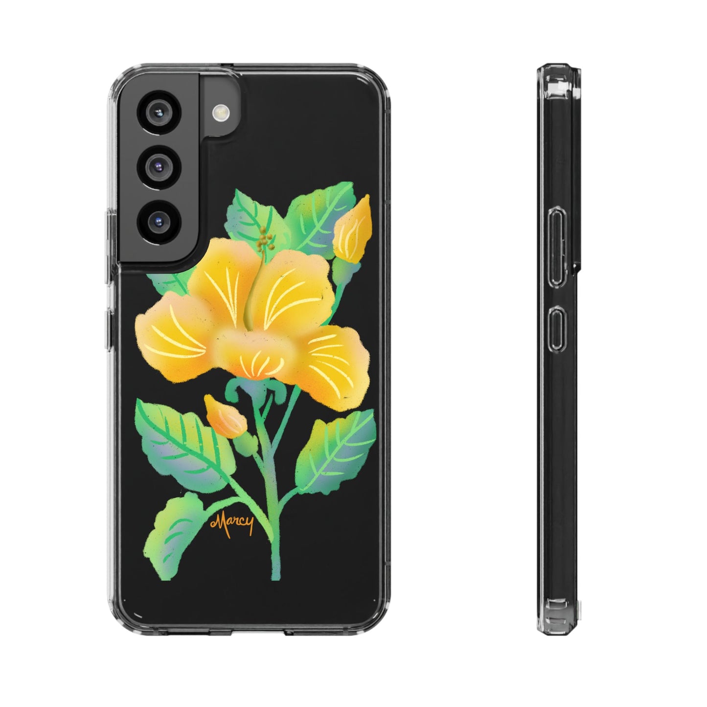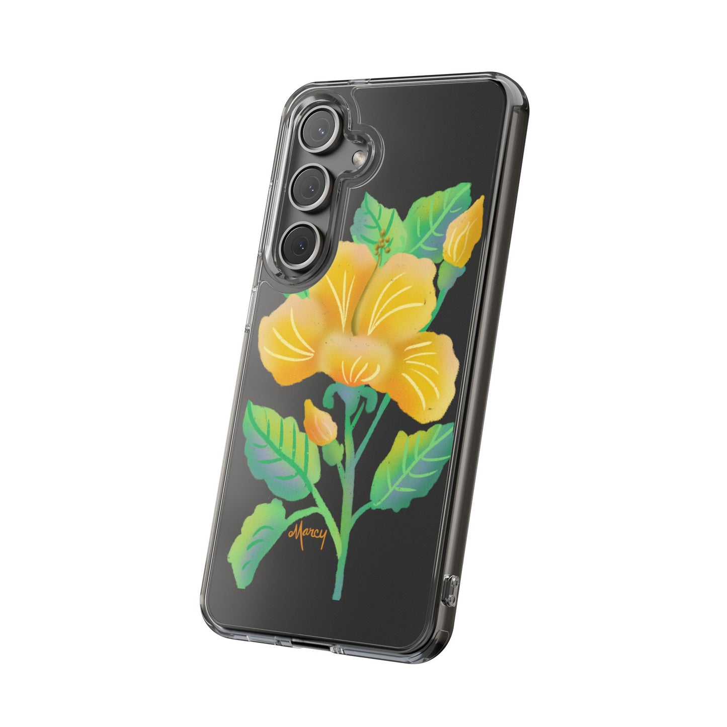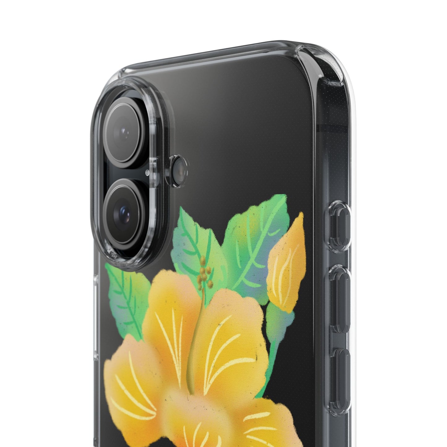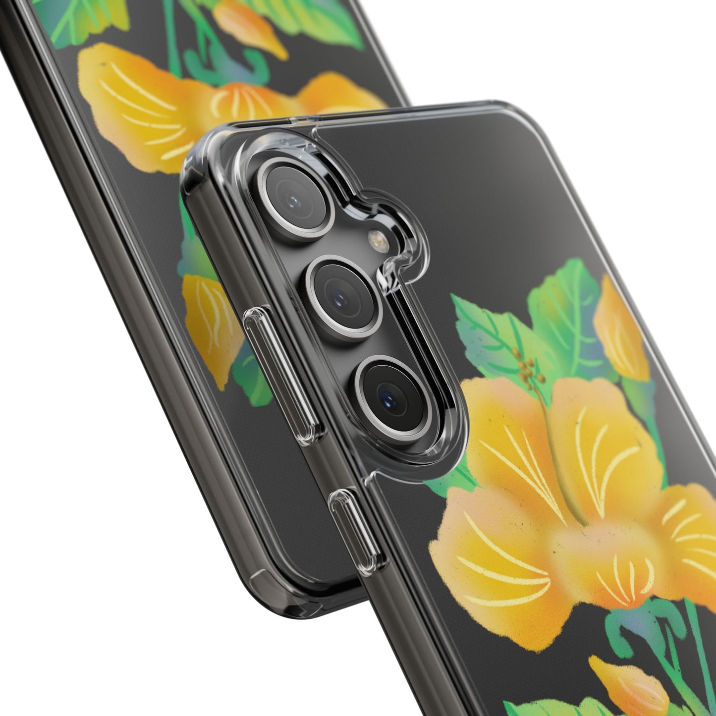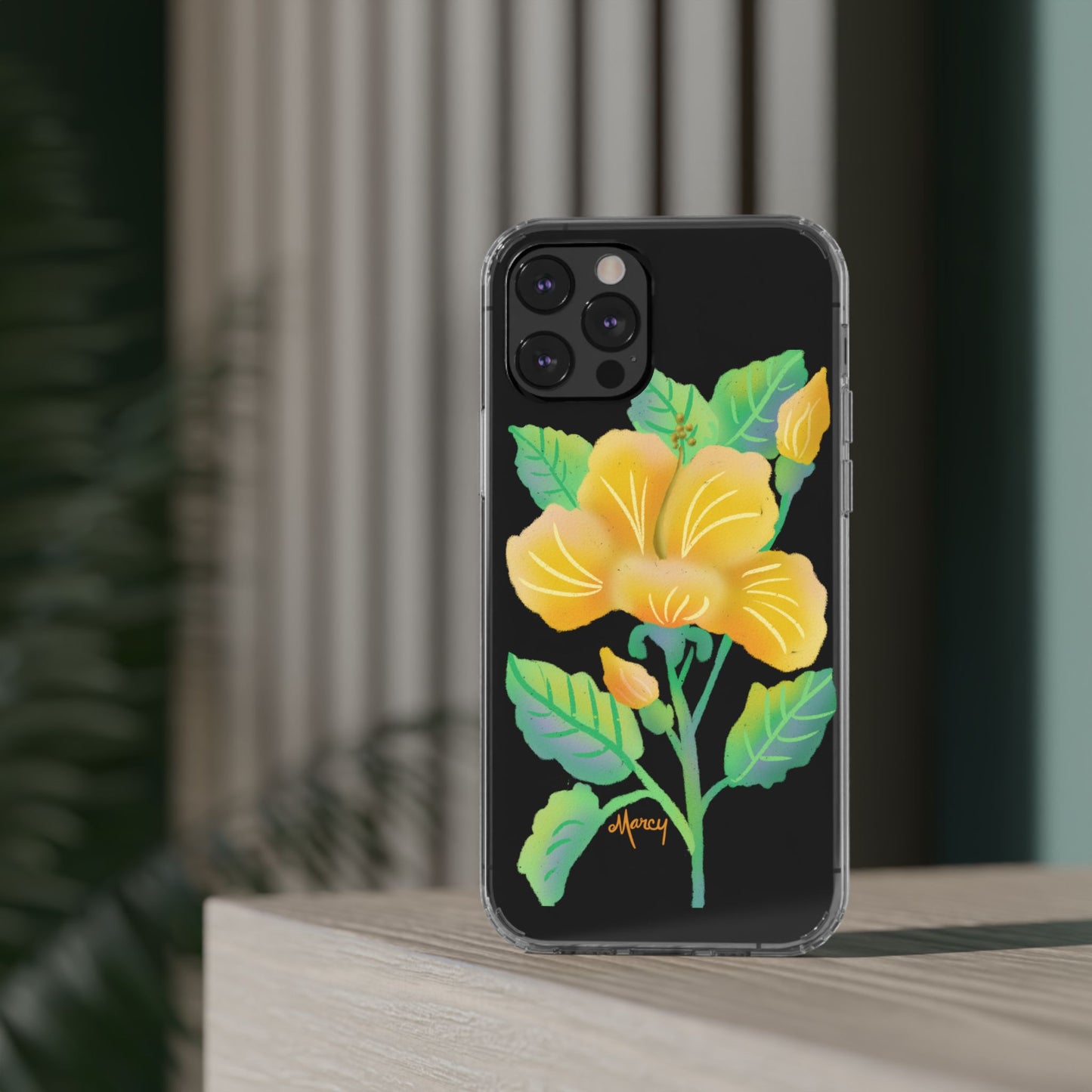 Bring the tropics to your everyday with this pretty yellow hibiscus blossom. This clear phone case comes to protect both your phone's surface and its aesthetics. The crystal clear polycarbonate case is flexible, crack and chip-resistant, as well as co-molded with TPU cushioned edges on the side. This gives protection against scratches and minor bumps while still keeping your phone's slim profile intact. Each case features open ports for hassle-free connectivity.