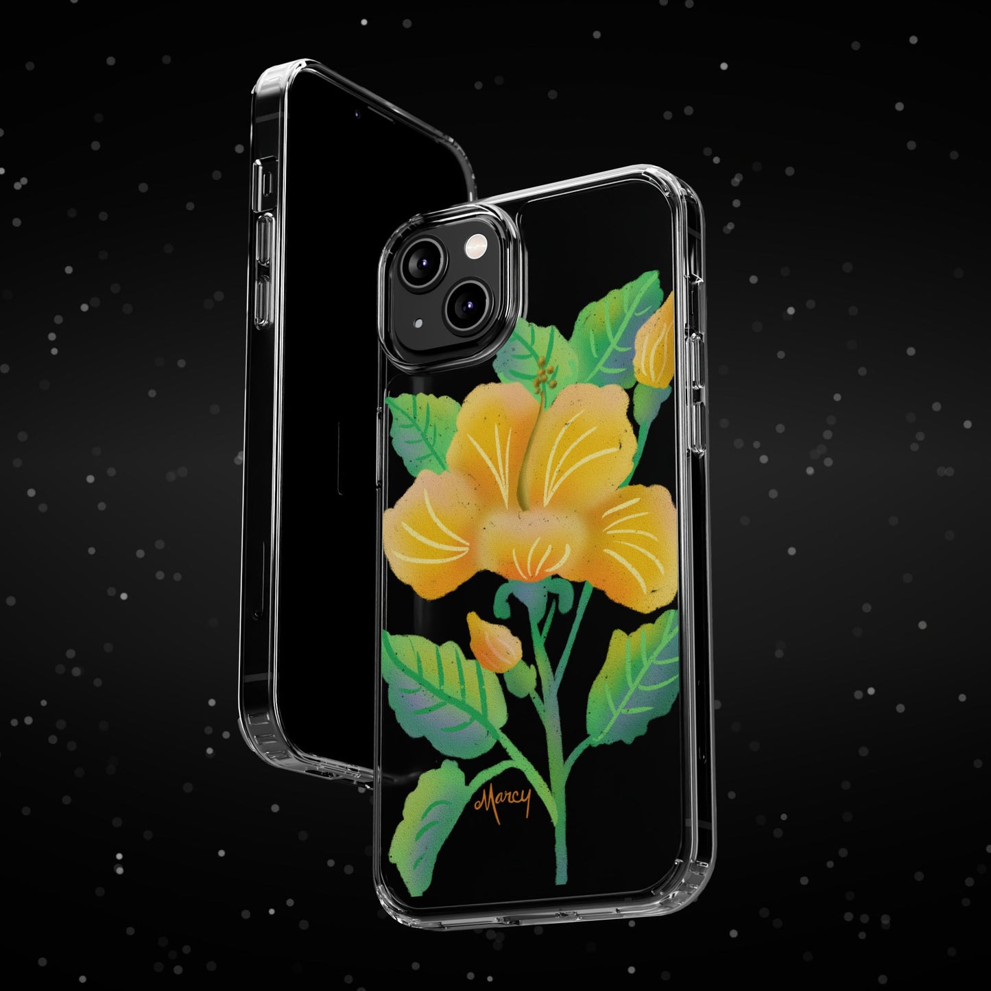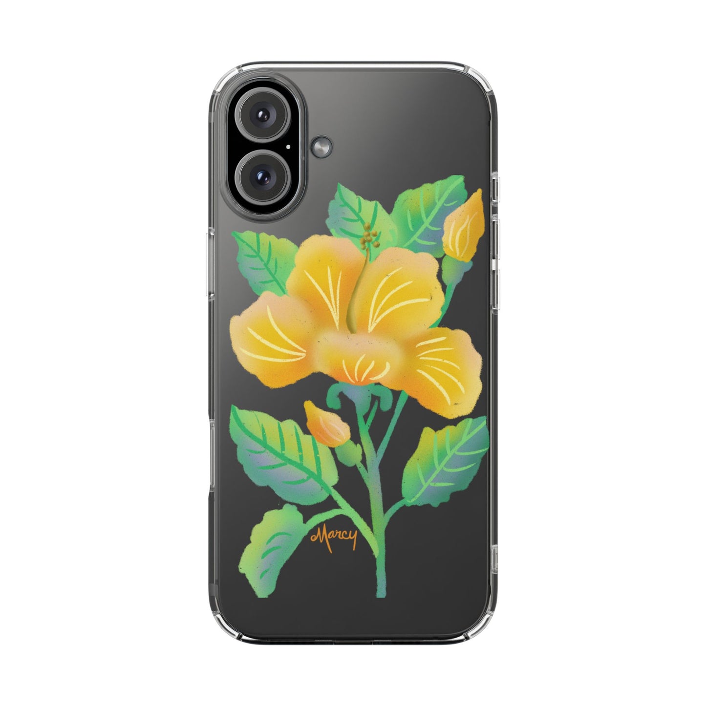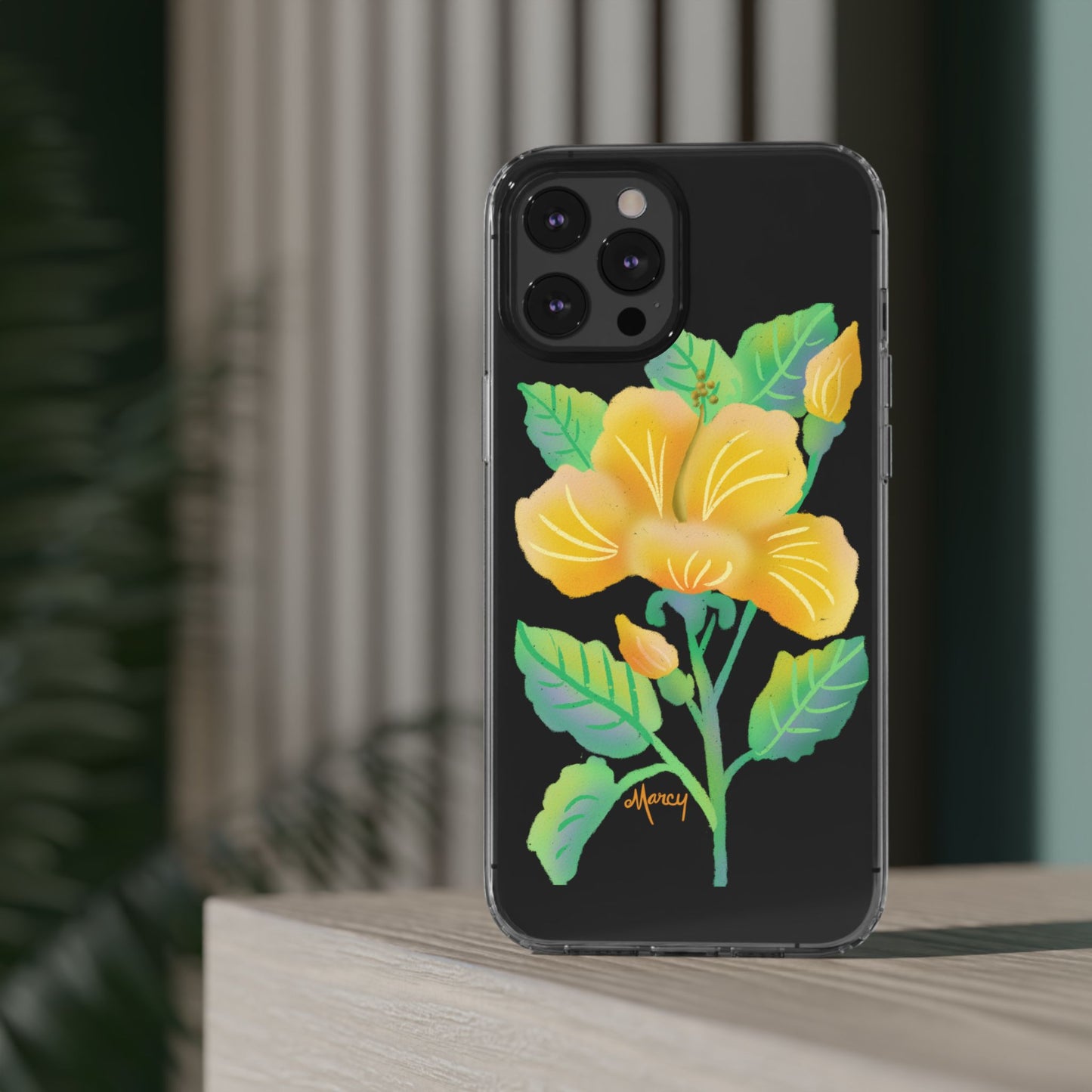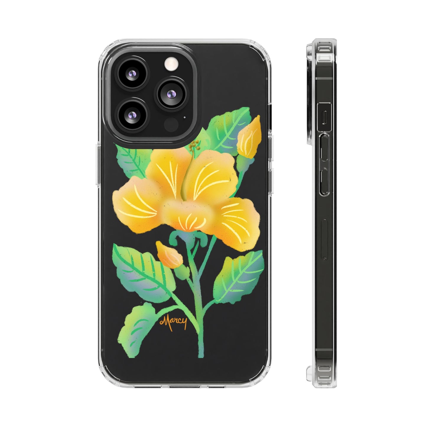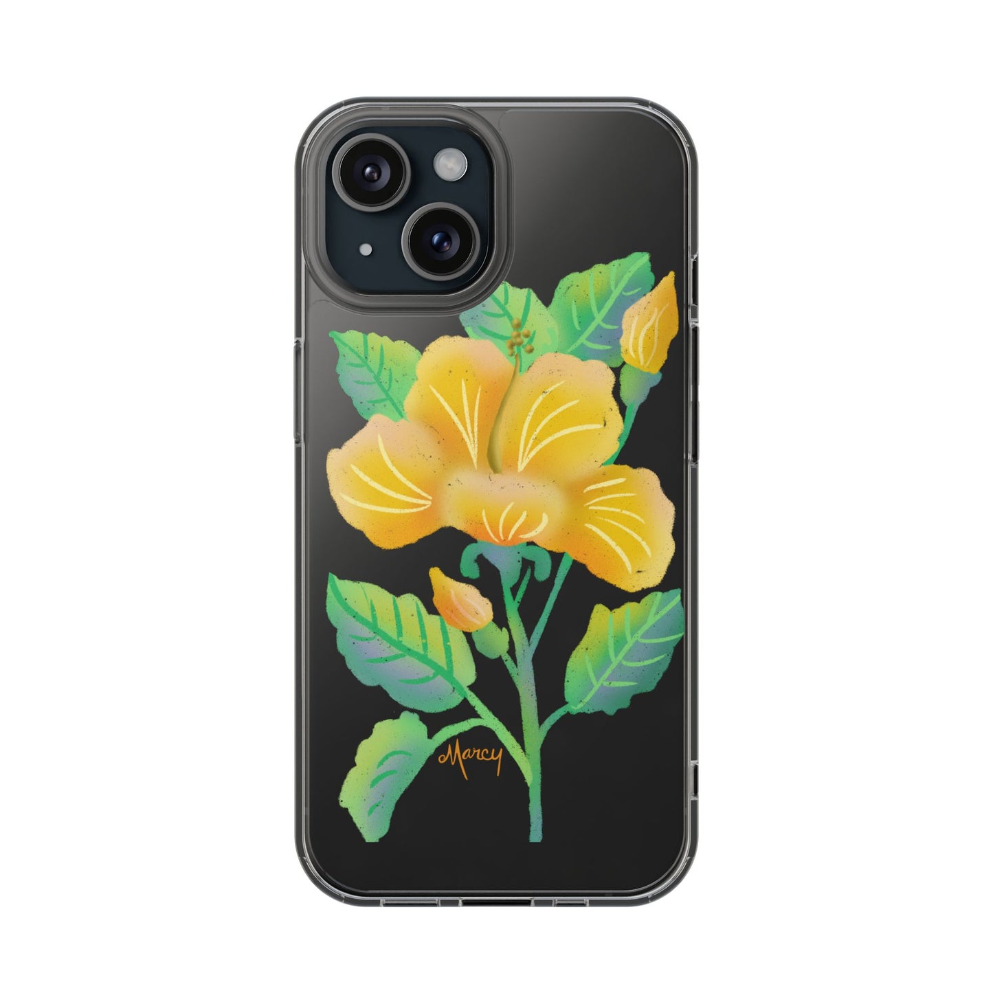 Bring the tropics to your everyday with this pretty yellow hibiscus blossom. This clear phone case comes to protect both your phone's surface and its aesthetics. The crystal clear polycarbonate case is flexible, crack and chip-resistant, as well as co-molded with TPU cushioned edges on the side. This gives protection against scratches and minor bumps while still keeping your phone's slim profile intact. Each case features open ports for hassle-free connectivity.