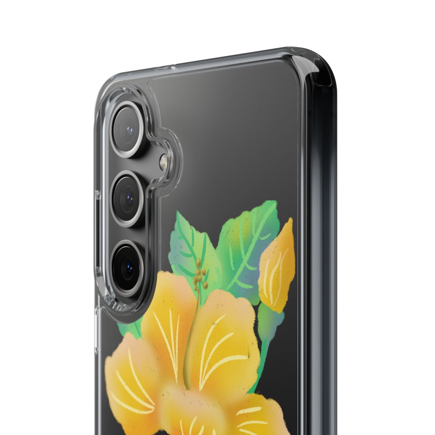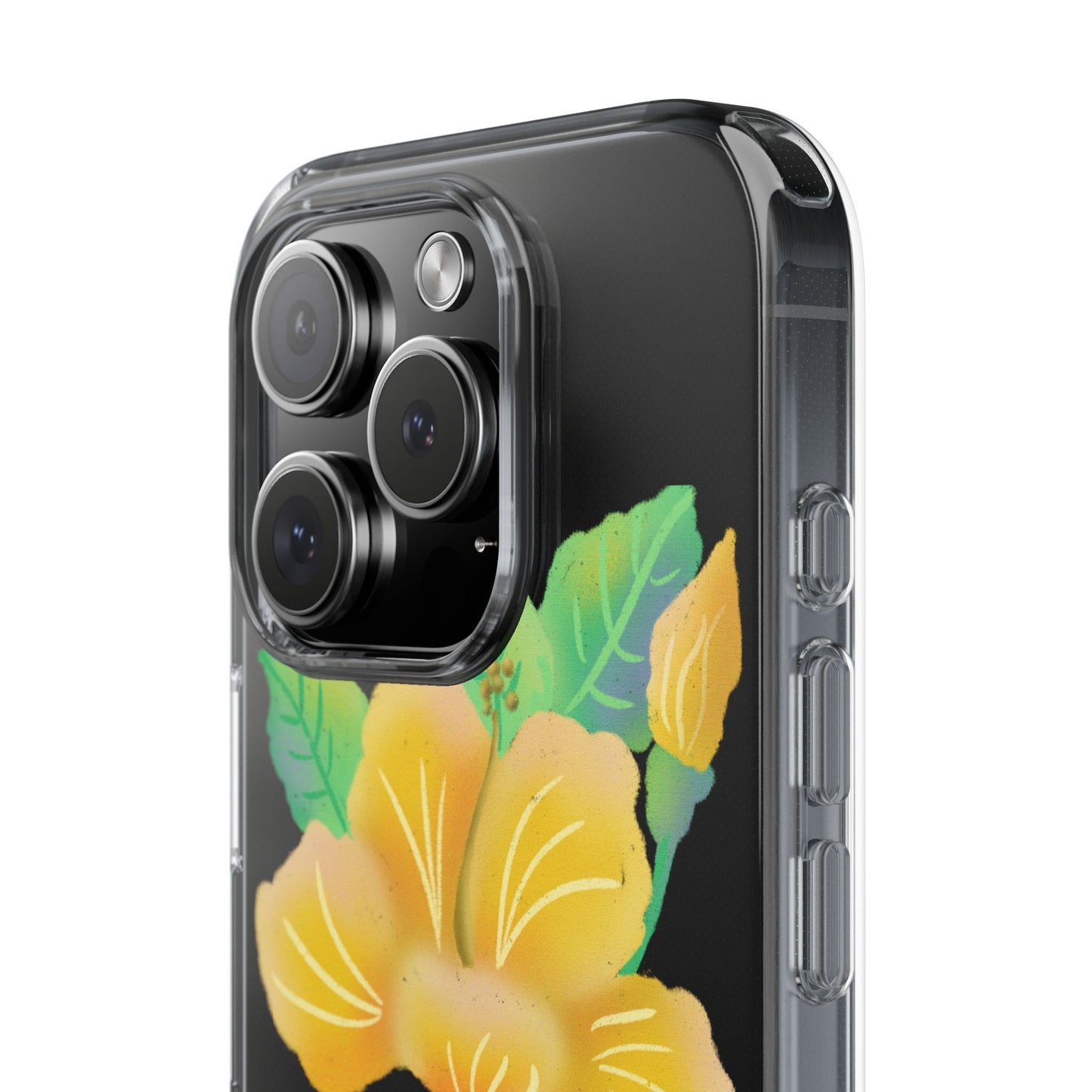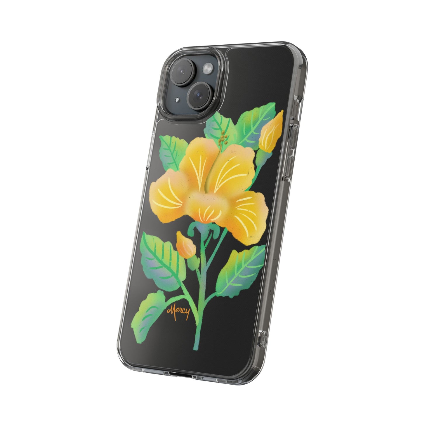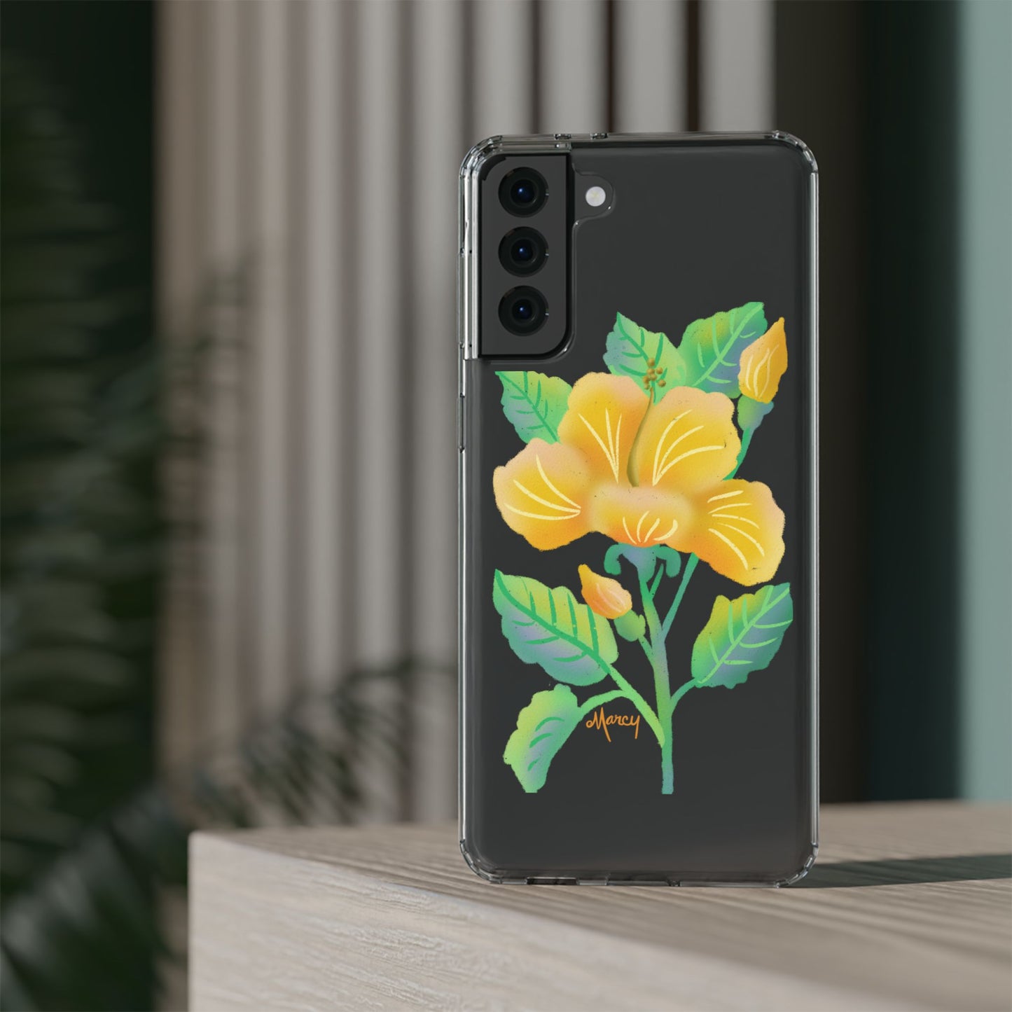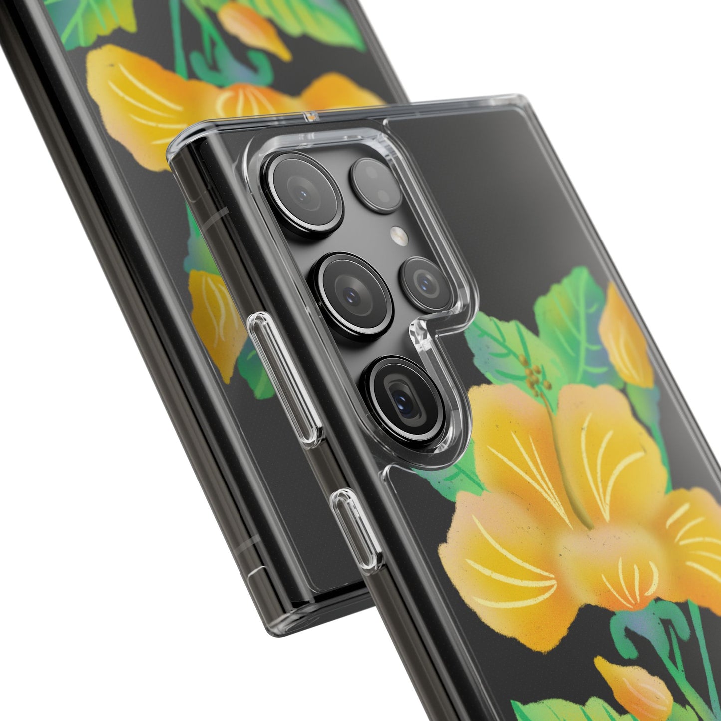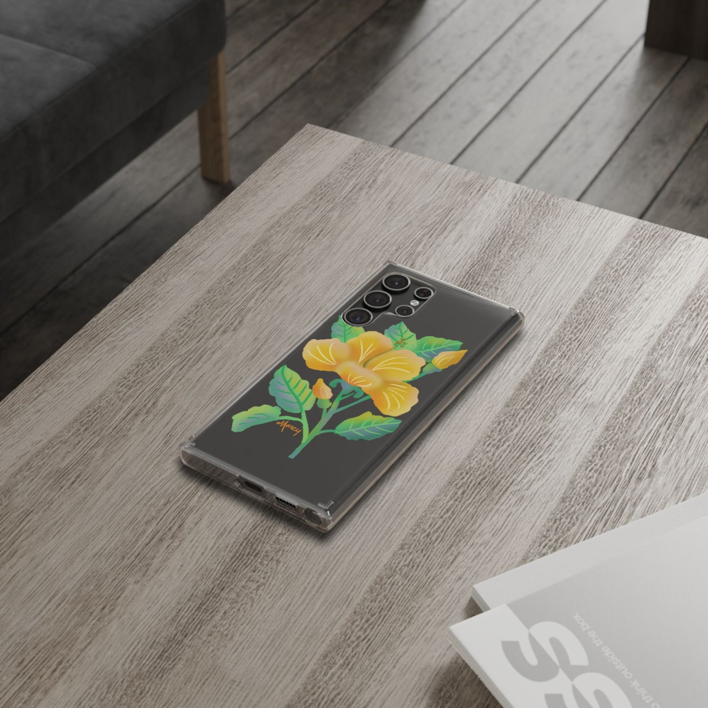 Bring the tropics to your everyday with this pretty yellow hibiscus blossom. This clear phone case comes to protect both your phone's surface and its aesthetics. The crystal clear polycarbonate case is flexible, crack and chip-resistant, as well as co-molded with TPU cushioned edges on the side. This gives protection against scratches and minor bumps while still keeping your phone's slim profile intact. Each case features open ports for hassle-free connectivity.