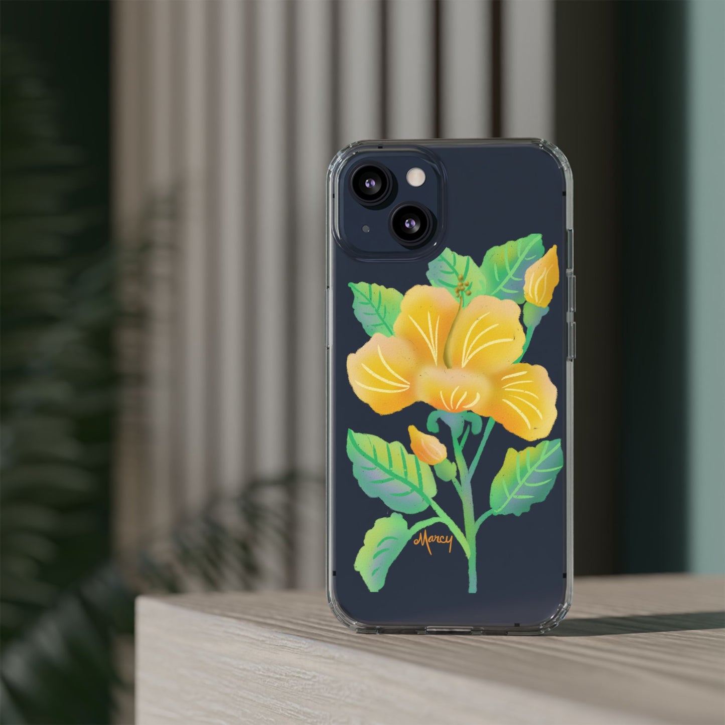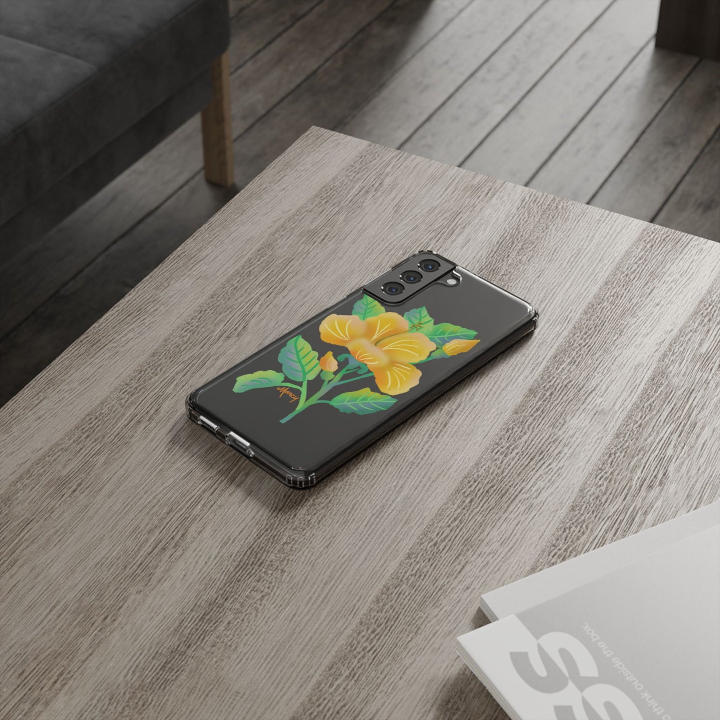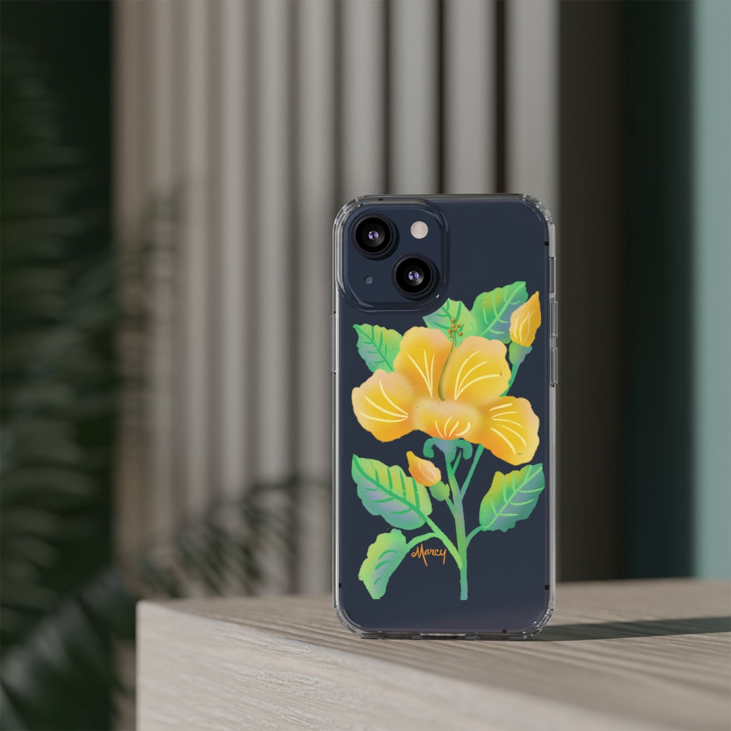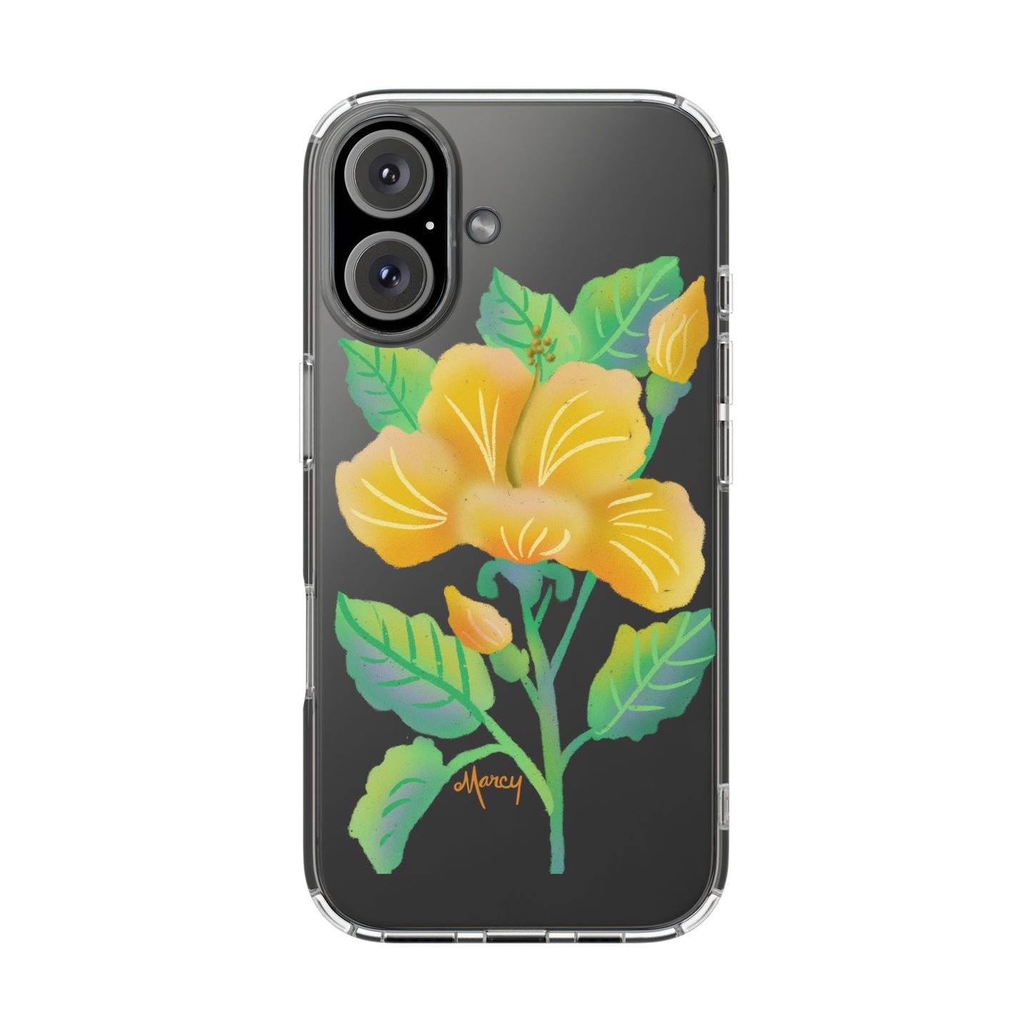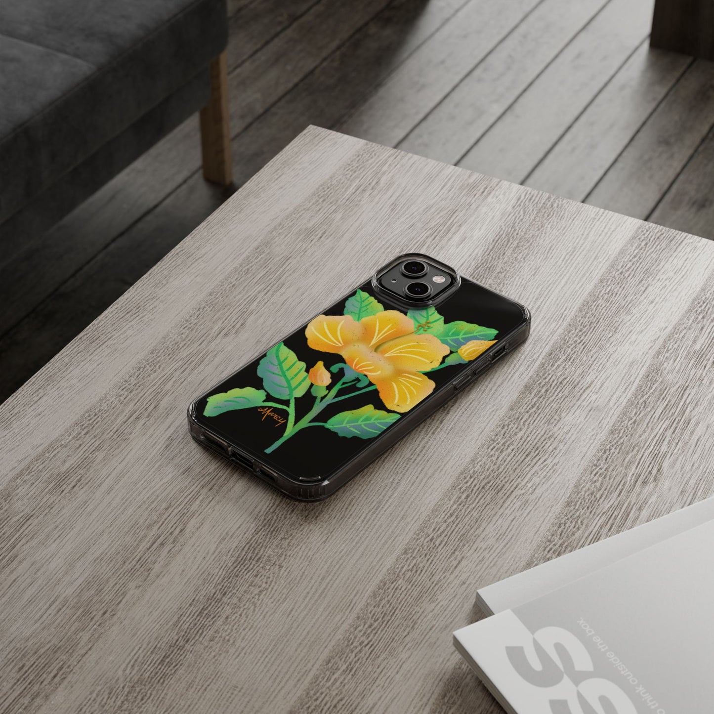 Bring the tropics to your everyday with this pretty yellow hibiscus blossom. This clear phone case comes to protect both your phone's surface and its aesthetics. The crystal clear polycarbonate case is flexible, crack and chip-resistant, as well as co-molded with TPU cushioned edges on the side. This gives protection against scratches and minor bumps while still keeping your phone's slim profile intact. Each case features open ports for hassle-free connectivity.