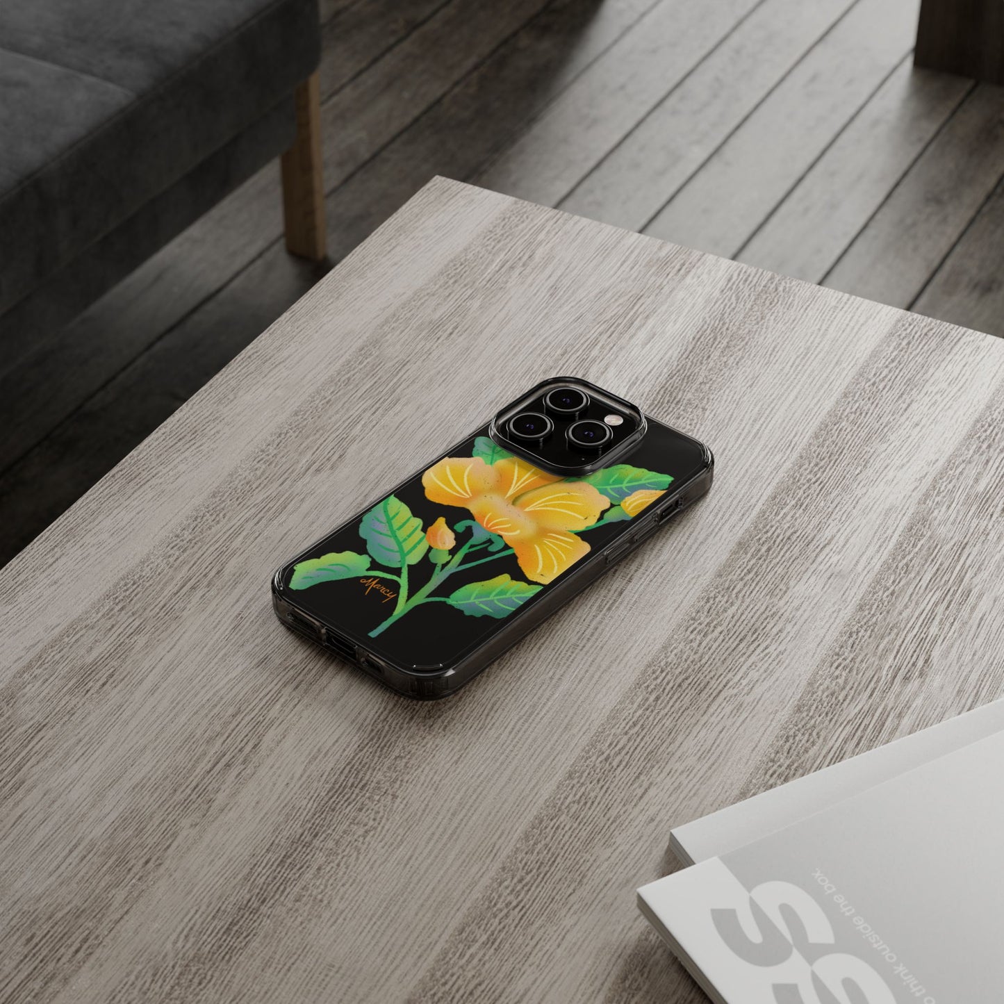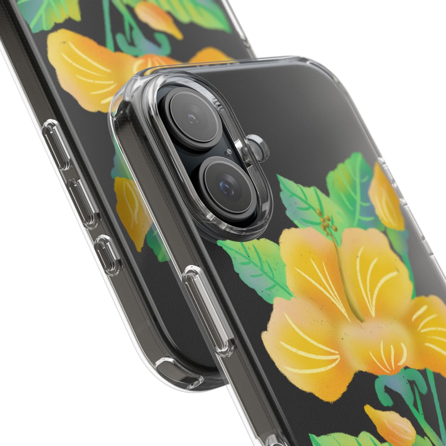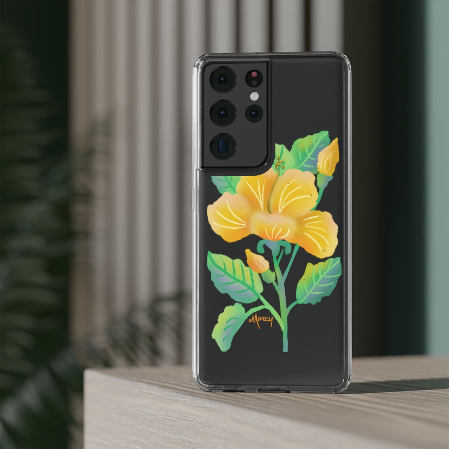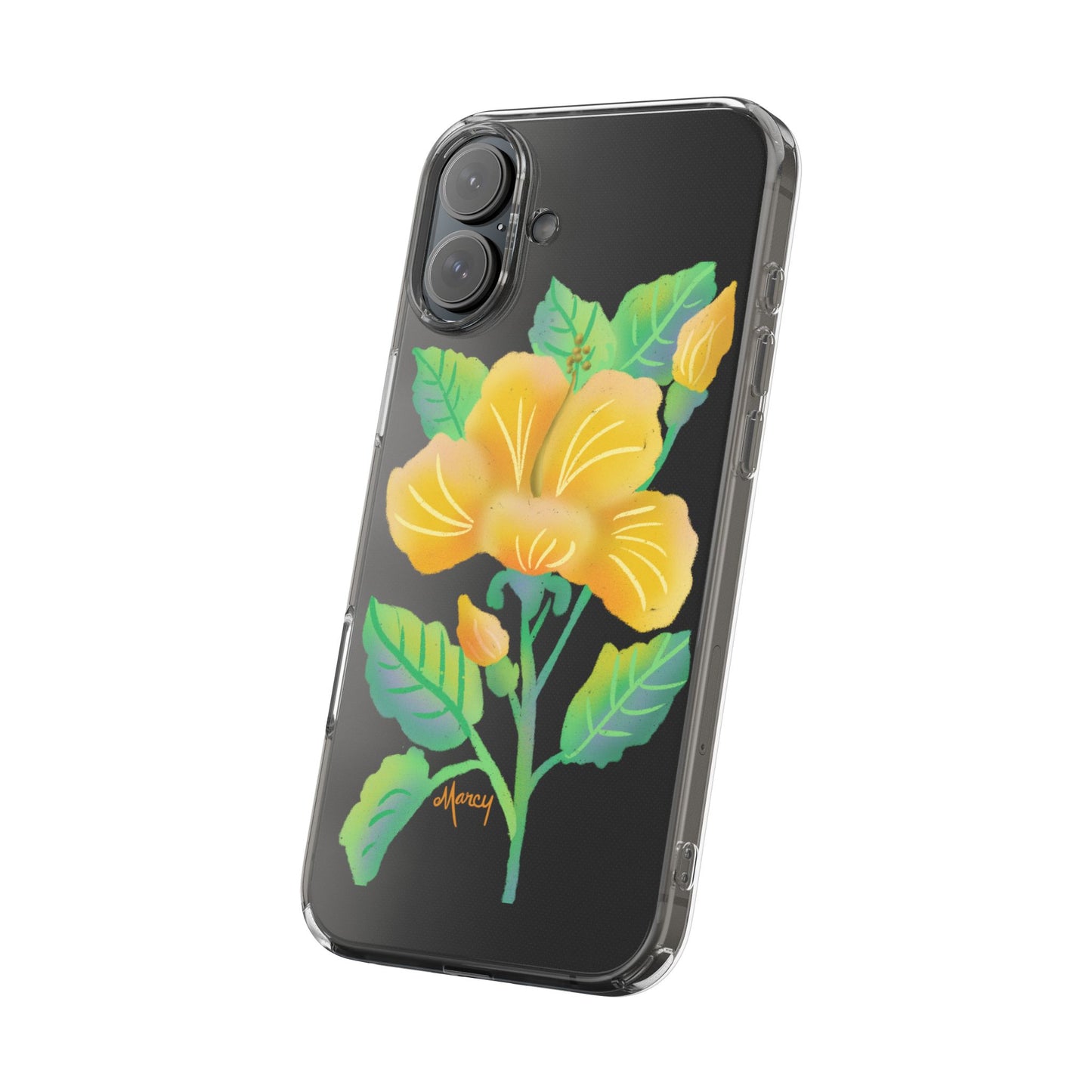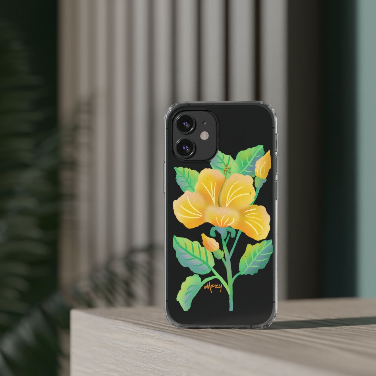 Bring the tropics to your everyday with this pretty yellow hibiscus blossom. This clear phone case comes to protect both your phone's surface and its aesthetics. The crystal clear polycarbonate case is flexible, crack and chip-resistant, as well as co-molded with TPU cushioned edges on the side. This gives protection against scratches and minor bumps while still keeping your phone's slim profile intact. Each case features open ports for hassle-free connectivity.