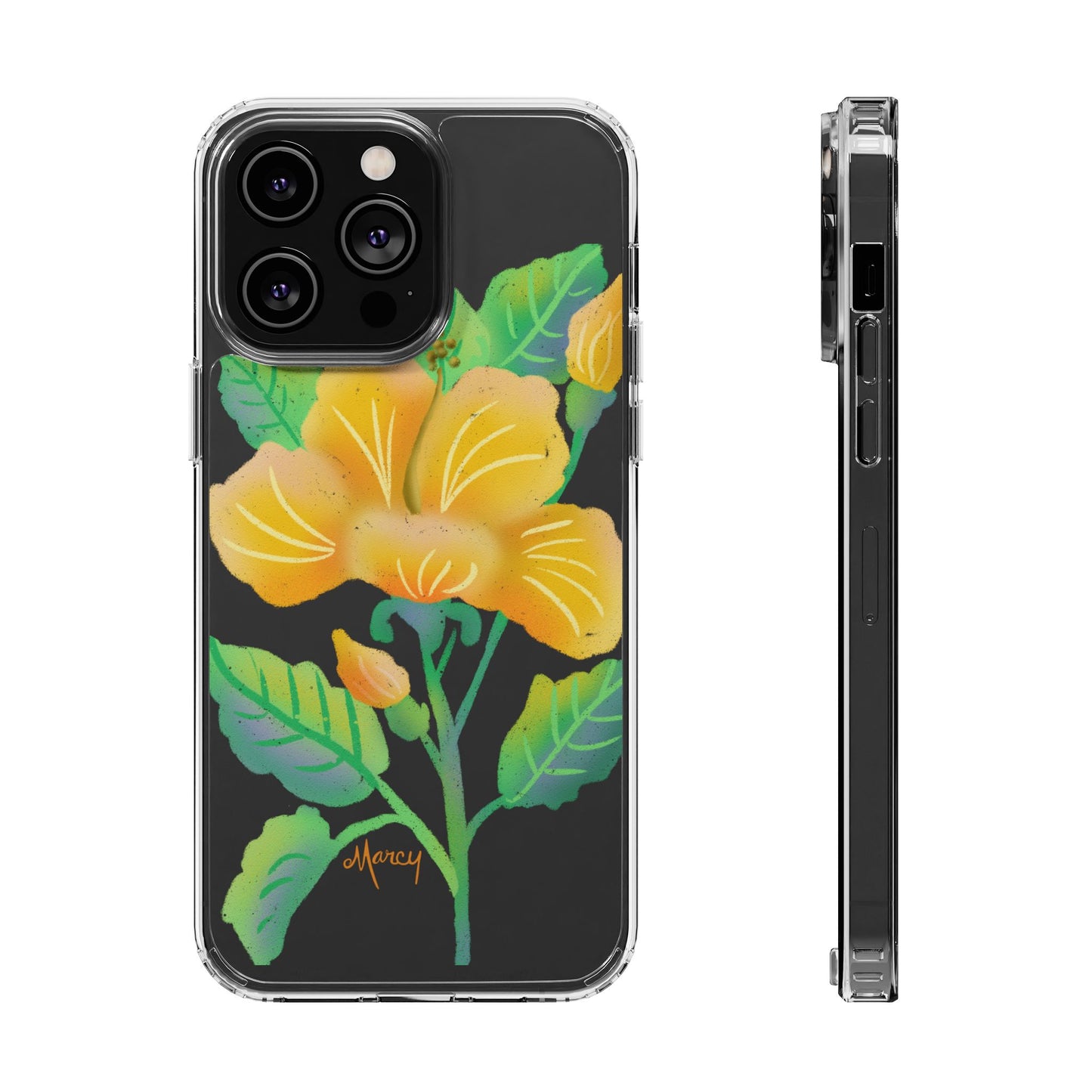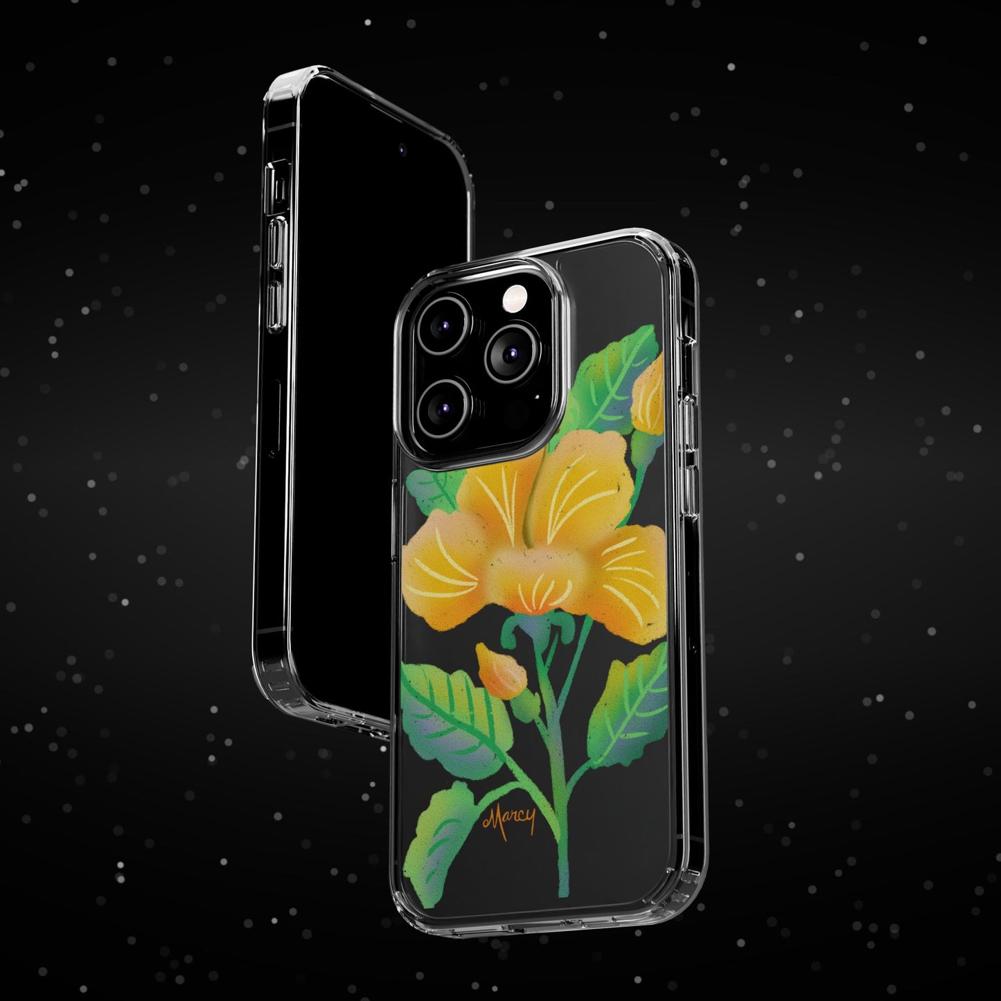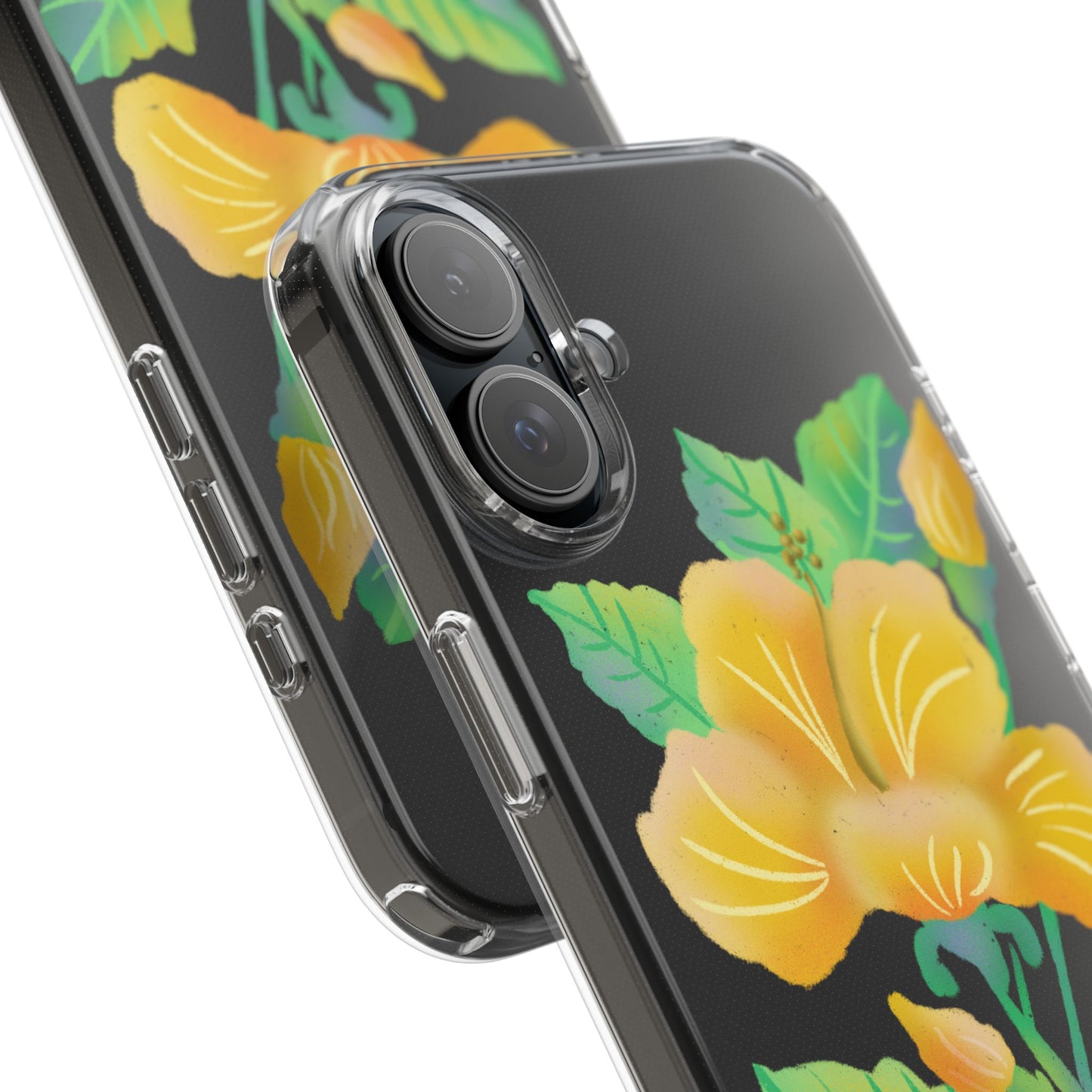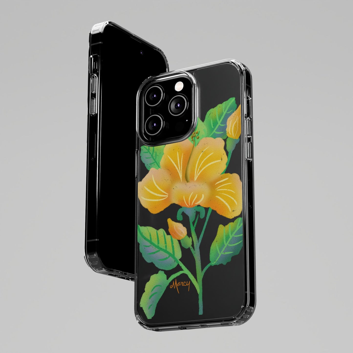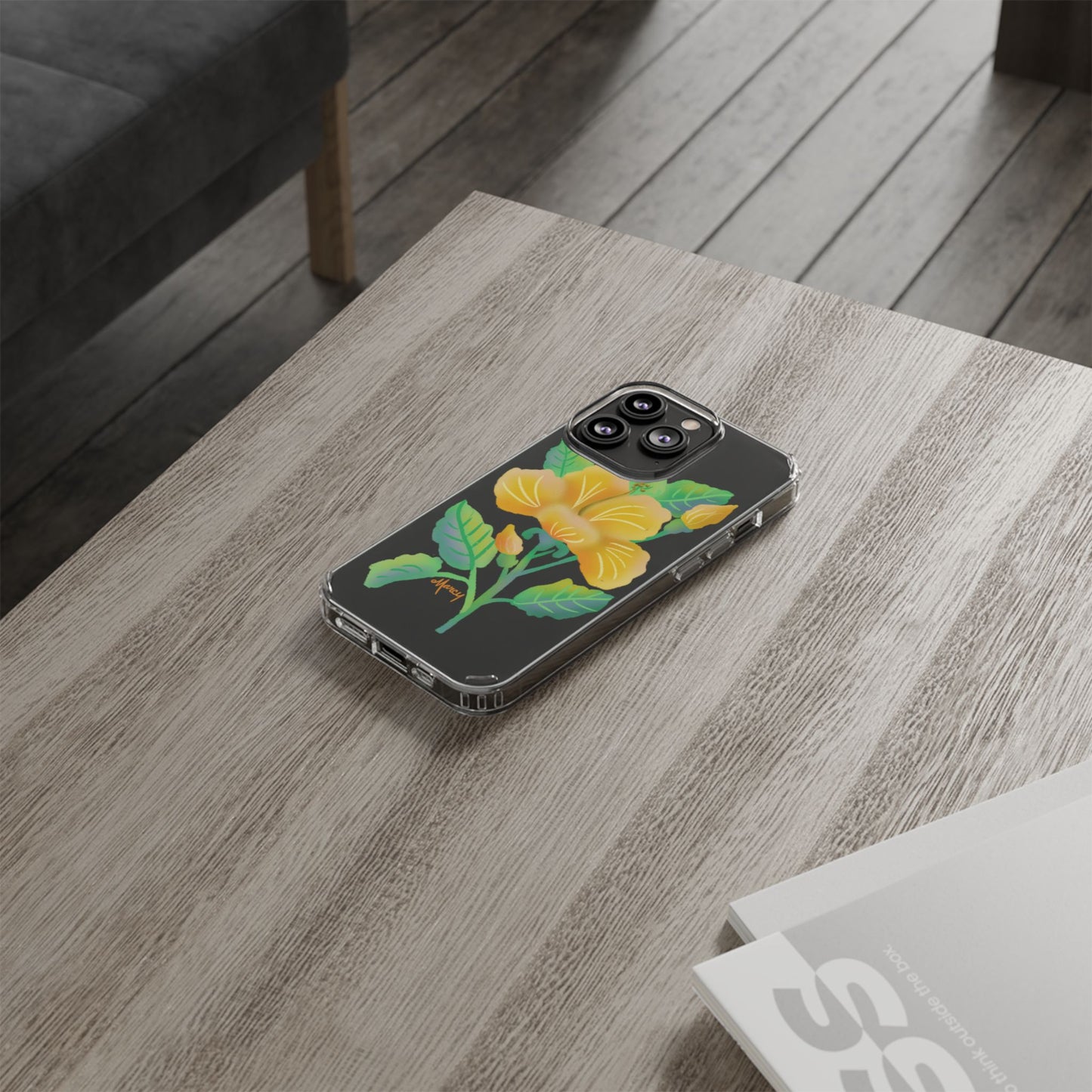 Bring the tropics to your everyday with this pretty yellow hibiscus blossom. This clear phone case comes to protect both your phone's surface and its aesthetics. The crystal clear polycarbonate case is flexible, crack and chip-resistant, as well as co-molded with TPU cushioned edges on the side. This gives protection against scratches and minor bumps while still keeping your phone's slim profile intact. Each case features open ports for hassle-free connectivity.