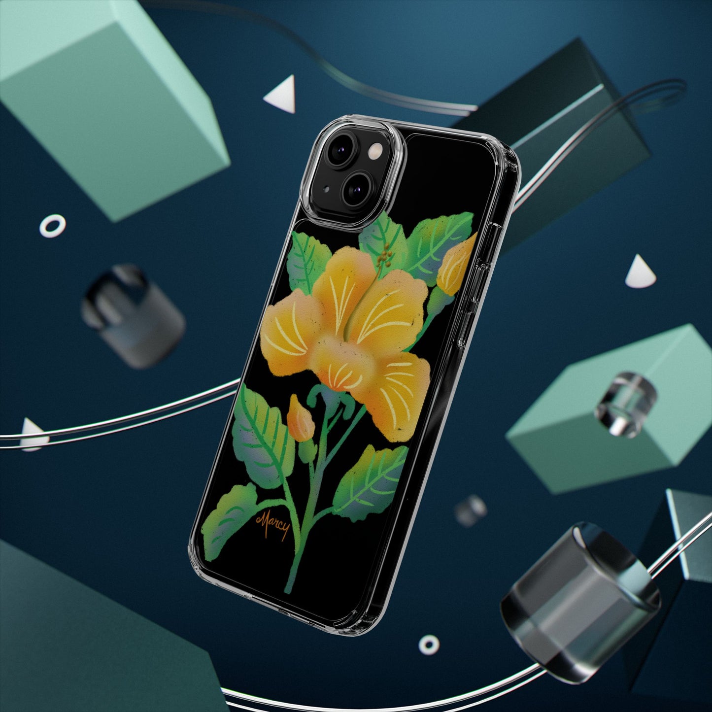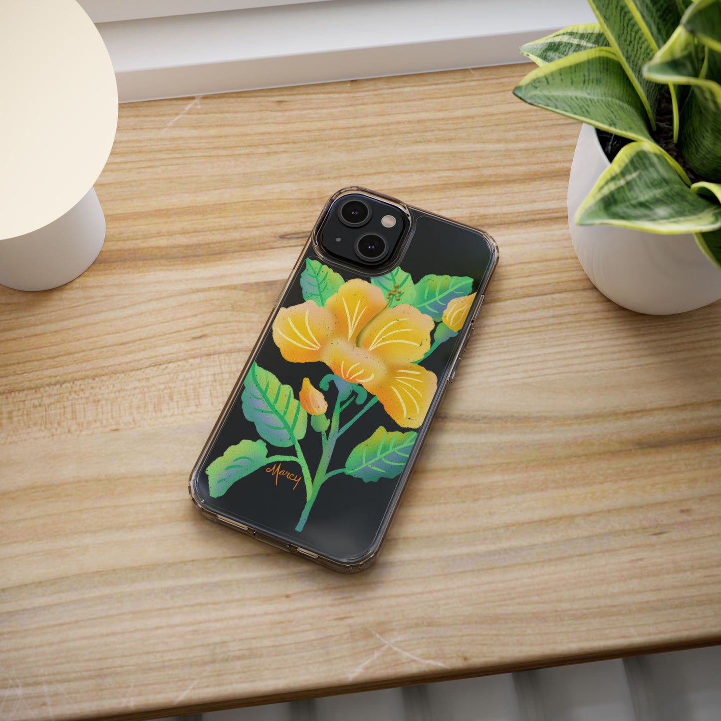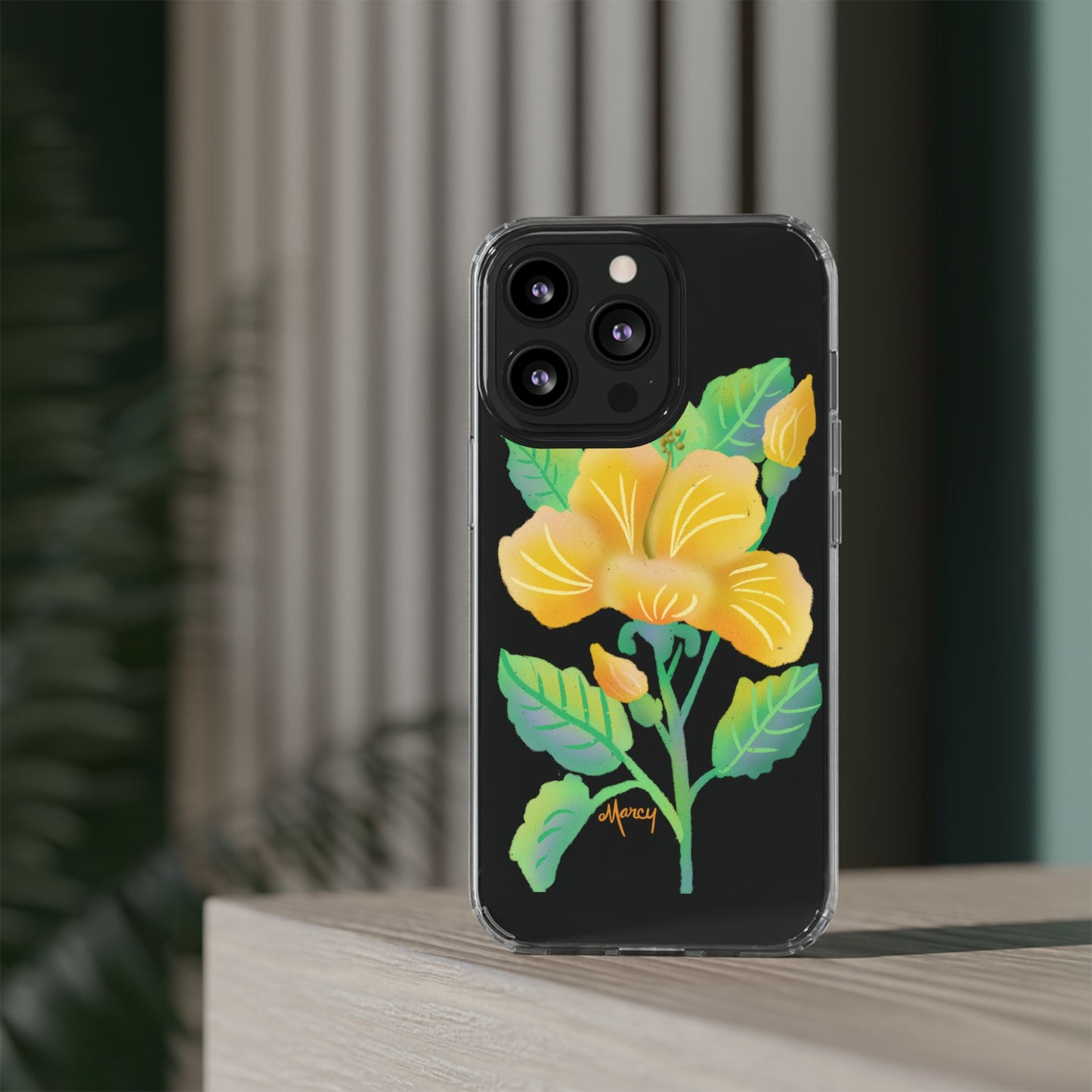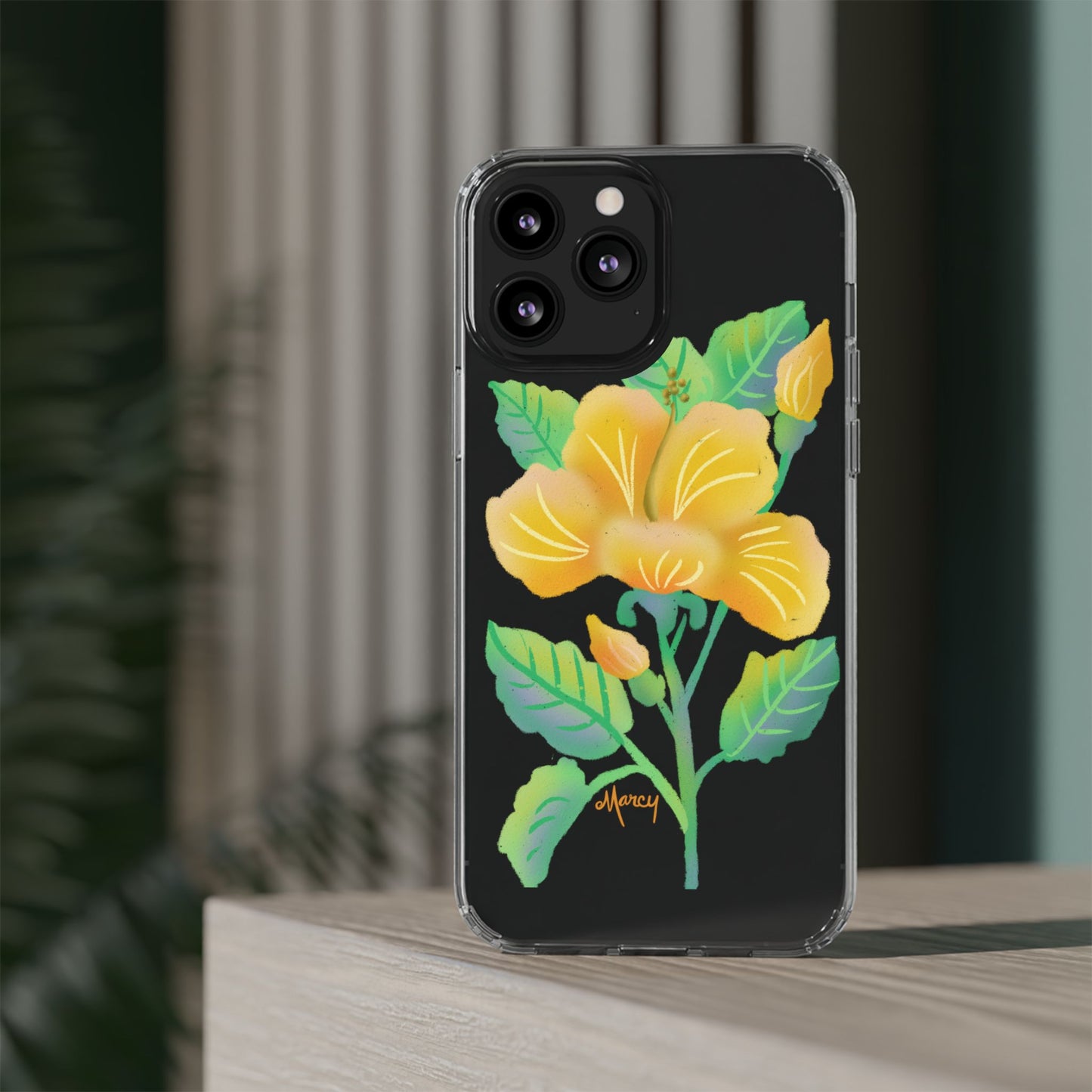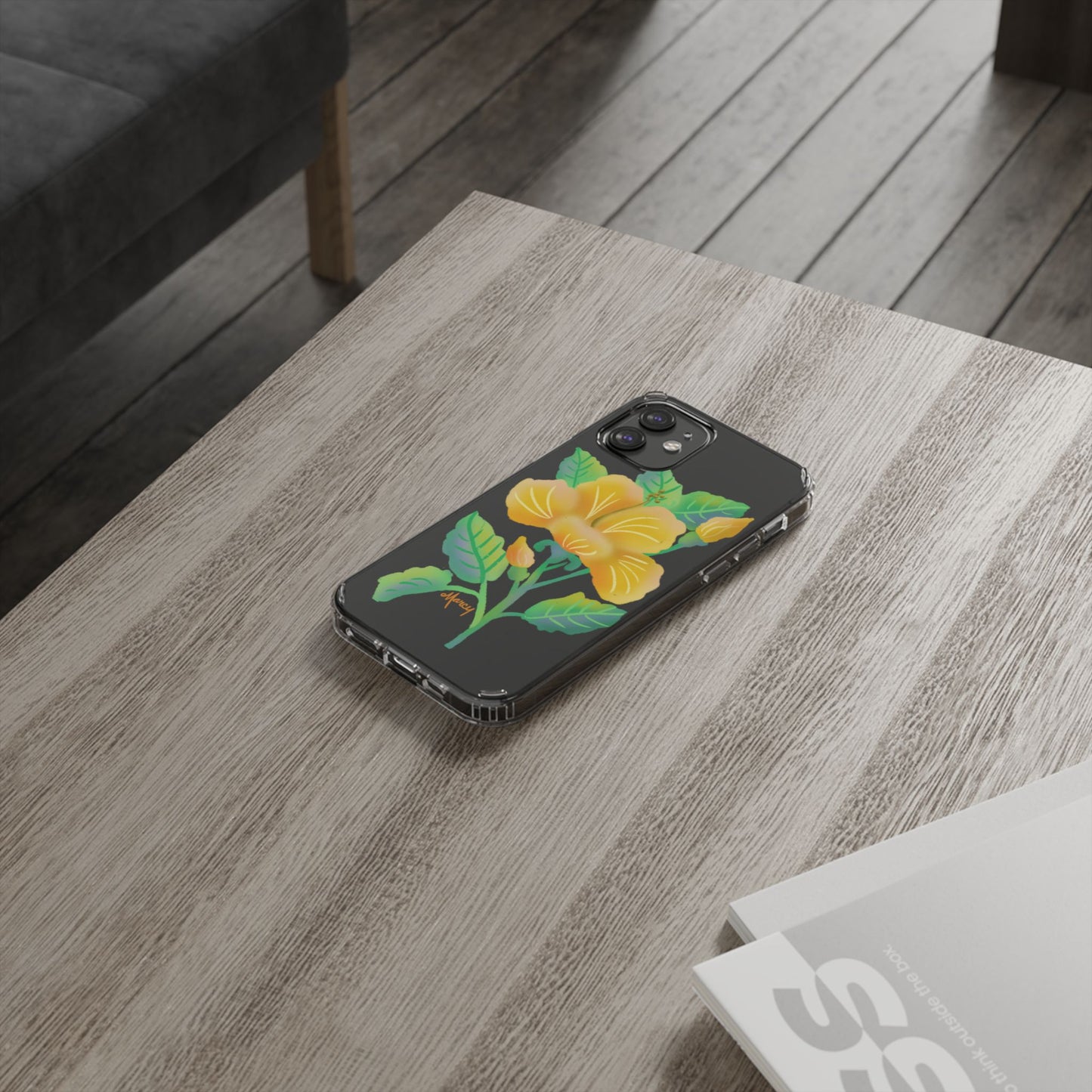 Bring the tropics to your everyday with this pretty yellow hibiscus blossom. This clear phone case comes to protect both your phone's surface and its aesthetics. The crystal clear polycarbonate case is flexible, crack and chip-resistant, as well as co-molded with TPU cushioned edges on the side. This gives protection against scratches and minor bumps while still keeping your phone's slim profile intact. Each case features open ports for hassle-free connectivity.