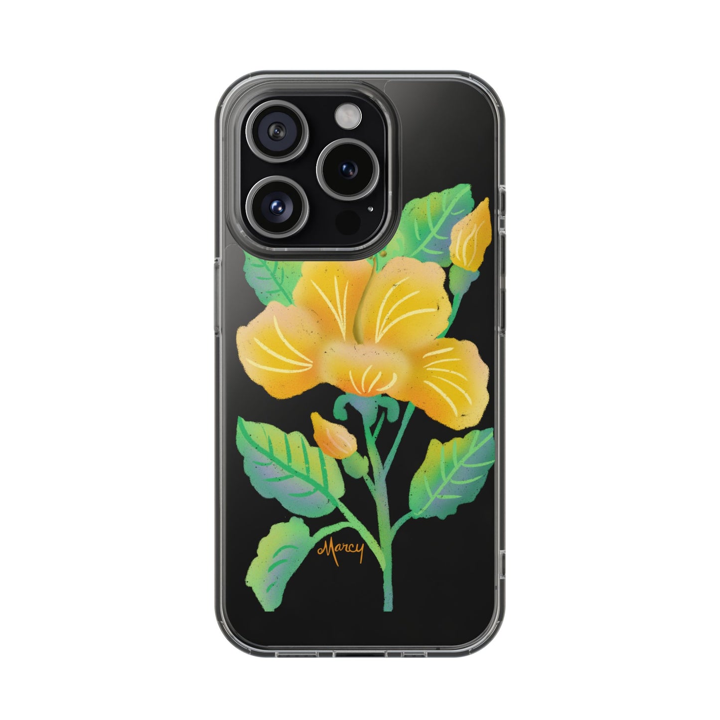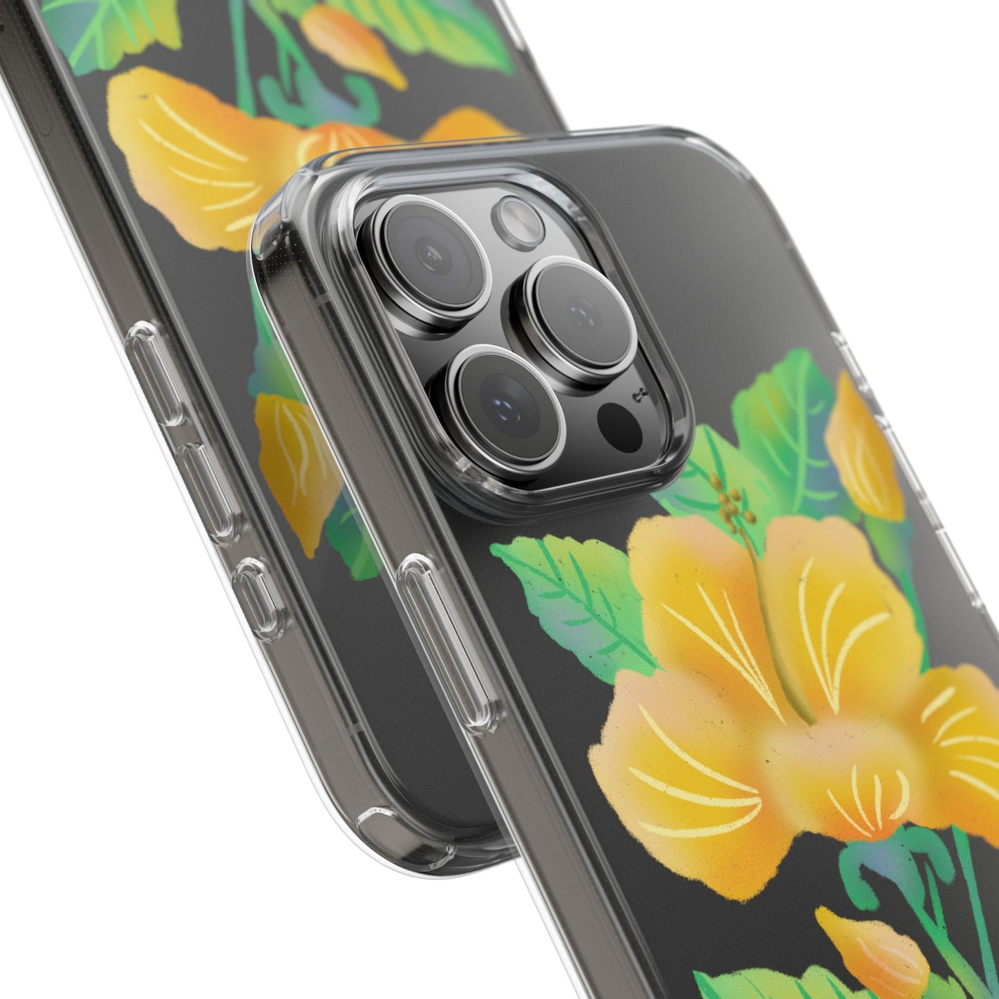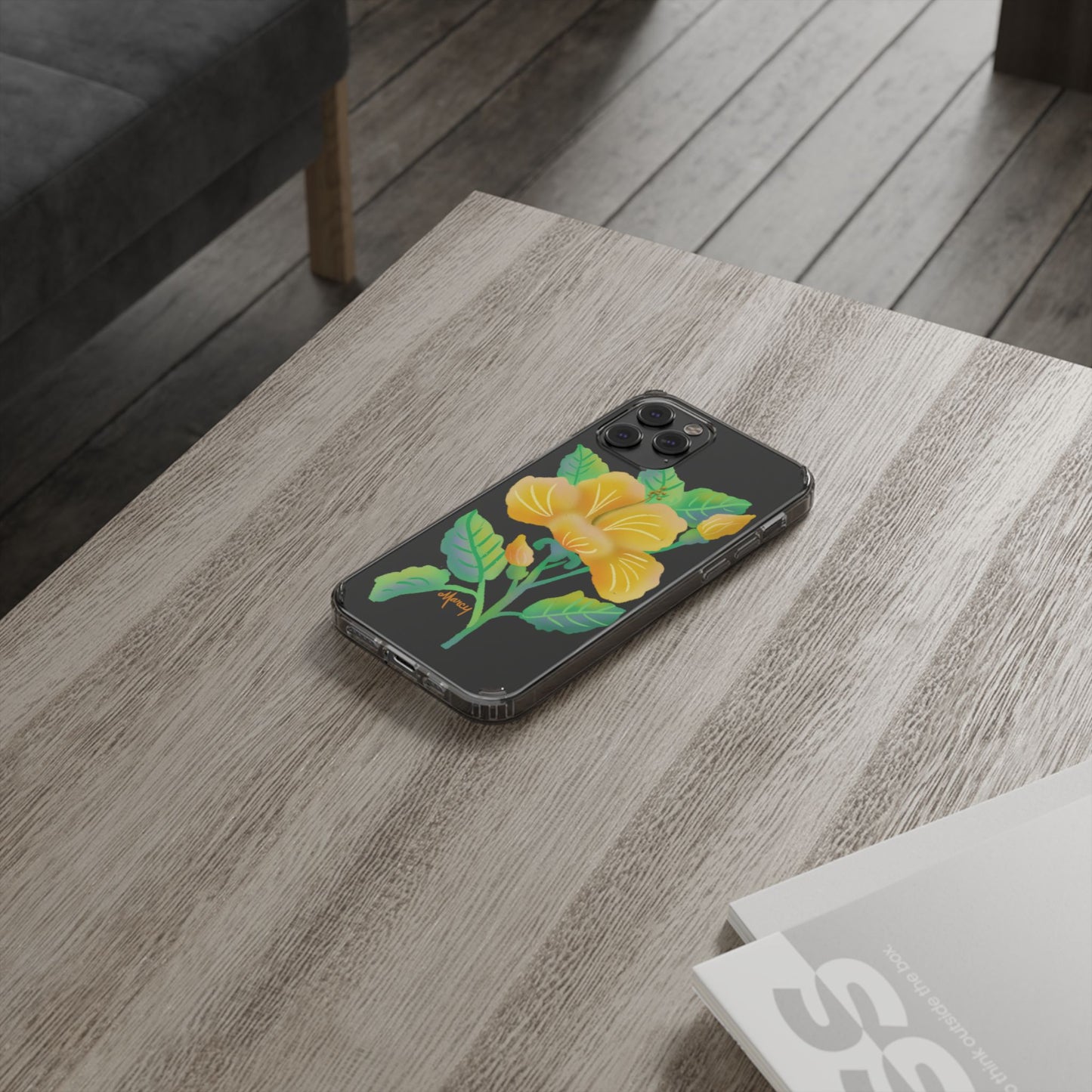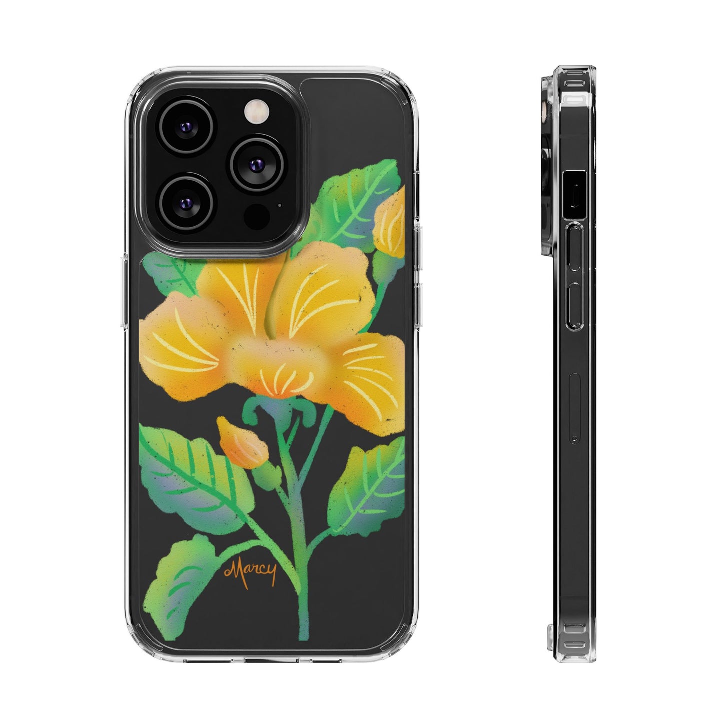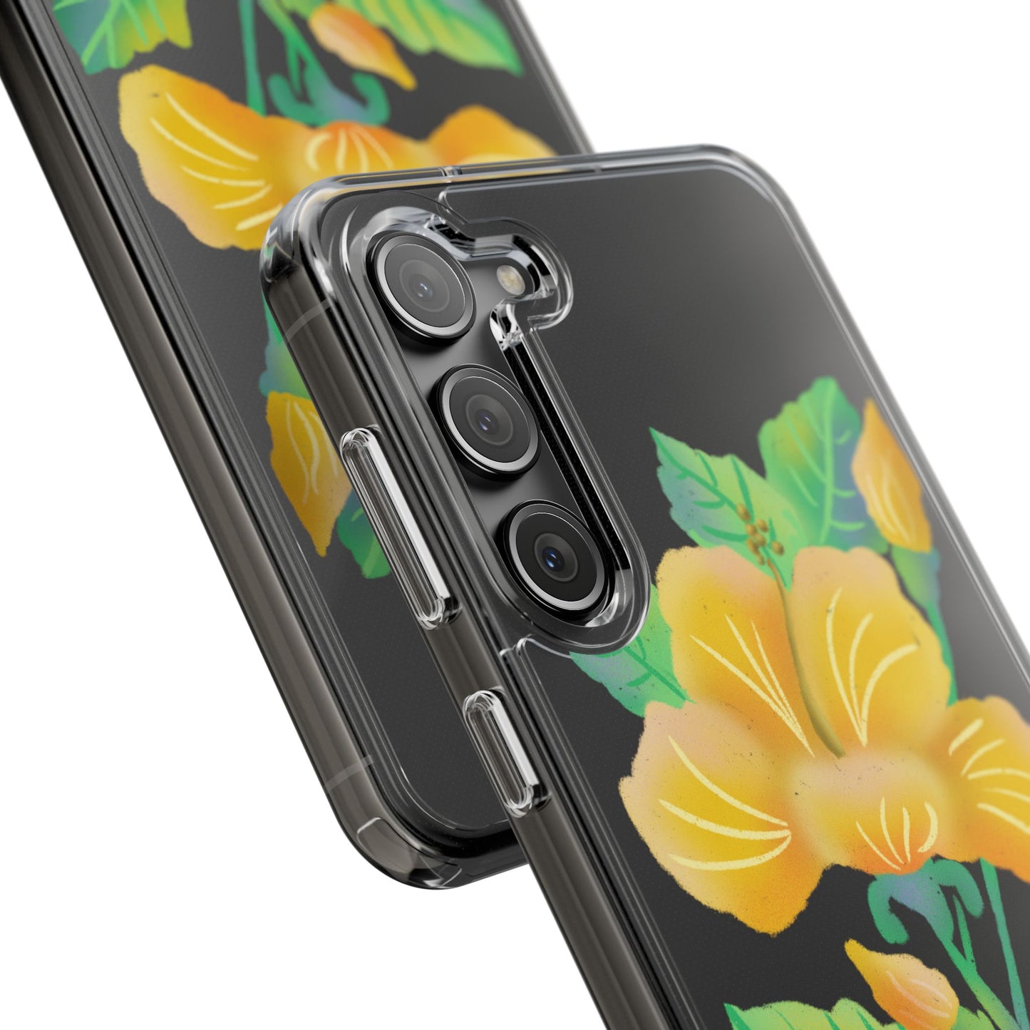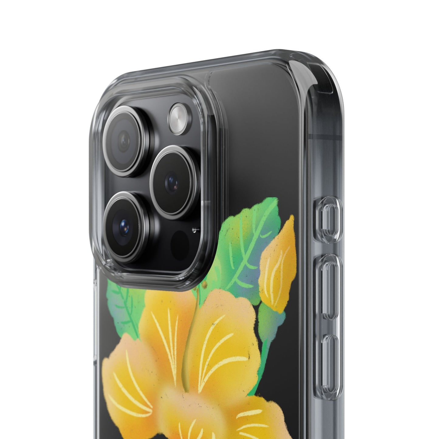 Bring the tropics to your everyday with this pretty yellow hibiscus blossom. This clear phone case comes to protect both your phone's surface and its aesthetics. The crystal clear polycarbonate case is flexible, crack and chip-resistant, as well as co-molded with TPU cushioned edges on the side. This gives protection against scratches and minor bumps while still keeping your phone's slim profile intact. Each case features open ports for hassle-free connectivity.